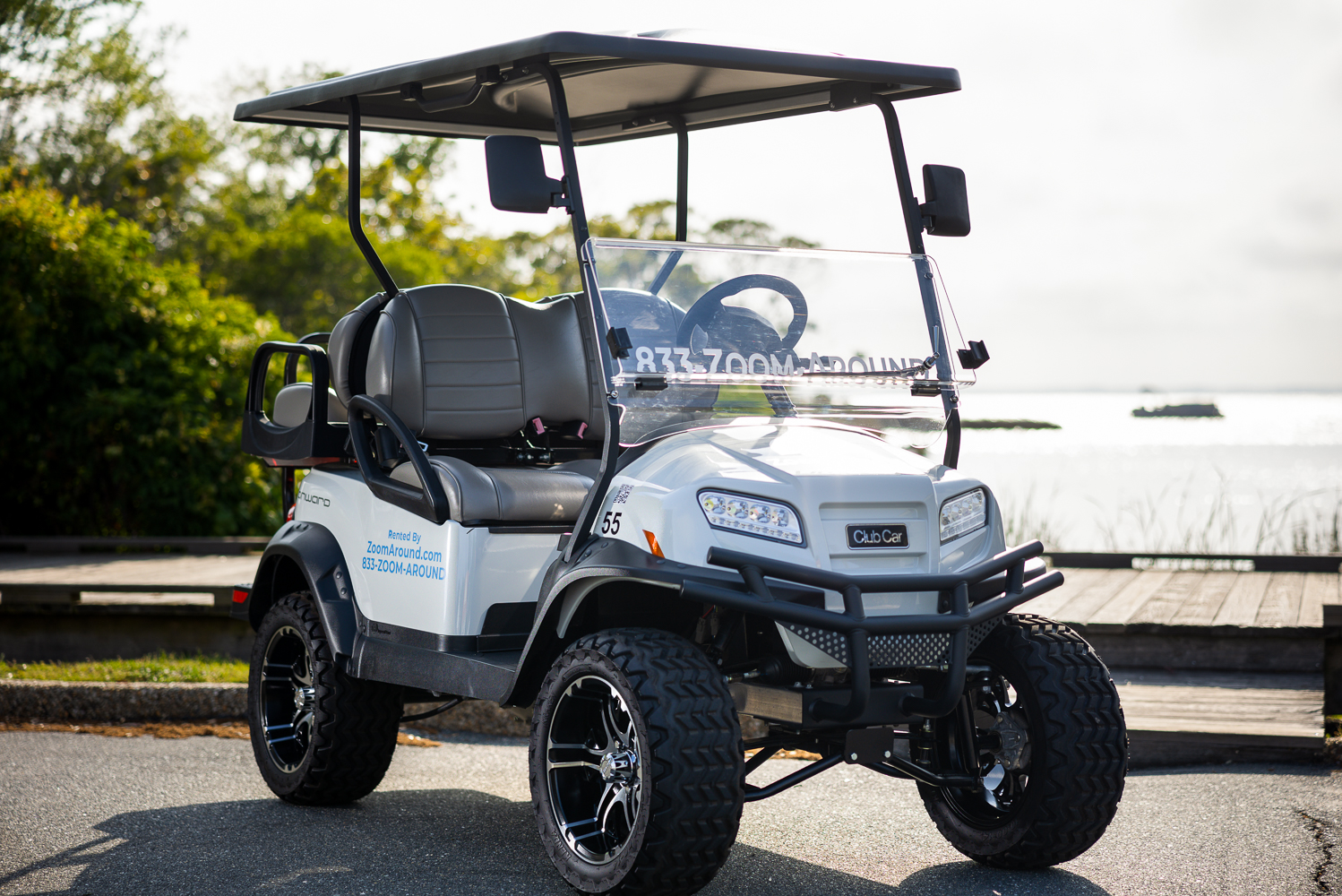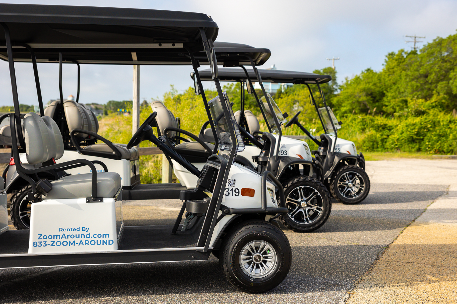 ZoomAround is a premier golf cart rental company on the Outer Banks. All golf carts are street legal, licensed, and insured as well as equipped with headlights, taillights, windshields, side mirrors, and seat belts. Four-passenger and six-passenger golf carts are available for delivery and free in-store pickup from ZoomAround's office in Duck, NC. Pickup and delivery is available in all service areas. Enjoy the convenience of using a golf cart to cruise around town or to go to the beach. Contact ZoomAround for more information on OBX golf cart rentals.