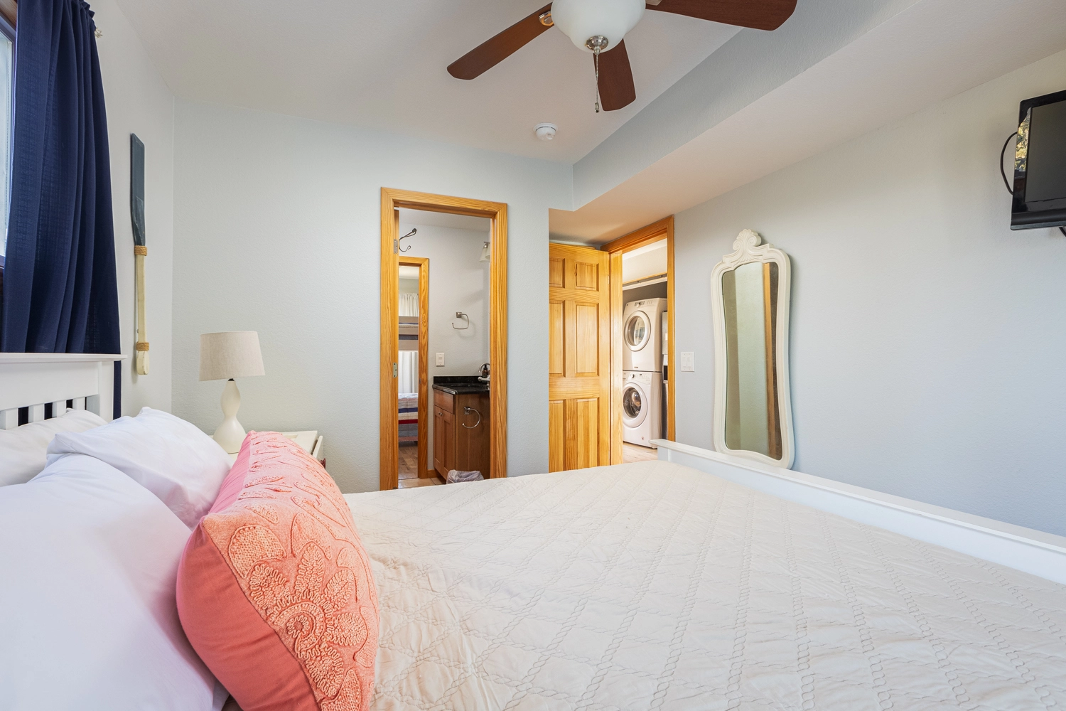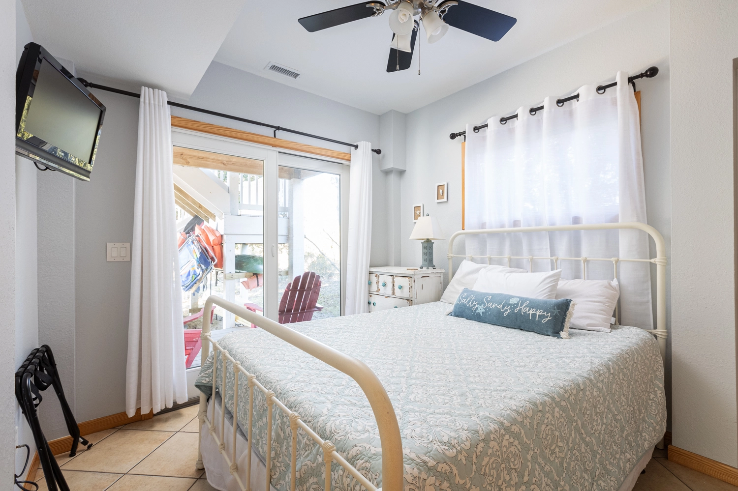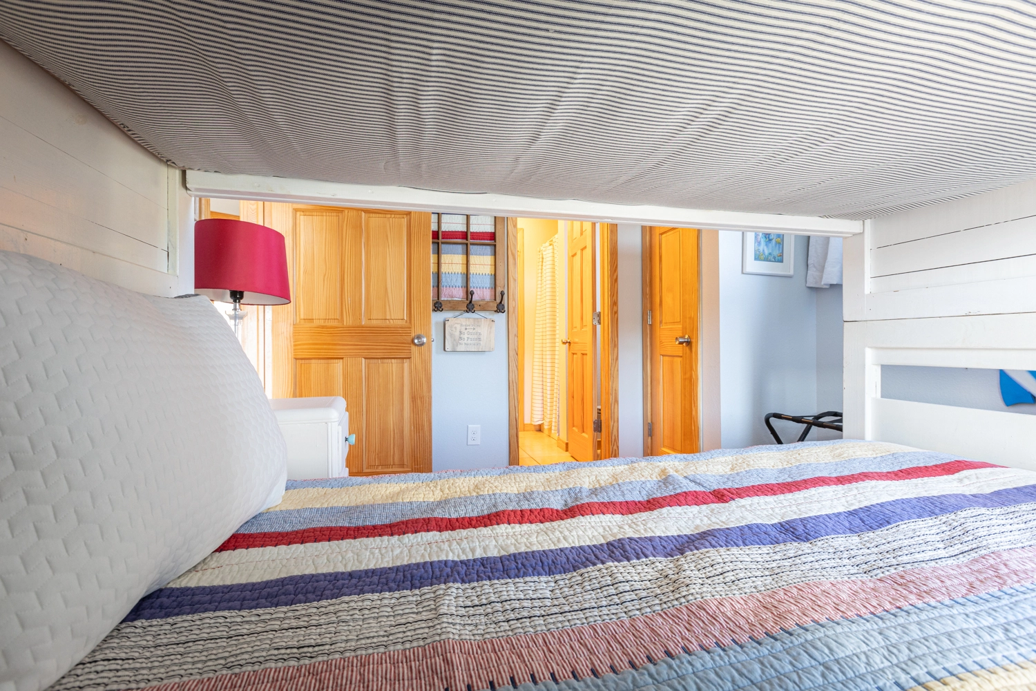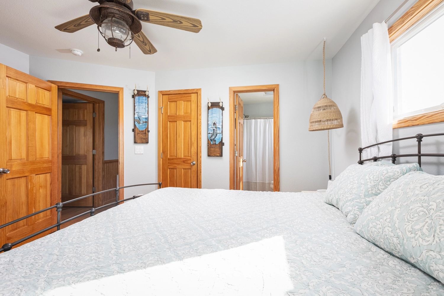 Queen, Shared bath with Room 2, Standing shower, Deck access