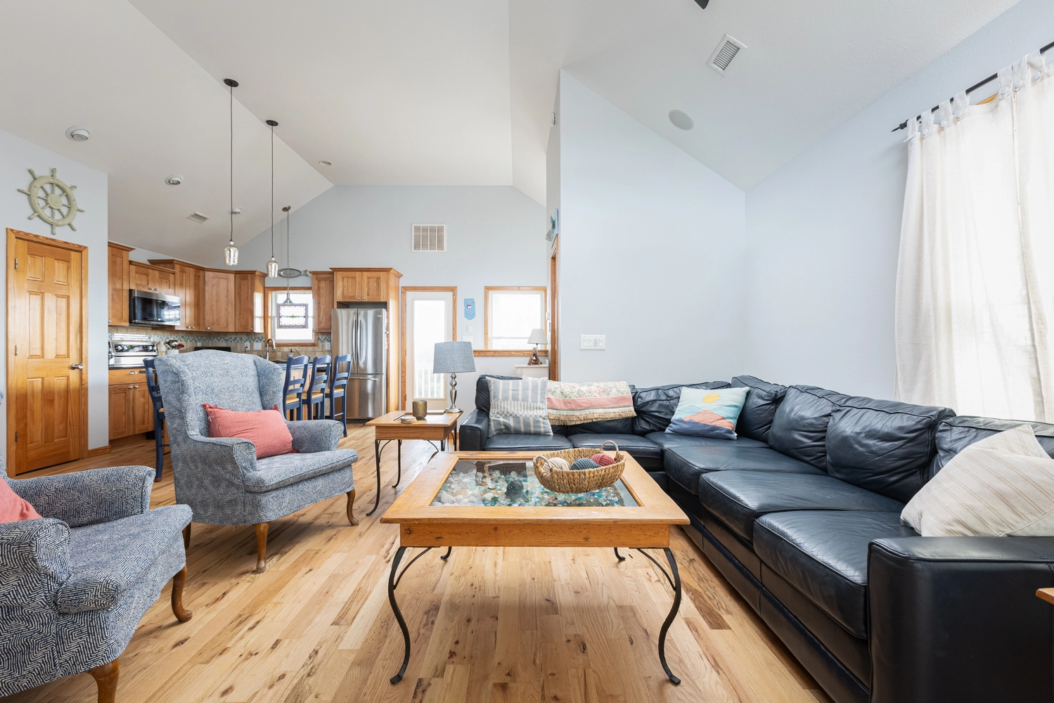 Great room; kitchen; dining area; screened porch.