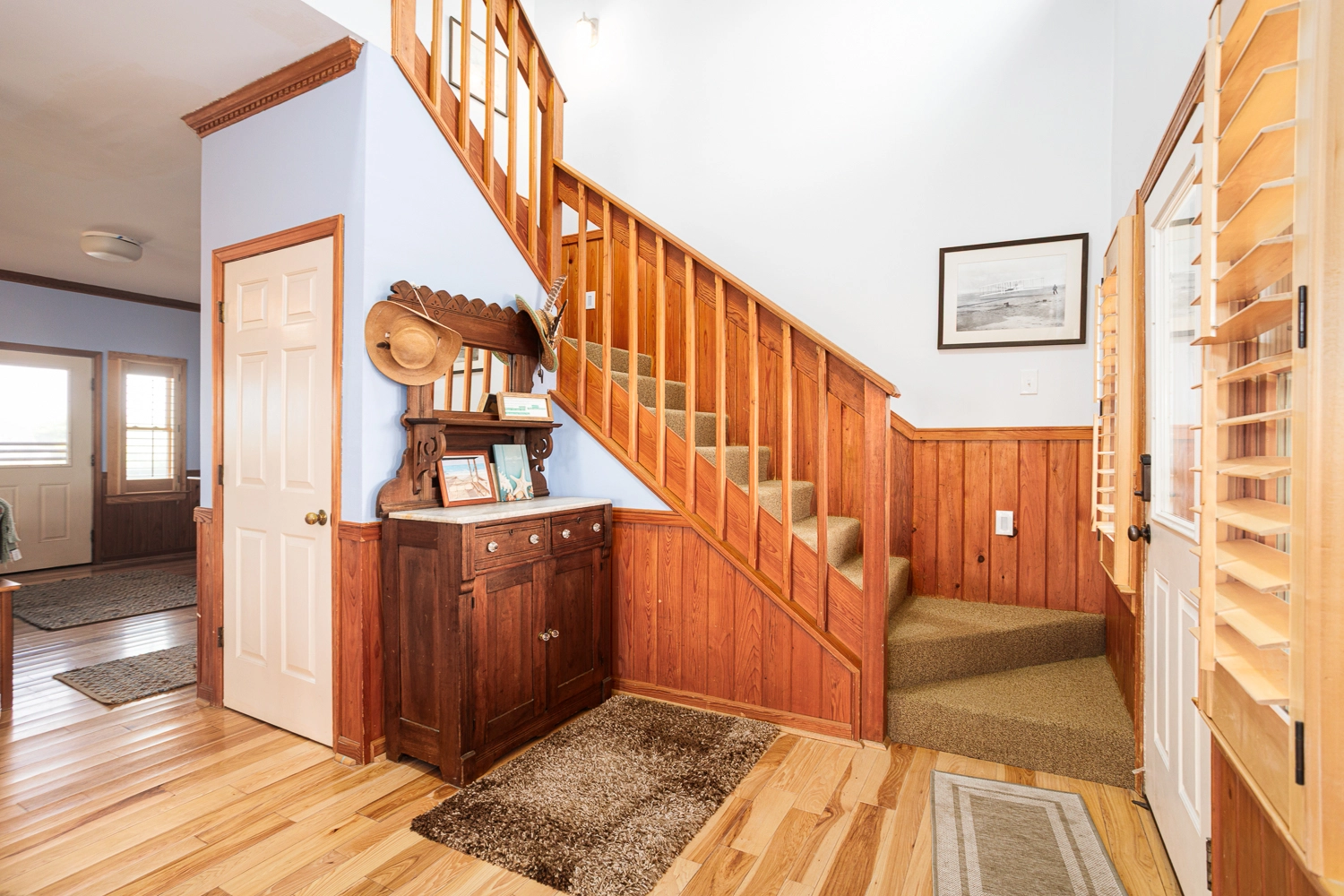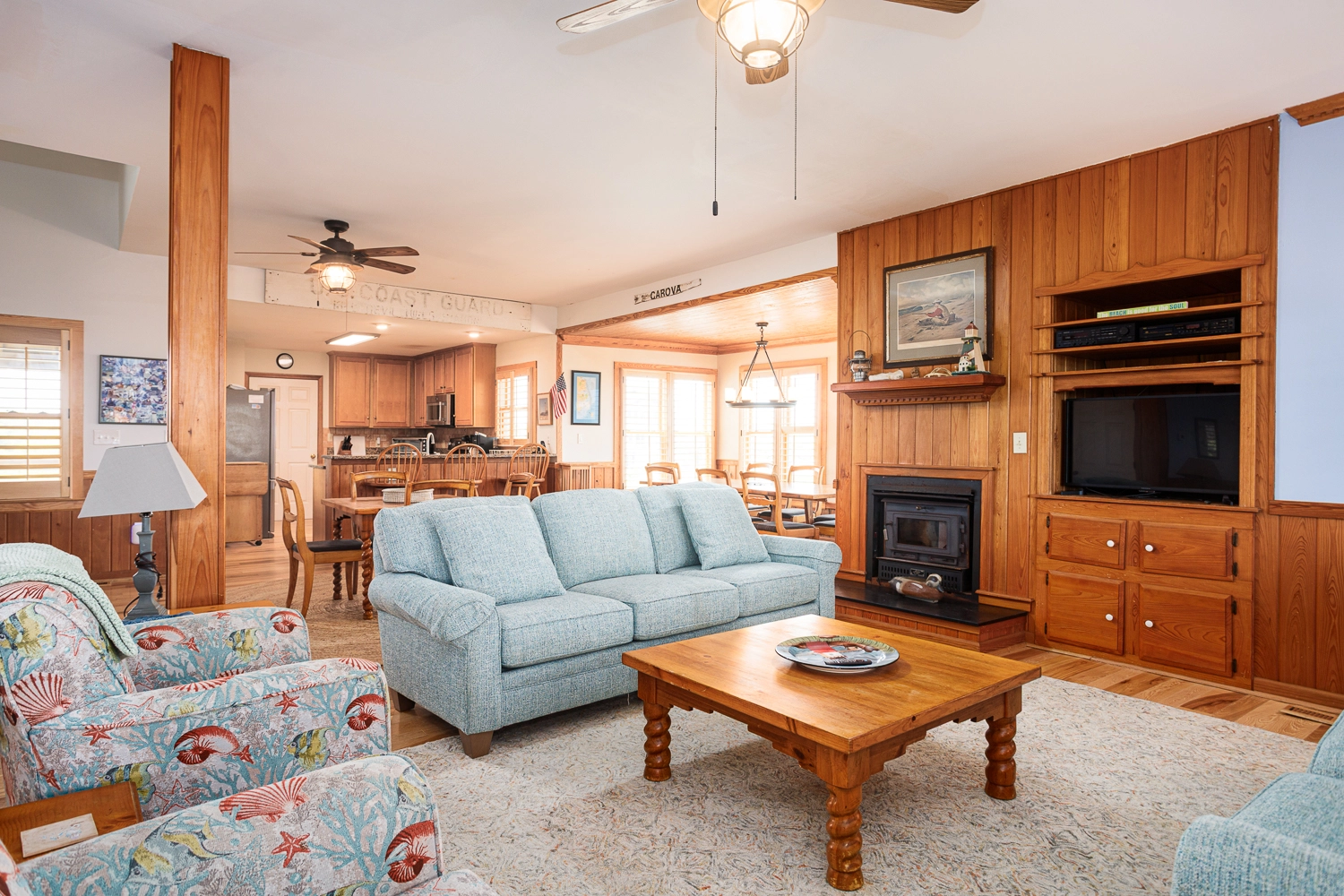"Twiddy - great mgt company. Handled reservations, questions and issues promptly before and during stay. Loved the vibe of older vacation home. Perfect setting. Beautiful job updating the home and boardwalk. Firestove - very efficient & warmed room perfectly Living room furniture very comfortable Dining chairs are in extreme need of padding/cushioning. Upholstery loiks new, but omitted updating padding. Stove - bottom drawer in need of deep cleaning Hairdryer would be nice Hope no one builds on lot outside dining room window. Such a wonder view along with beach view. Boardwalk and seati2ng at end perfect."