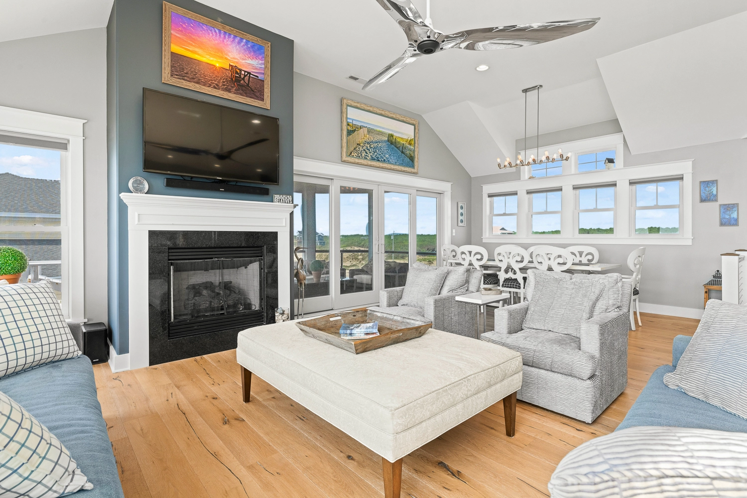 Great room with gas fireplace; kitchen with wet bar; dining area; screened porch.