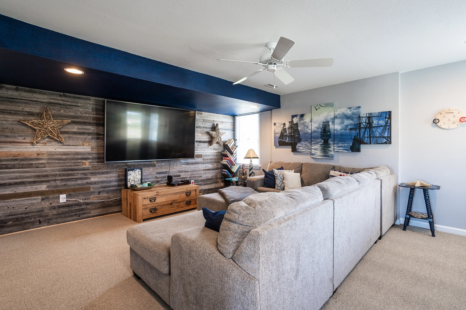 Media room with indoor shuffleboard table; kitchenette with refrigerator, dishwasher, and wet bar.
