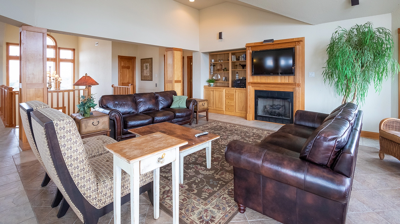 Great room; kitchen with two dishwashers; dining area; covered porch.