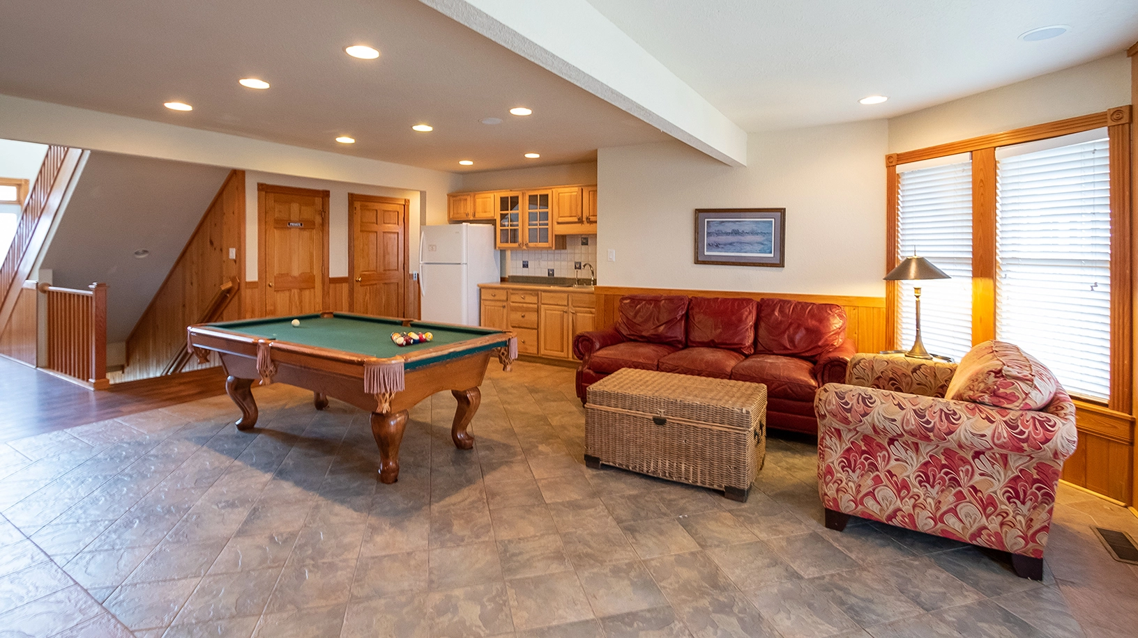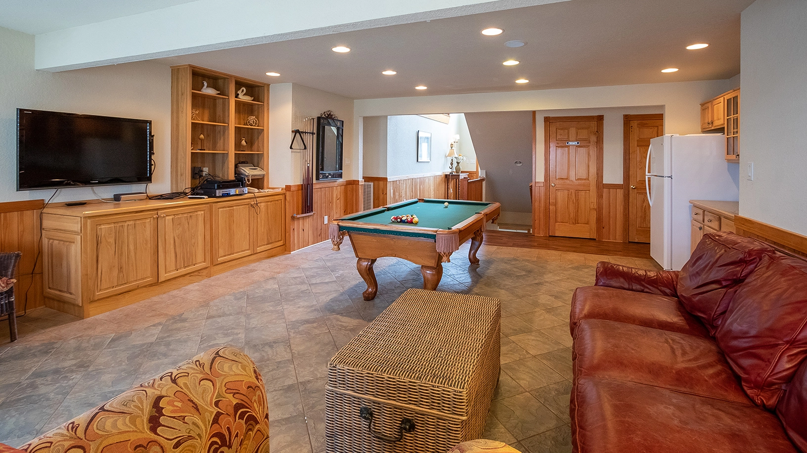 Rec room with pool table and wet bar with full-size refrigerator; access to private pool.