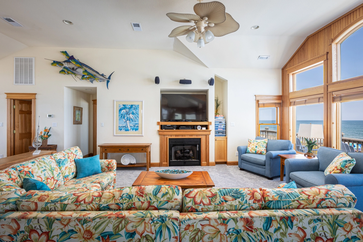 Great room with gas fireplace and large-screen TV; kitchen; dining area; widow’s watch seating; reading nook.