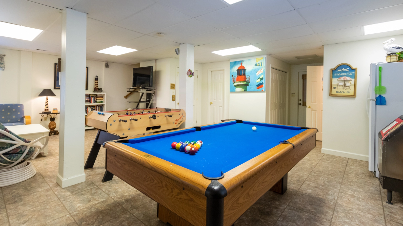 Game room with surround sound, pool table, foosball, full-size refrigerator; laundry.
