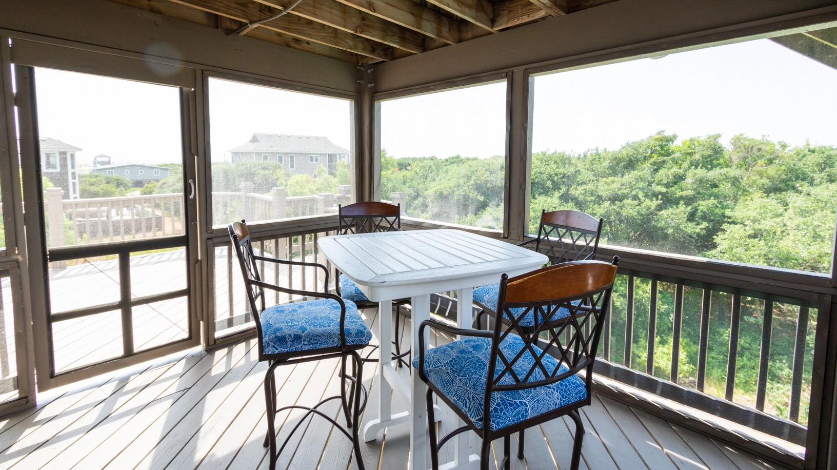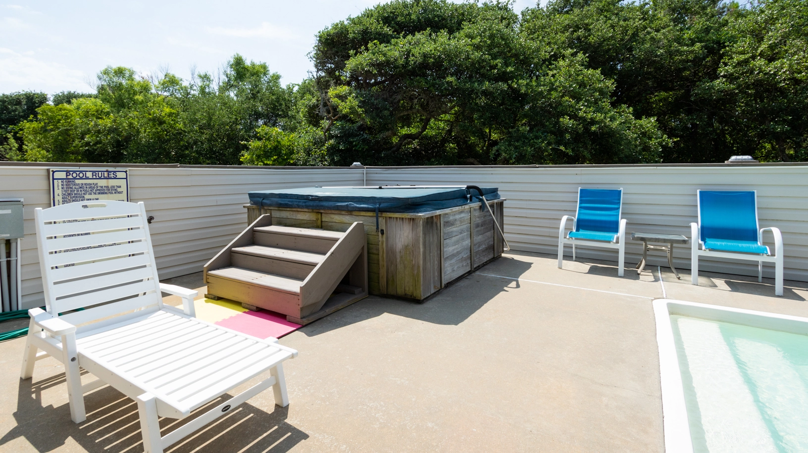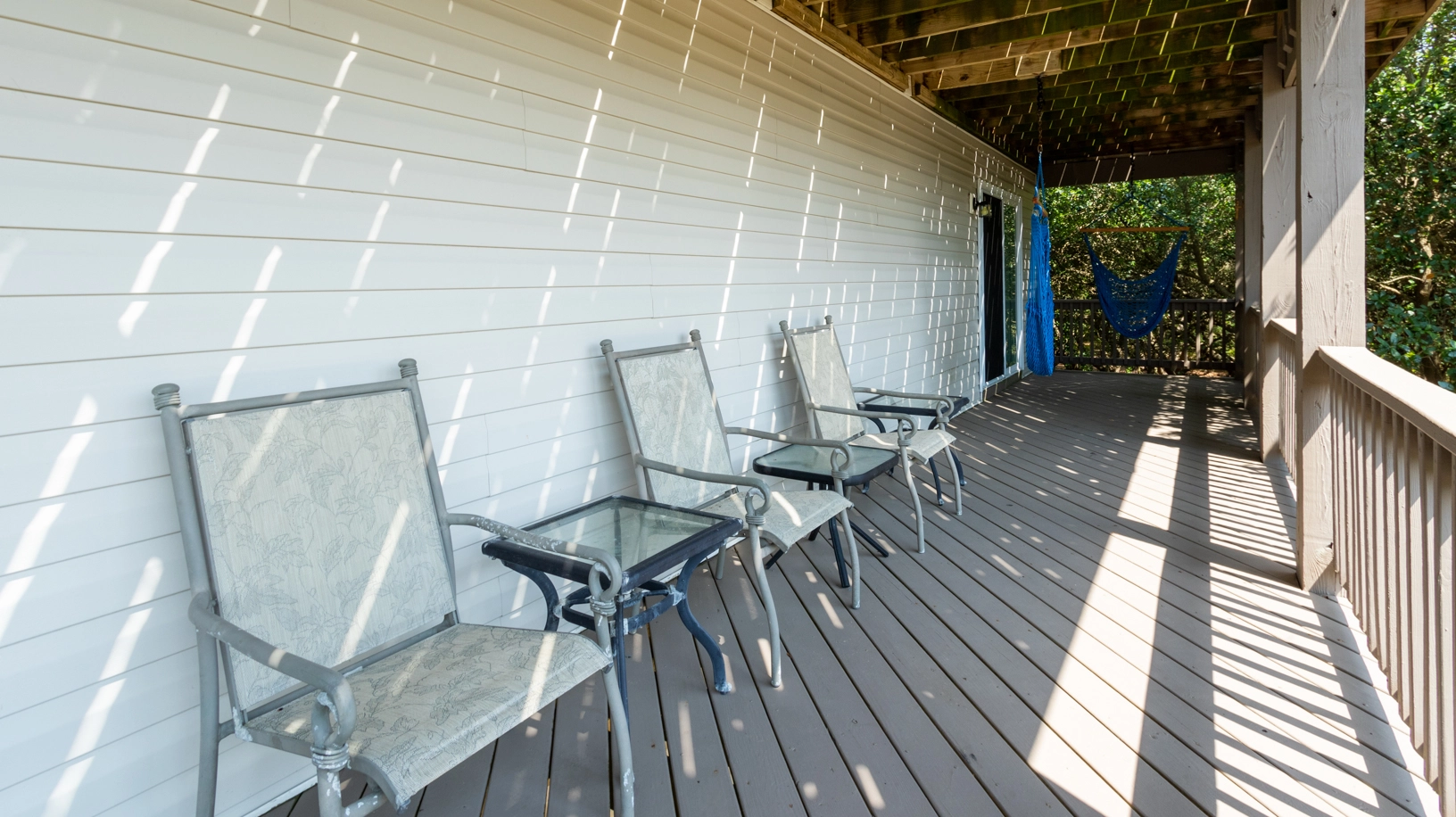 "What a gem! Carova’s Wharf is tucked away with trees all around but still very close to the beach. We loved all the hammocks. We enjoyed them everyday! So relaxing with the warm breeze with birds and other wildlife all around us. We were lucky to have a large group of horses hang out for a few hours in our backyard. The decor is very nice and the kitchen was thoughtfully equipped with usable pots/pans and utensils. Hot tub was new and we loved that along with the pool."