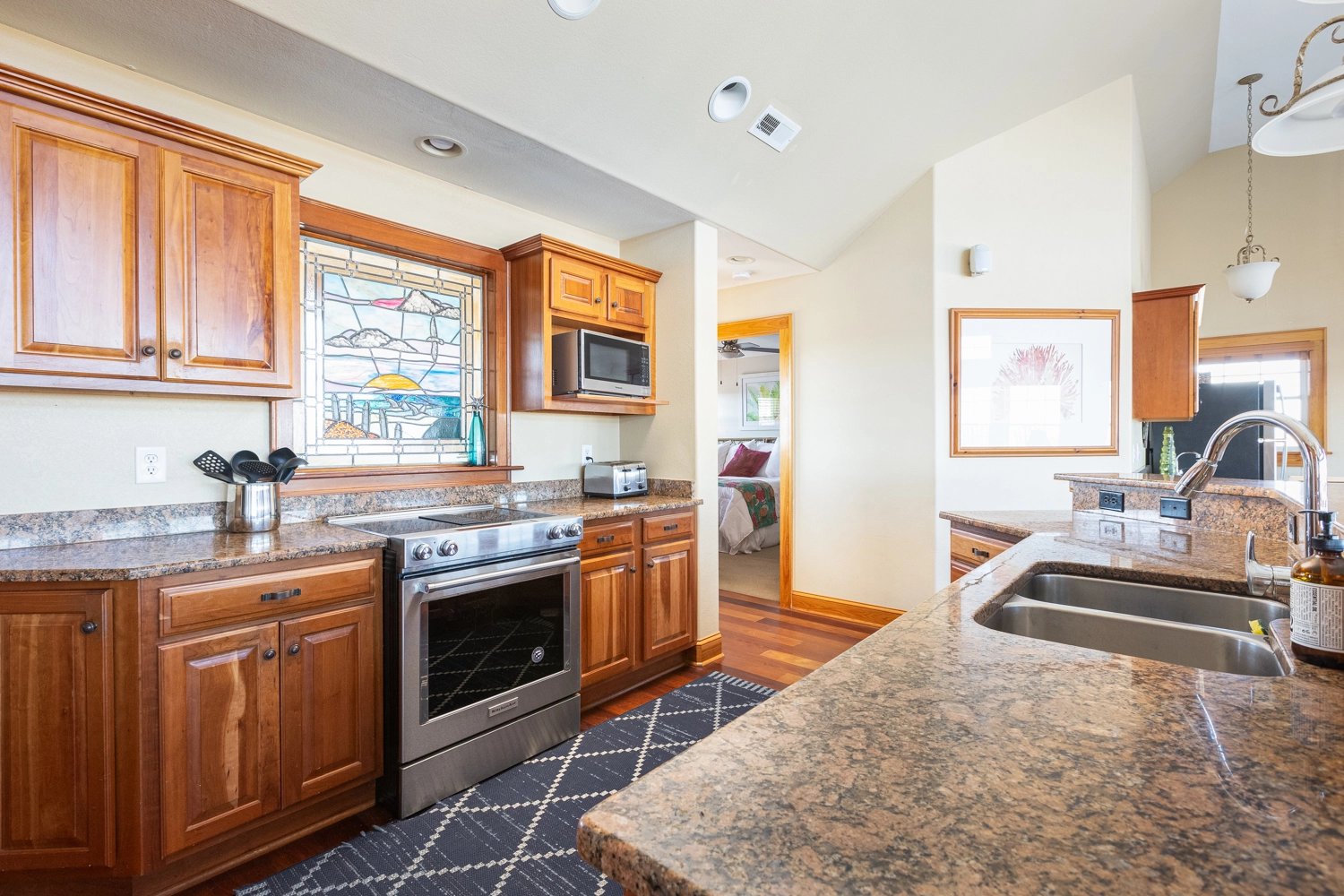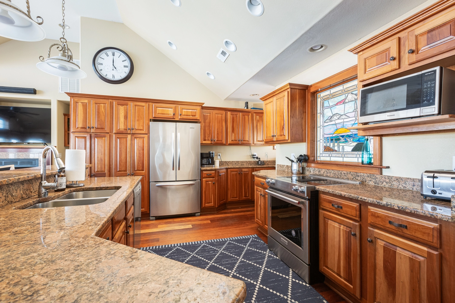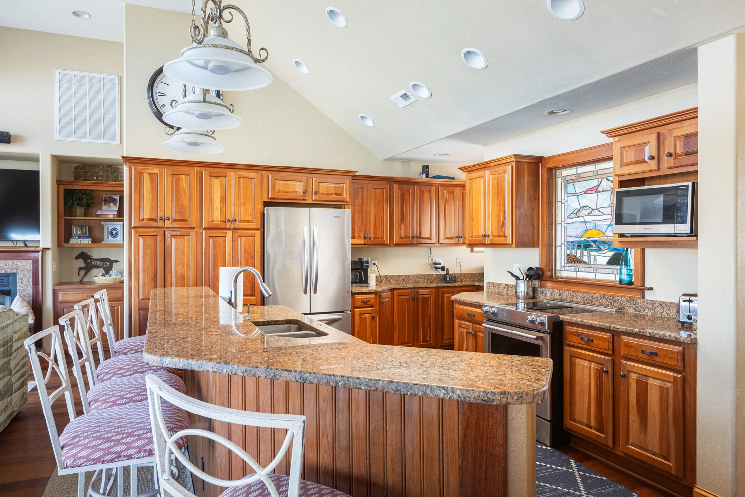 Great room, surround sound and wet bar; kitchen with island seating; stained glass window; dining area; open decks with bench seating.