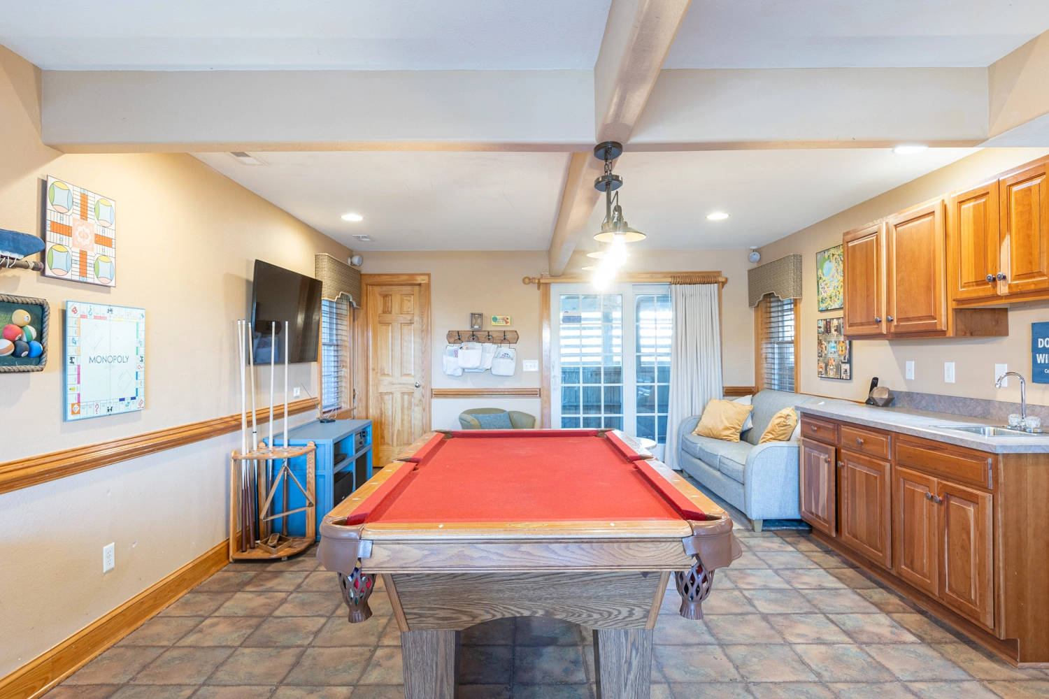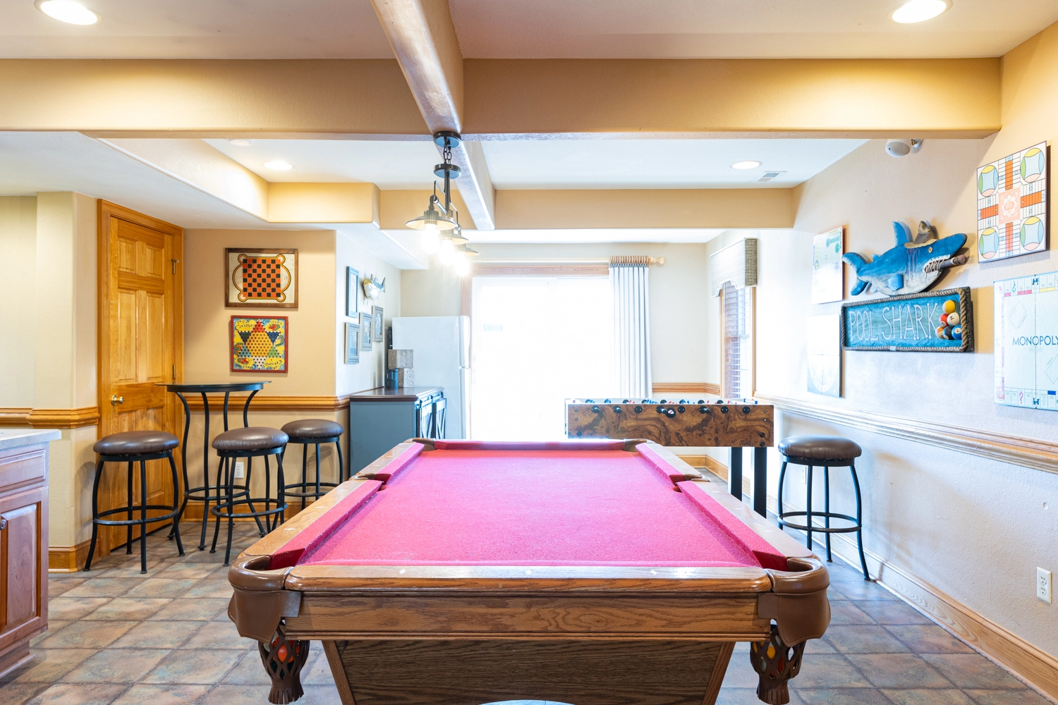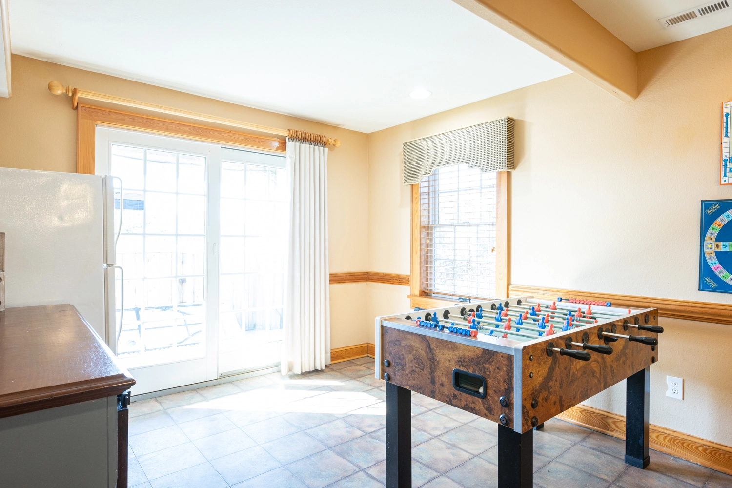 Recreation room (QSS) with surround sound, pool table, and foosball; wet bar and one refrigerator; laundry room; access to patio with gated private pool; outside shower.