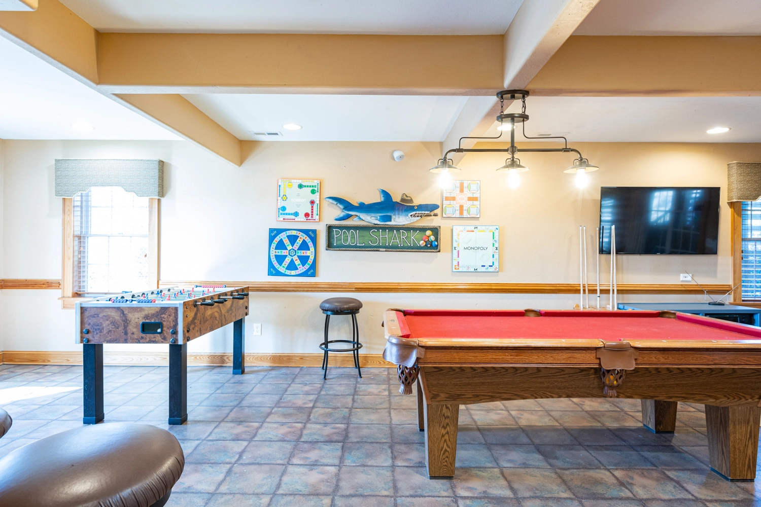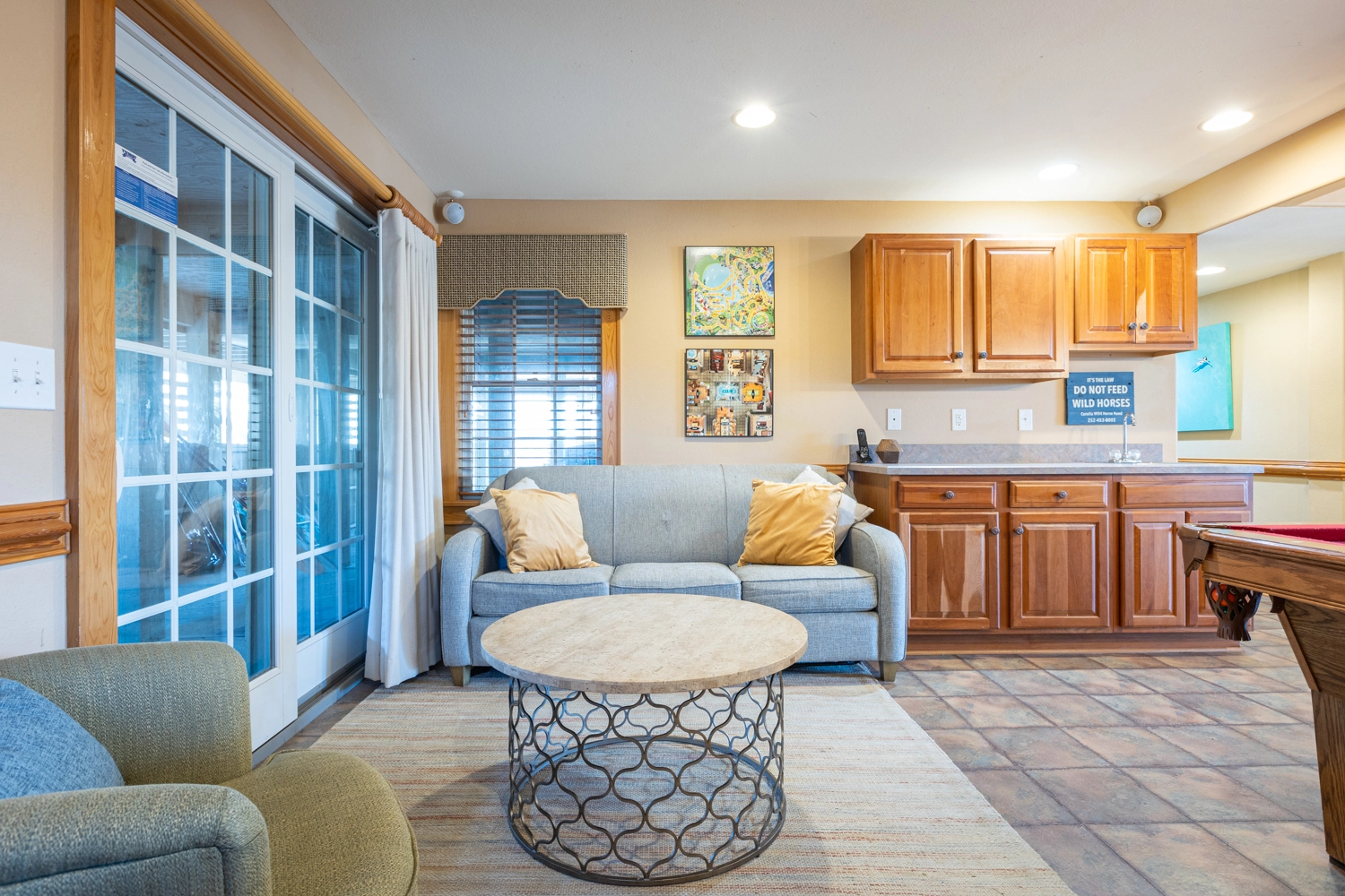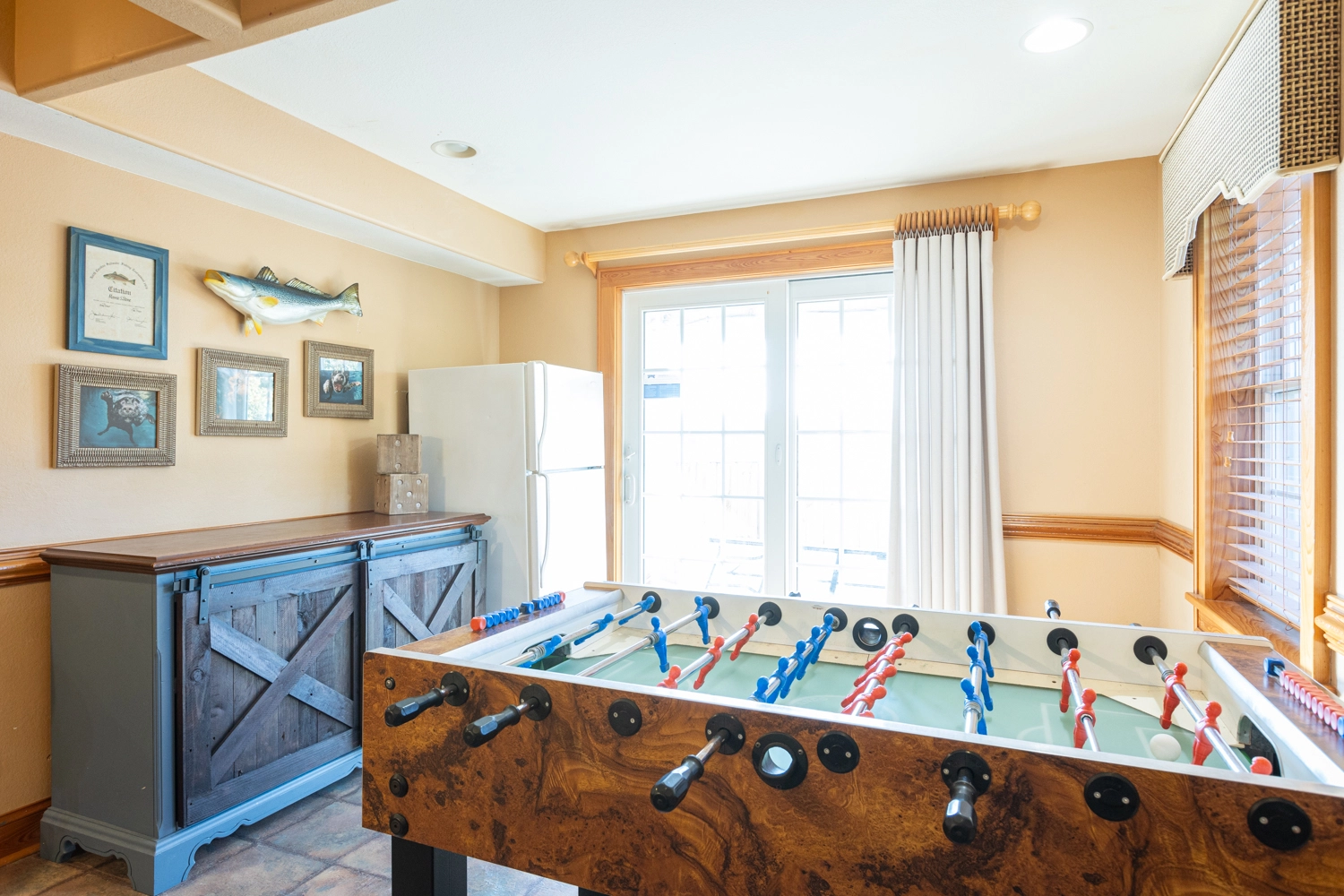 Recreation room (QSS) with surround sound, pool table, and foosball; wet bar and one refrigerator; laundry room; access to patio with gated private pool; outside shower.
