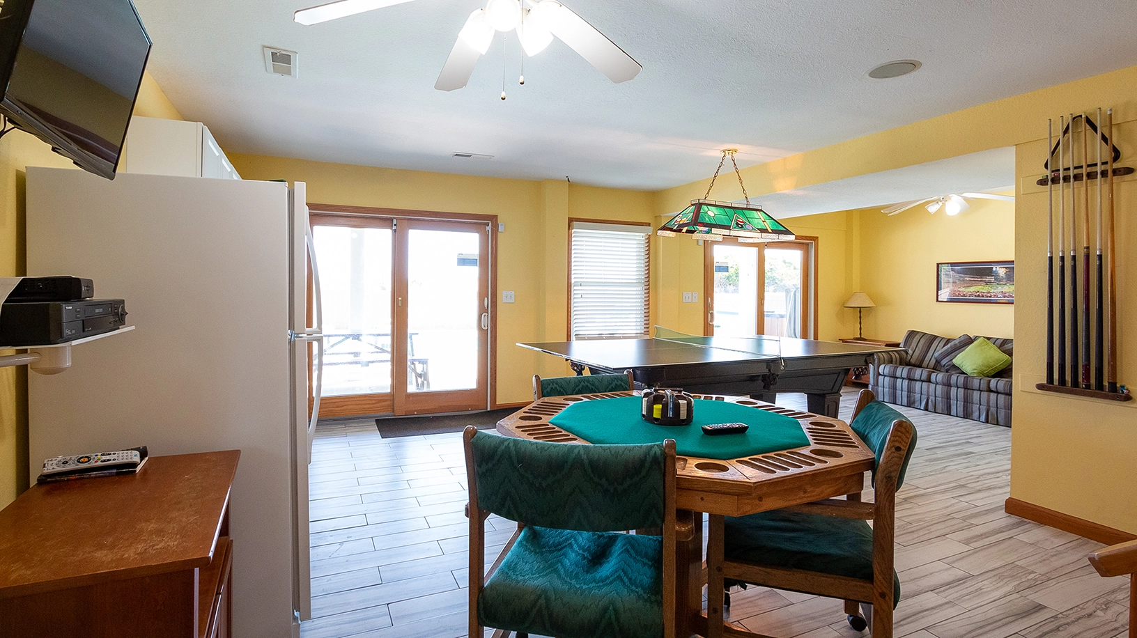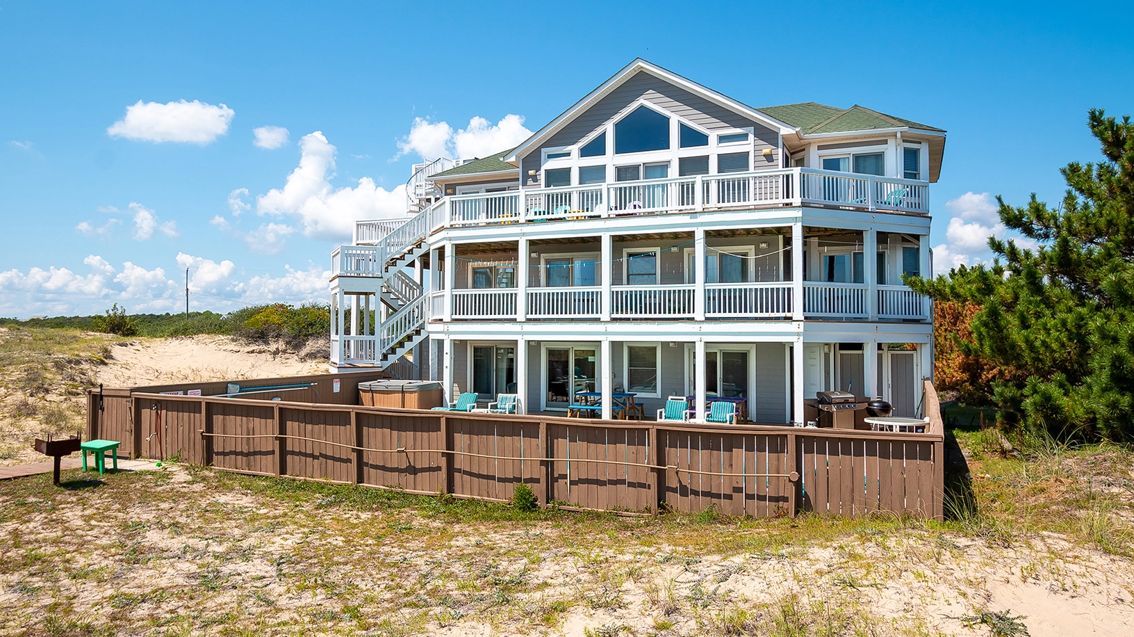 Recreation room with pool table/ping pong table, kitchenette with full size refrigerator and microwave; patio with pool, hot tub & gas grill; outdoor shower and toilet accessible from pool area; deck with seating on frontal dune overlooking beach.