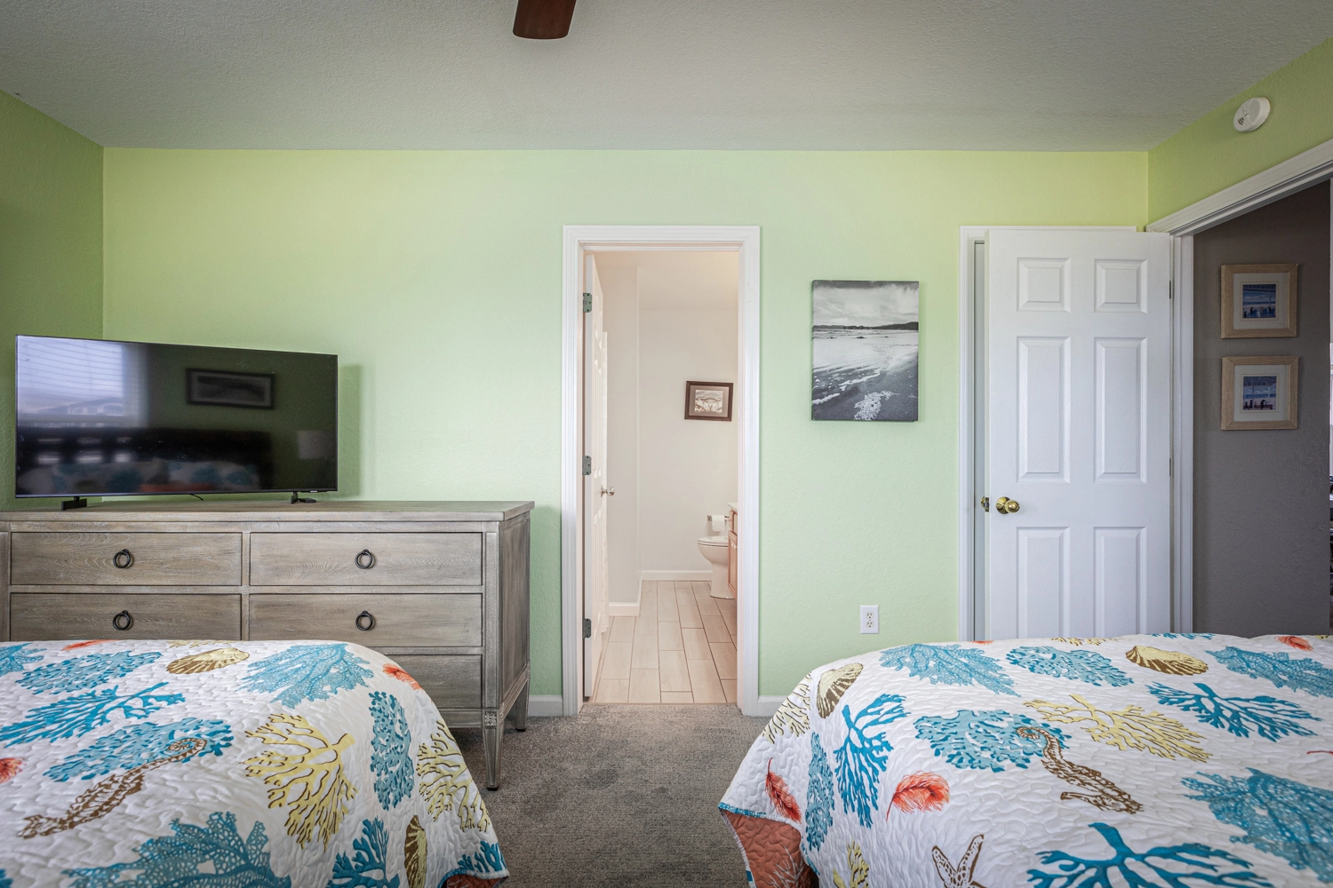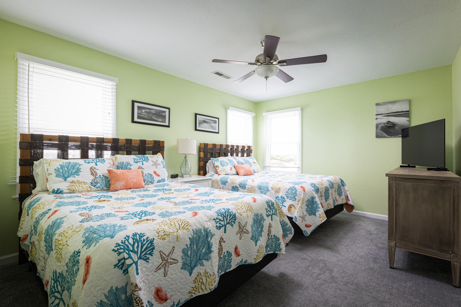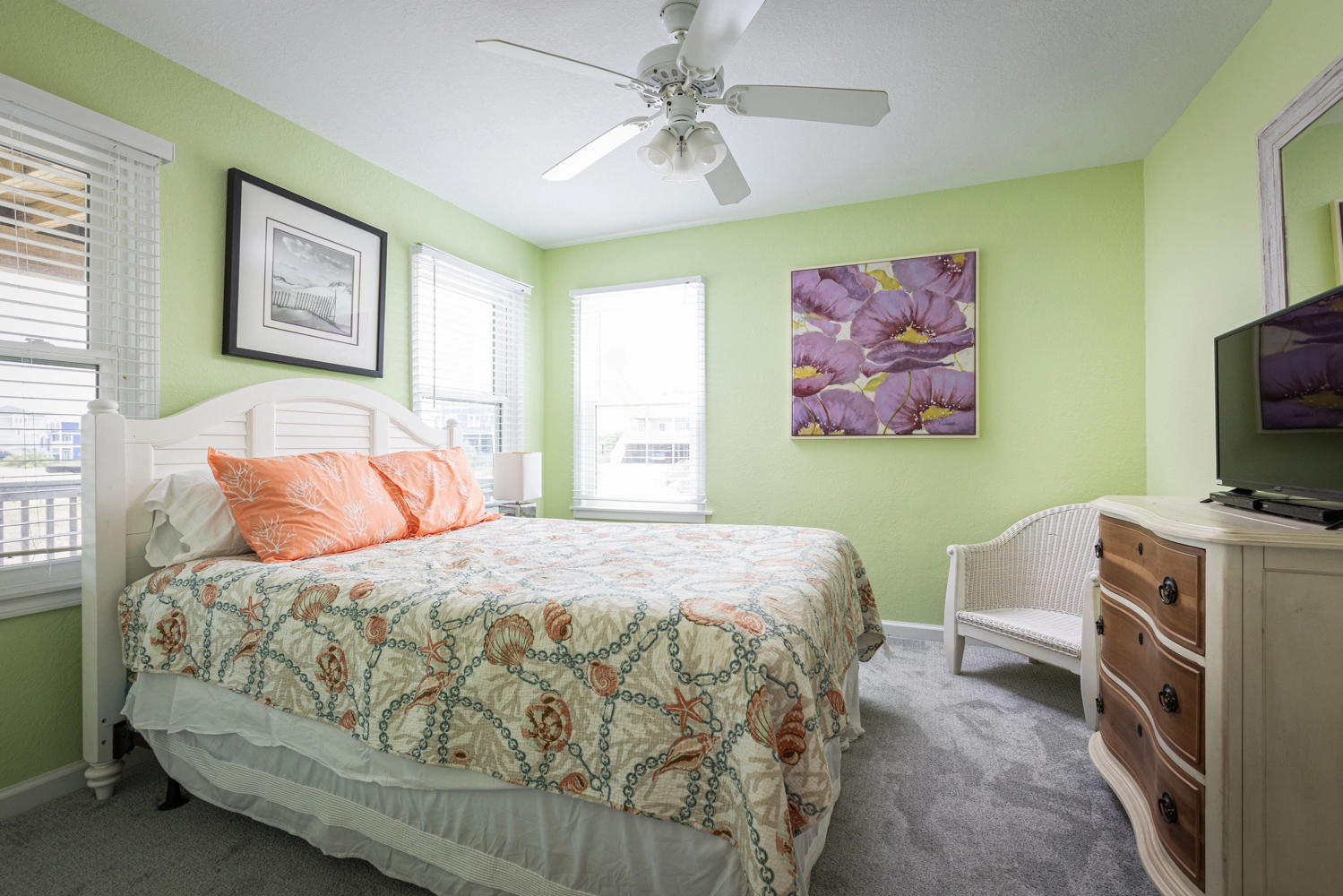 "This house was fabulous! The great room was spacious with ample seating for all, so it felt like we were together even when we we doing different things. The kitchen was well stocked with more cookware, gadgets, and utensils than we could possibly need. A regular coffee pot as well as a Keurig. Two dishwashers were awesome! Loved the extra refrigerator and ice maker on the lowest level. Each bedroom having access to its own full bathroom was amazing. The location was spectacular. We had horses on property almost every day. All the outdoor areas were well furnished allowing us to relax no matter where we were outside. Beautiful sunrise views over the ocean and the boardwalk made getting to the beach easy. Renting through Twiddy was amazing too. Couldn’t have asked for better service, the Twiddy agents were fabulous!"