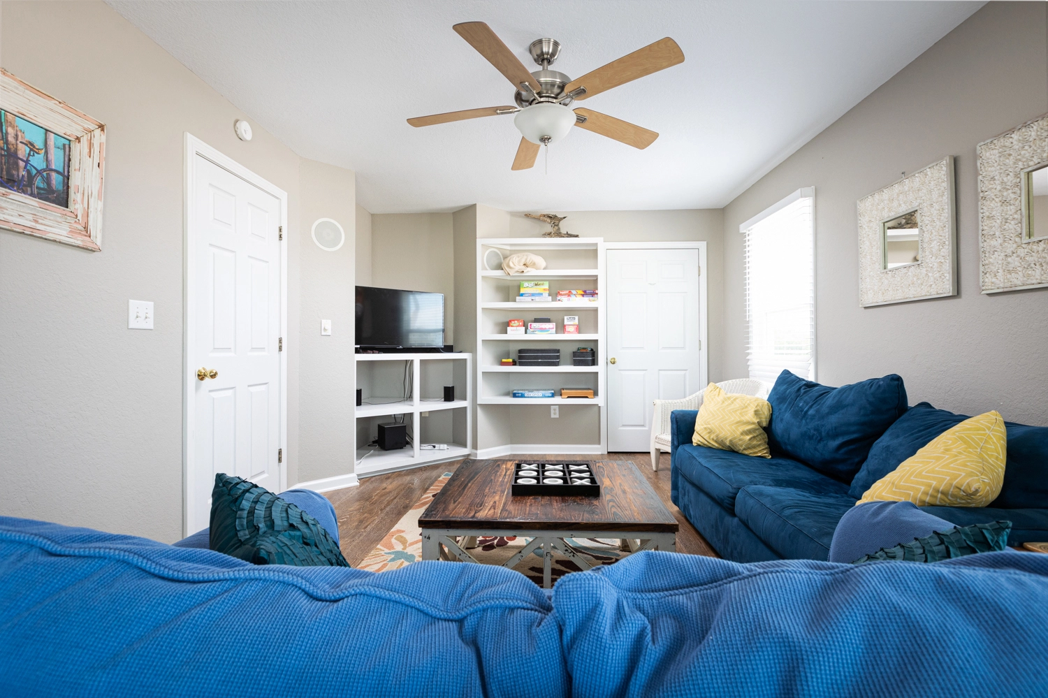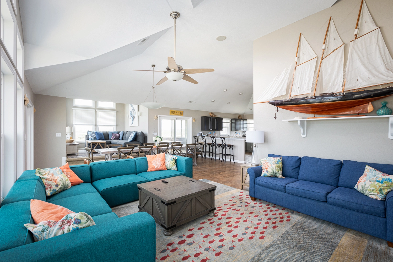 Great room with surround sound home theater system; kitchen with two dishwashers; dining area; open decks; screened porch.