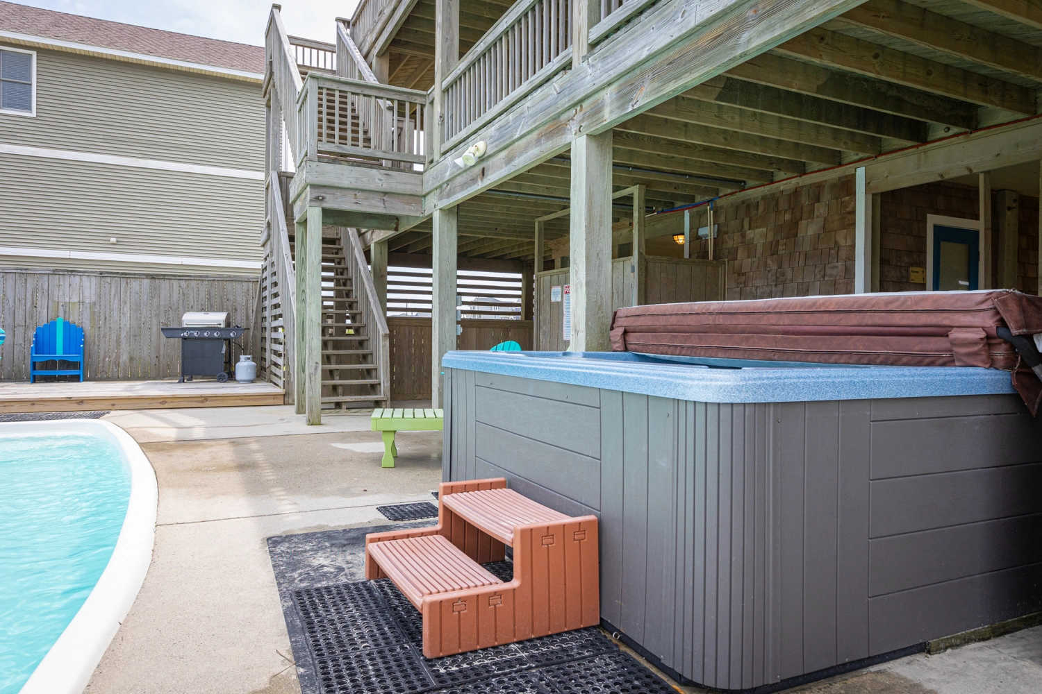 Patio with gated private pool and hot tub.