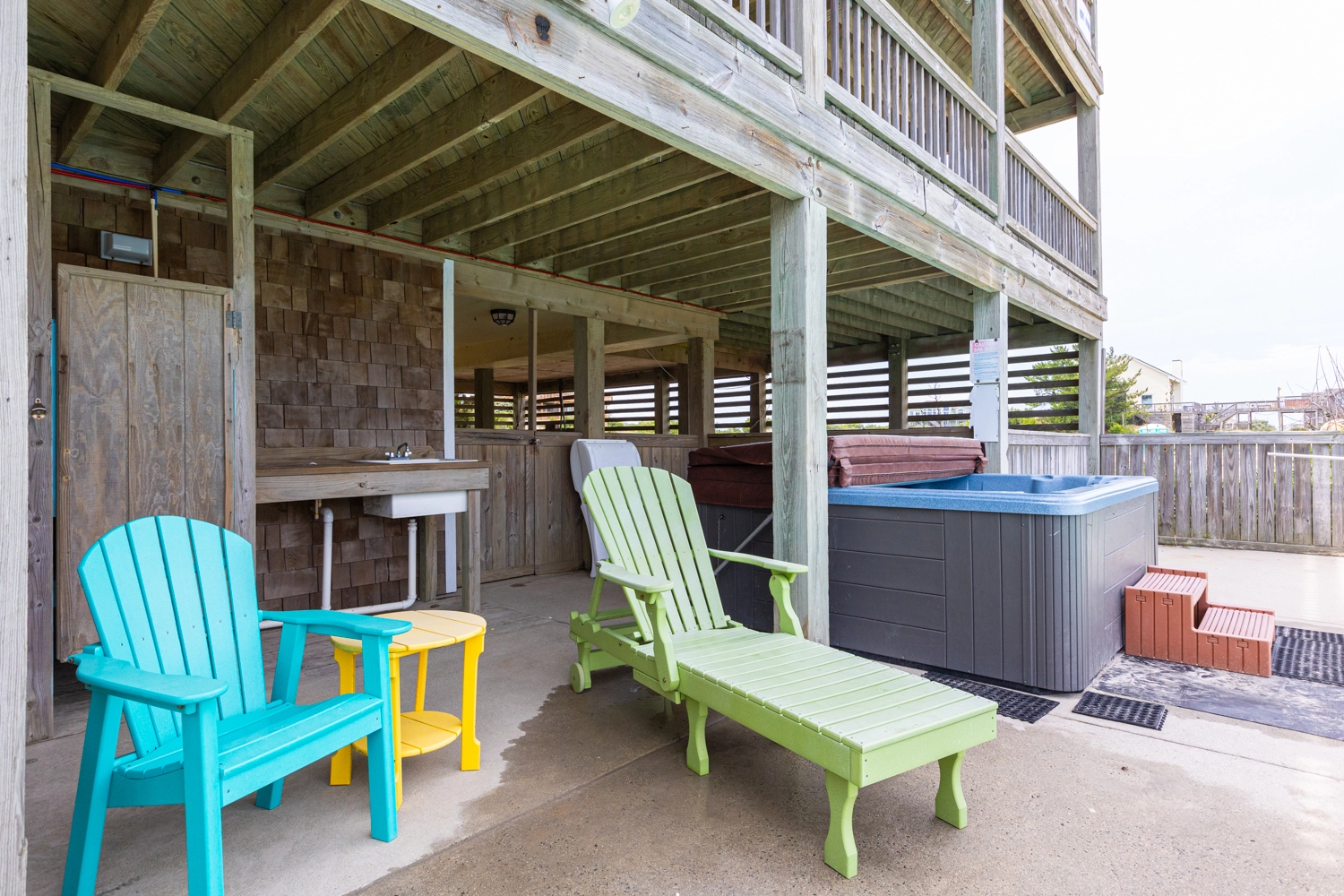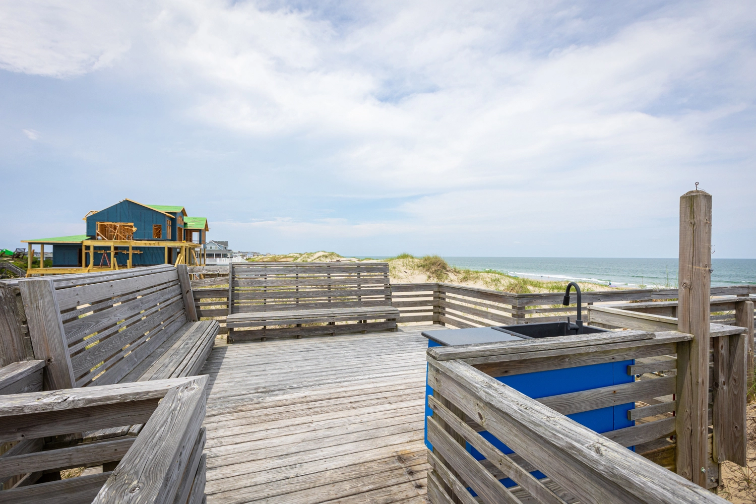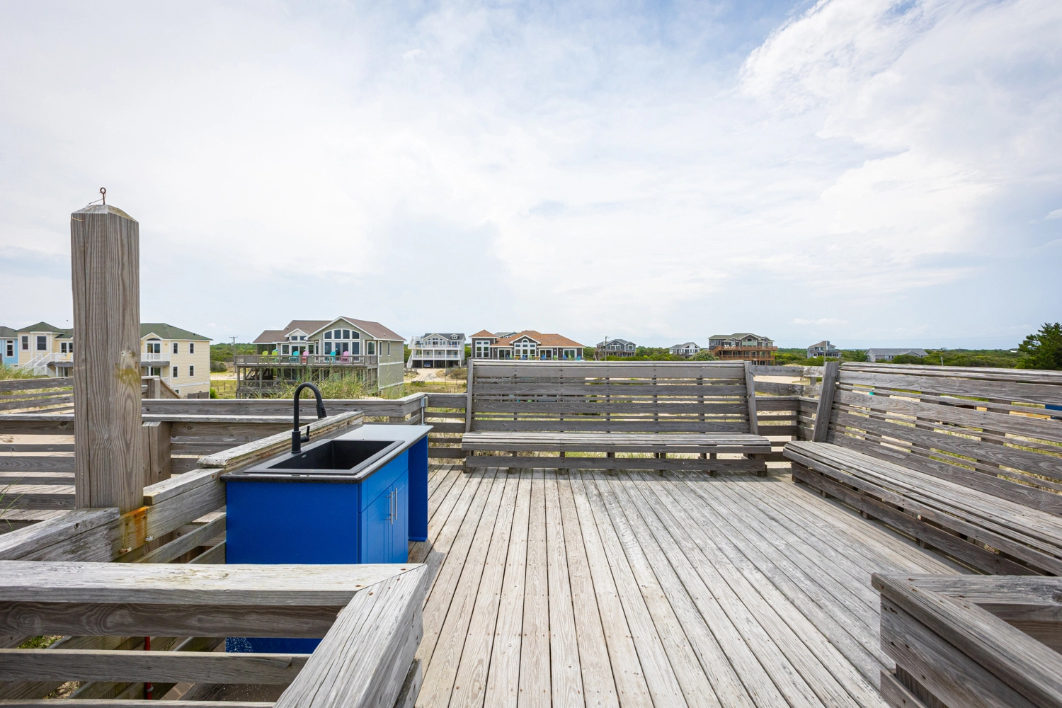Dune deck with wet bar, drink refrigerator, foot wash and seating.