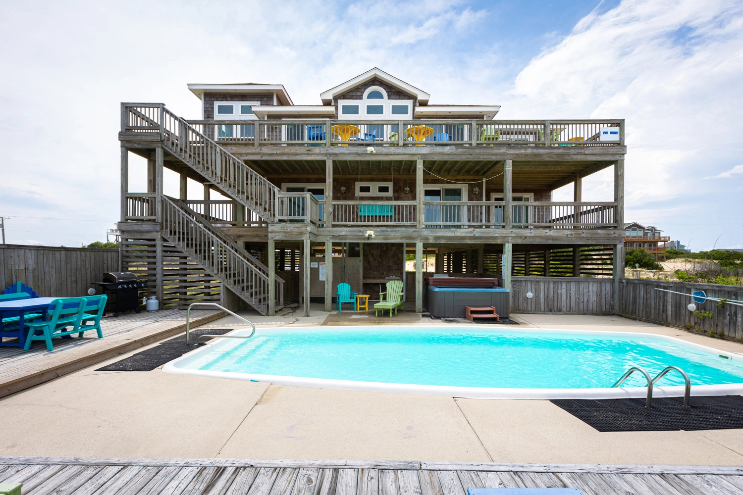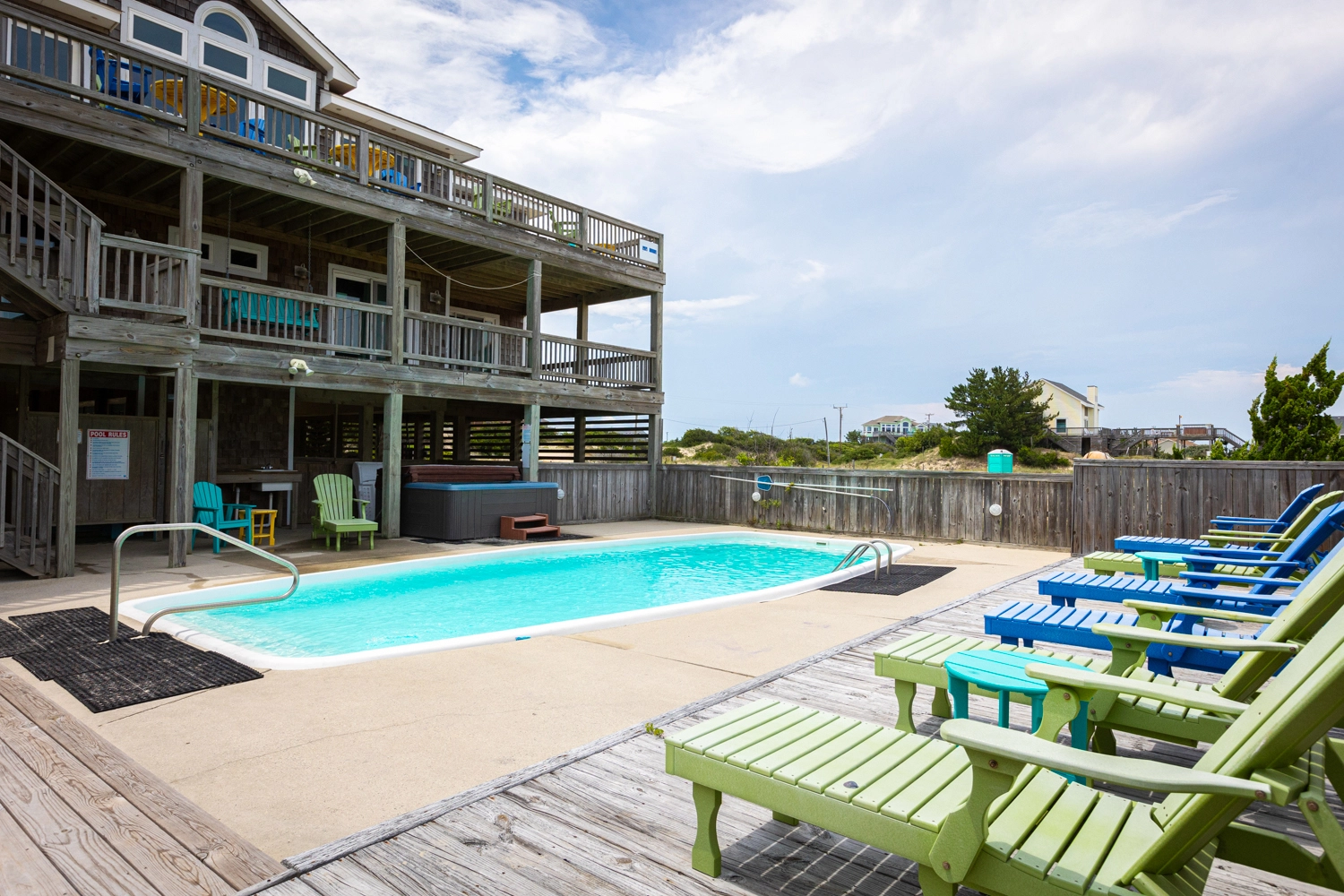 "This is our second consecutive year renting changes in latitude and we couldn’t be happier. The kitchen is fully stocked with all the things you need for the week. Tons of room to fit our four families. Easy walk to the beach each day and then hung by the pool and hot tub at night. Horses came up to our house each day."
