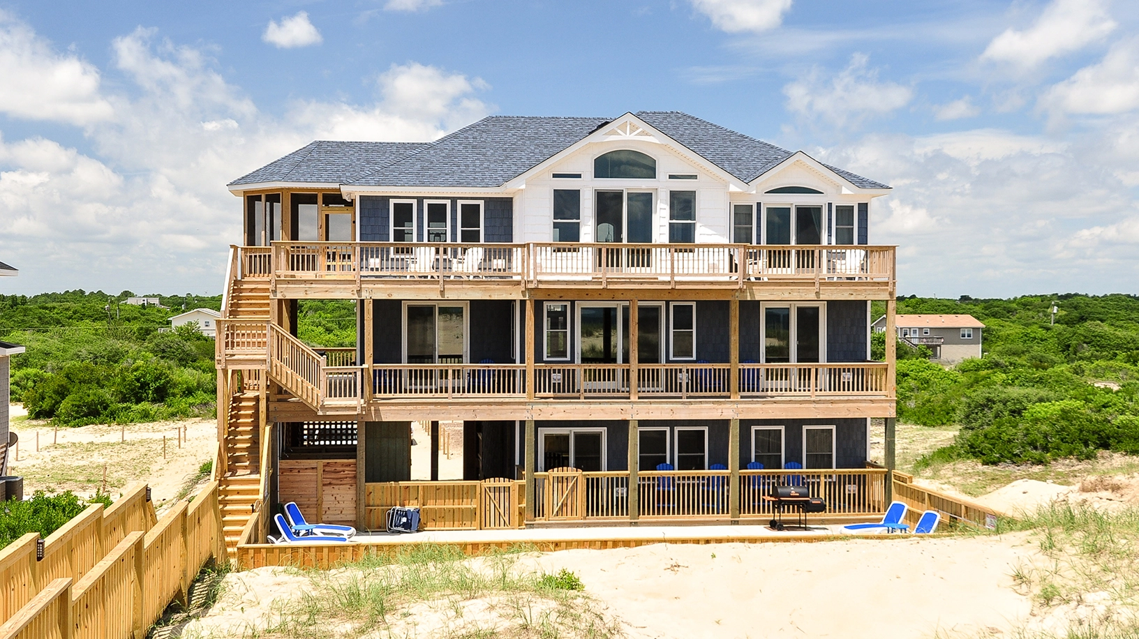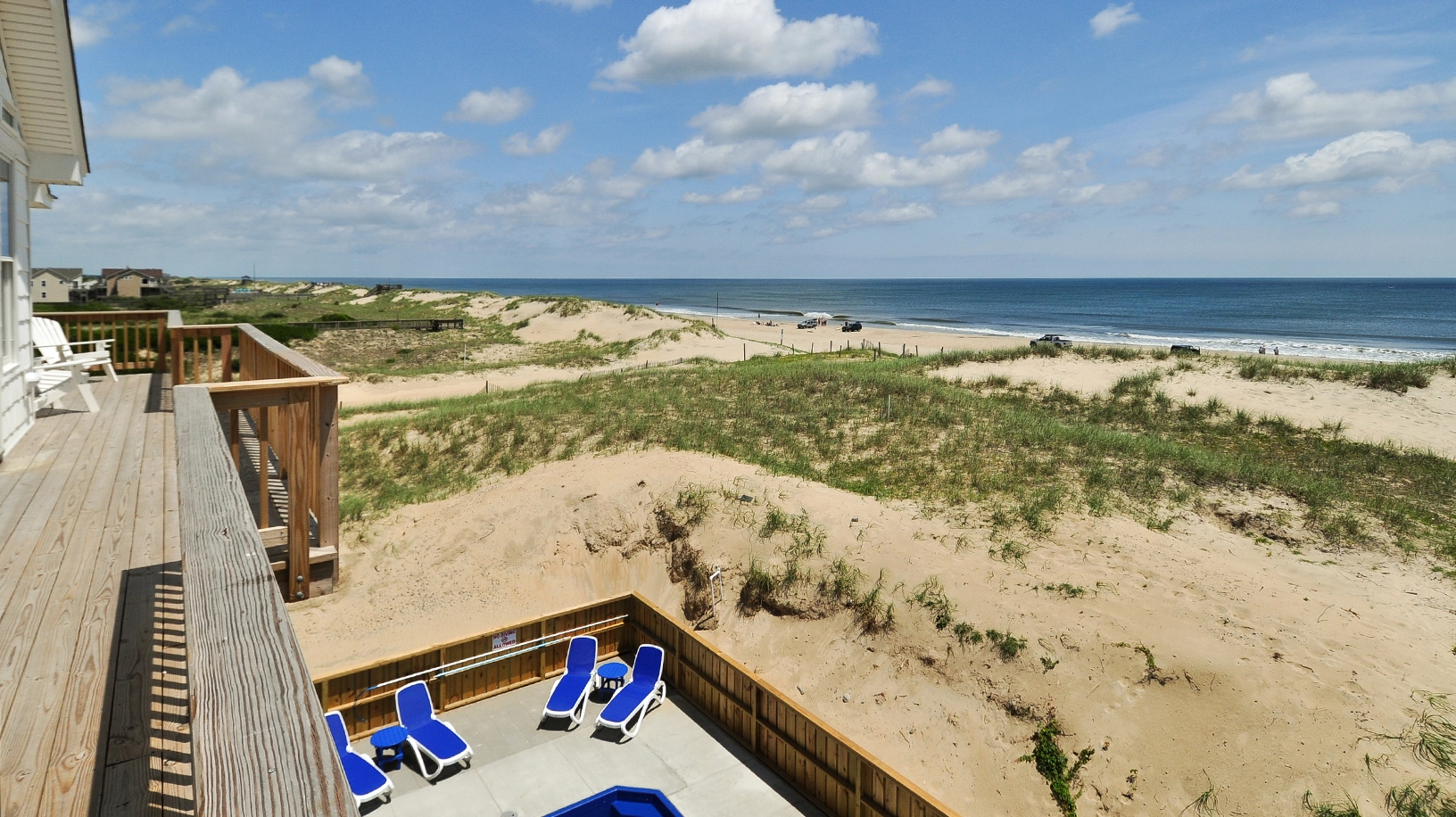 "The deck furniture is great as well as the stocked kitchen. We love the fact we can drive our chairs, etc. to the beach. We also like the well kept furniture in the house itself and this year enjoyed the theatre room!"