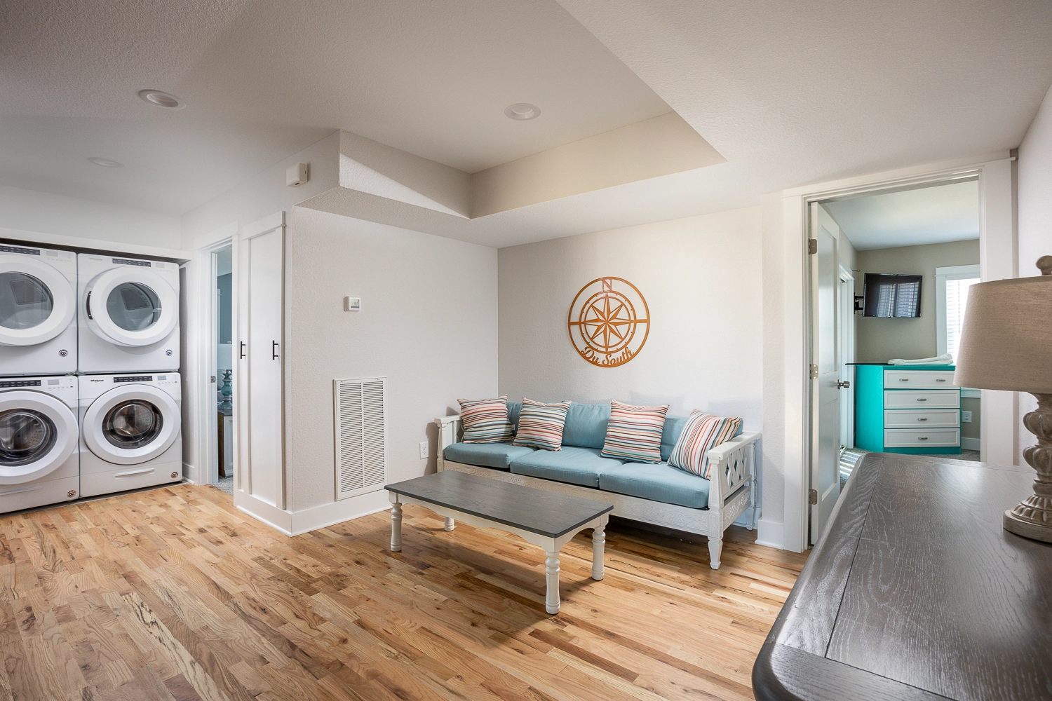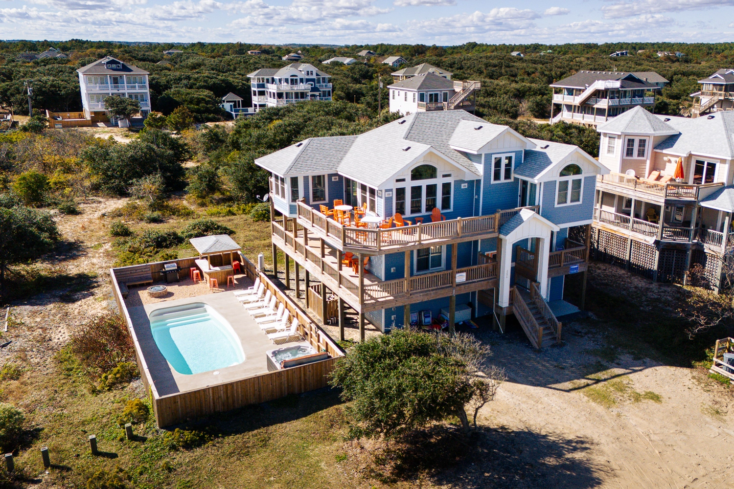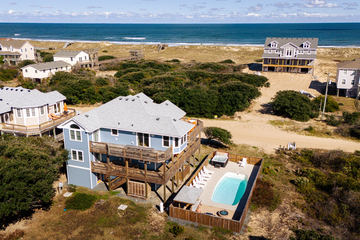"DuSouth is a beautiful home! The home is stocked with everything we needed even a big pot for our seafood boil. The grandkids really enjoyed the bottom floor media room, bunk beds, pool table and having their own fridge and microwave to make their popcorn. The home is CLEAN!!! There is ample space for large families (22 of us!) The beds are comfortable and clean. We loved all the windows in the living room to watch the sunrise in the morning while we sipped our coffee. We all enjoyed the pool-good size for playing volleyball-and the hot tub was a hit! Having two dishwashers really helped us to keep the kitchen spotless the whole week. We loved how all the drawers and cabinets were labeled so we knew where to return items and keep it all organized. The big table and bar counter in the kitchen made it easy for our large family to eat all meals together. The beach access was close and easy. It is a short walk or drive. We drove a couple of the trucks to the beach to haul the chairs and beach umbrellas but it's a close enough walk that the kids could walk back to the house to use the restroom or grab a snack or just go back and swim in the pool or sit in the hot tub. The beach was clean and not too busy so we had a good spot every day. Saw lots of dolphins playing and lots of horses-even had a horse in our back yard grazing on the grass. The only draw back is the distance from town to the house if you want to do a lot of shopping or site seeing or get ice cream etc it takes time to get to and from. Overall we really enjoyed our week and feel that the owner thought of everything you would need!"