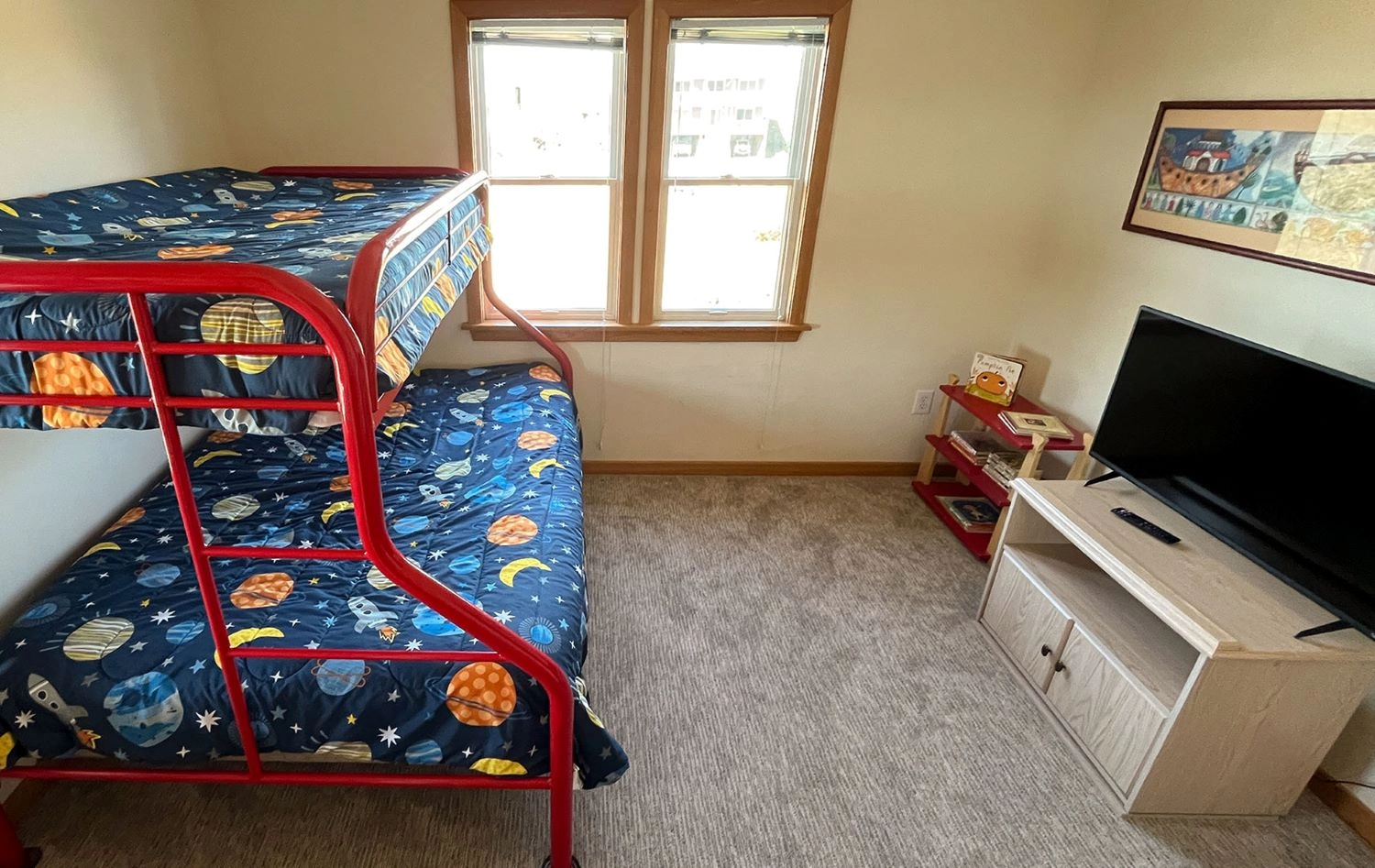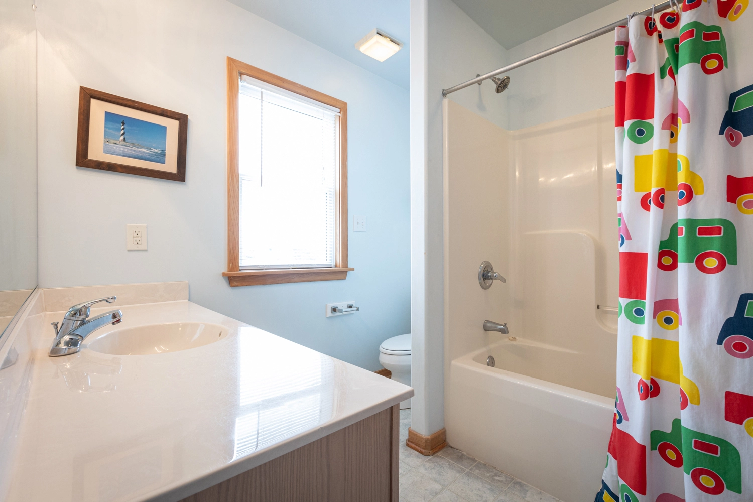 "Full Speed Ahead always feels like home to us. You can tell the owners really care for the home and it’s got a cozy feel to it. This is our 4th stay at this house and the owners just recently updated countertops in the kitchen and replaced carpeting. The red bunk bed circa 1994 has some real nostalgia for me, my cousin had that exact model we would use for sleepovers! My kids love it now, too. We enjoy sitting on the top deck and listening to the ocean during lunch time before going back out to the beach. Hot tub is super convenient on the top floor and great for Star watching at night. The screened in porch is a nice place to feed kids that are soaking wet from swimming,"