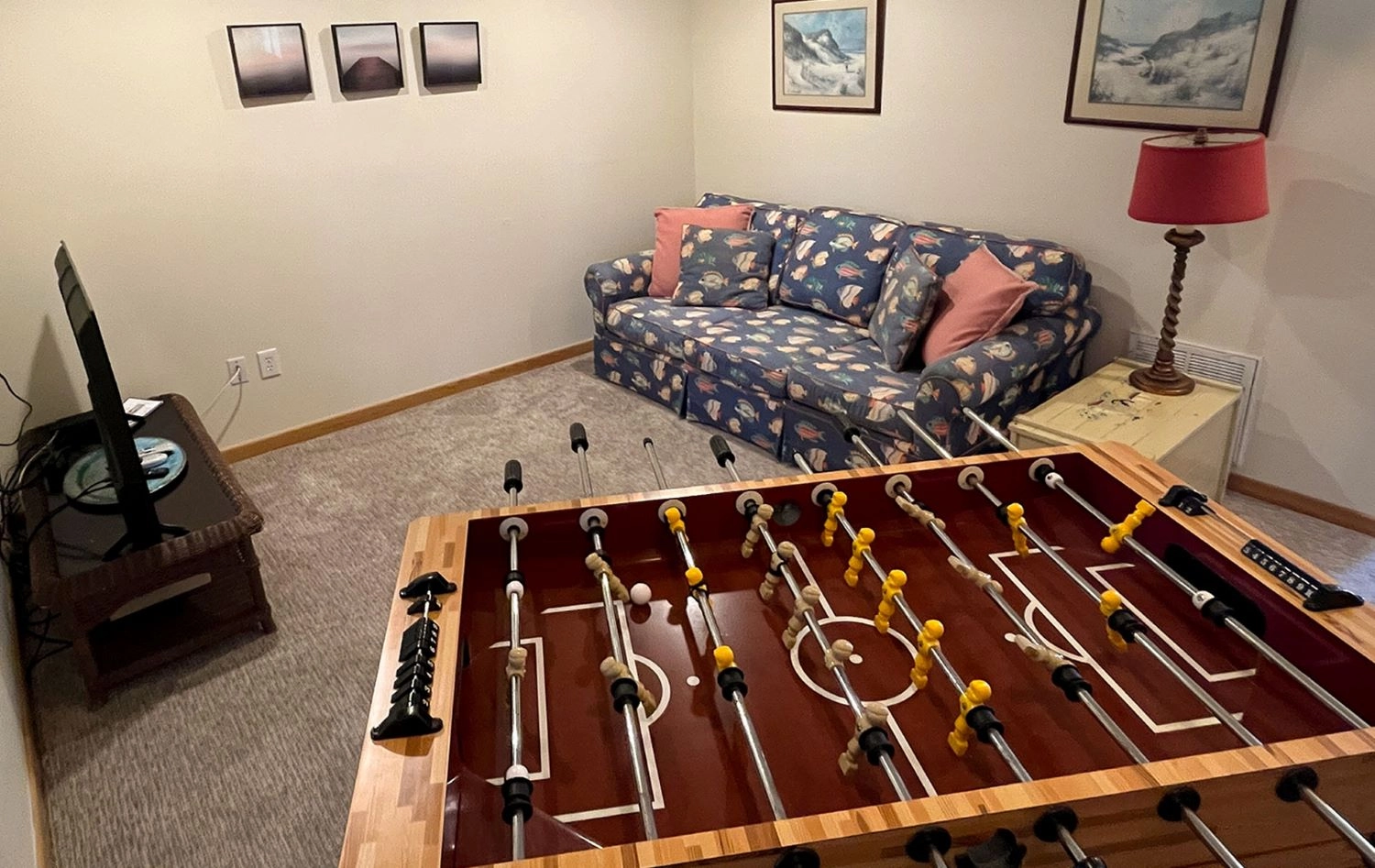 Rec room with foosball; laundry; second refrigerator under stairs.