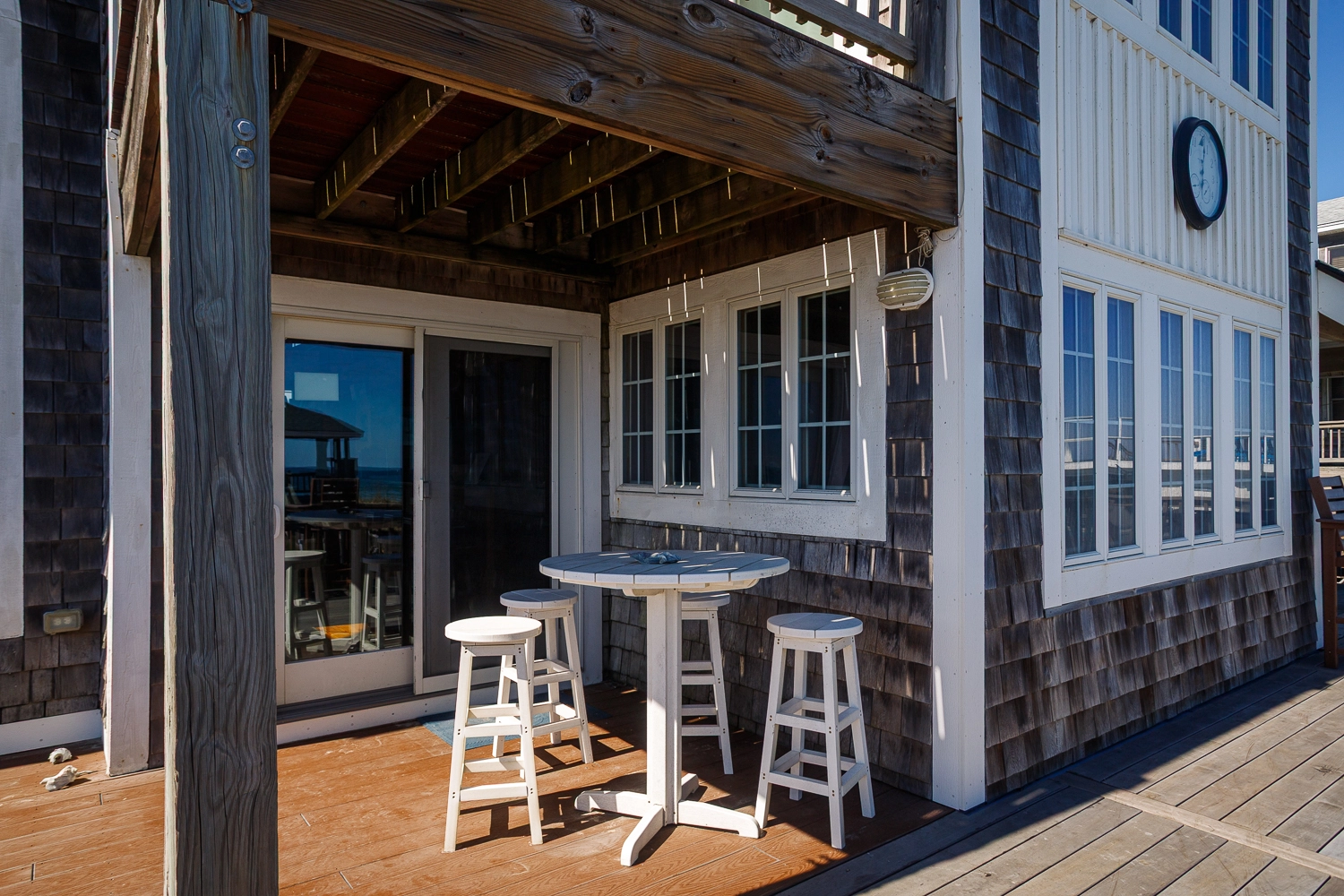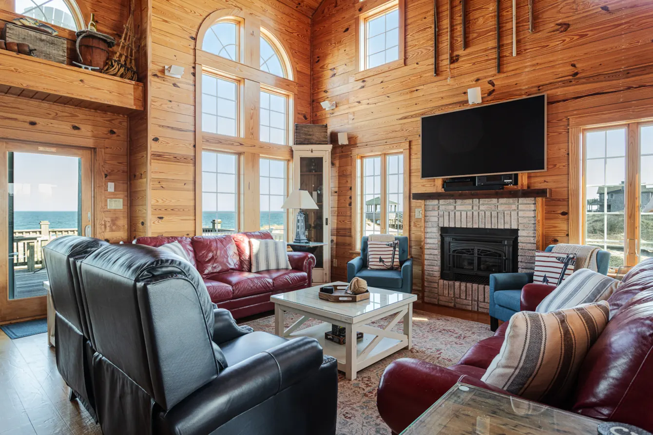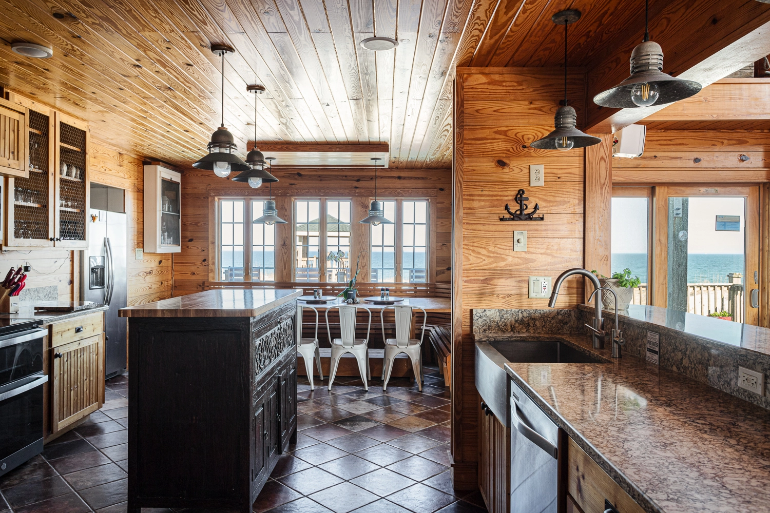 Great room with 2-story beamed vault and gas fireplace, doors open to covered oceanfront deck; gathering room with table seating; retro-styled "pilot house" kitchen, pantry; access to porch overlooking the ocean.