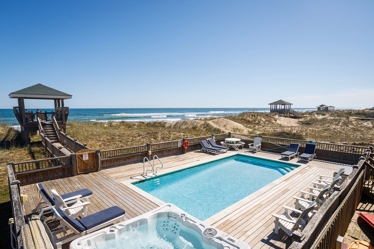 "This home is perfectly located. It's right at the end of the NC border (so it is quiet and has less traffic). The house has a wonderful pool, hot tub and well- stocked kitchen. The kitchen had all the items you would need (baking dishes galore, mixing bowls, crock pot, blender, baking sheets, hand mixer, several huge stock pots for seafood boils, 2 full sized refrigerators w/ freezers). We had a family of 6 adults and 6 kids and we brought a LOT of food. We had no issues with storing any food in the kitchen pantry and 2 refrigerator/freezers. Items we would like to see improved in the house are the quality of the mattresses in the bedrooms. The door knobs were odd and hard to open some doors (kids and parents alike got stuck in the main floor's bathroom). The TV was a little outdated and the surround sound system kept failing. This was extremely annoying when the kids were all watching a movie. When the sounds fails we had to restart the sound system. I really hope that gets updated this year. All in all you can't beat a huge house that's ocean front and has a pool and hot tub!"