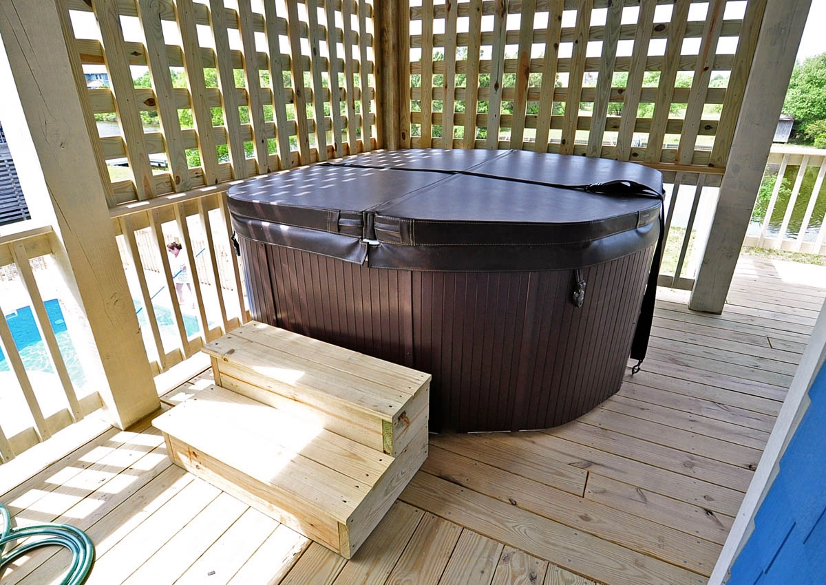Screened porch with second refrigerator; hot tub.