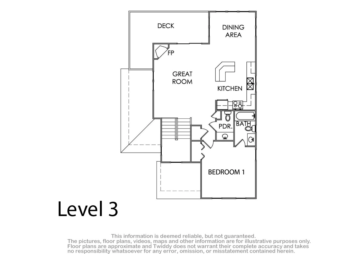 Great room; kitchen; dining area; deck with table and chairs for outdoor dining.