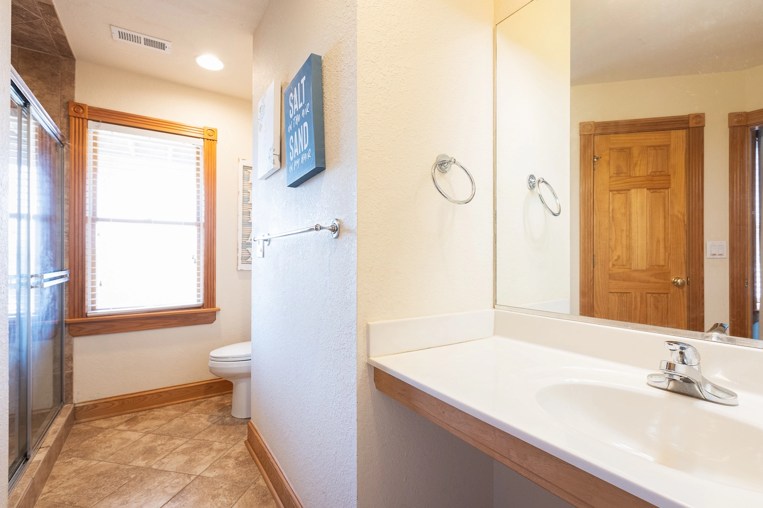 Oceanside, King with 34" doors, Standing shower with 5" lip, Pedestal sink, Deck access