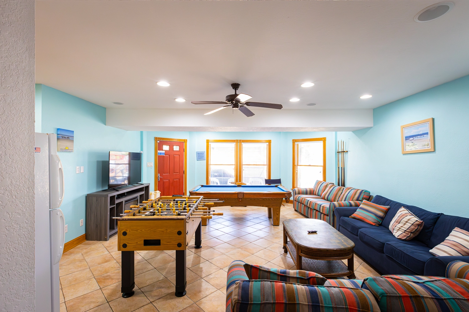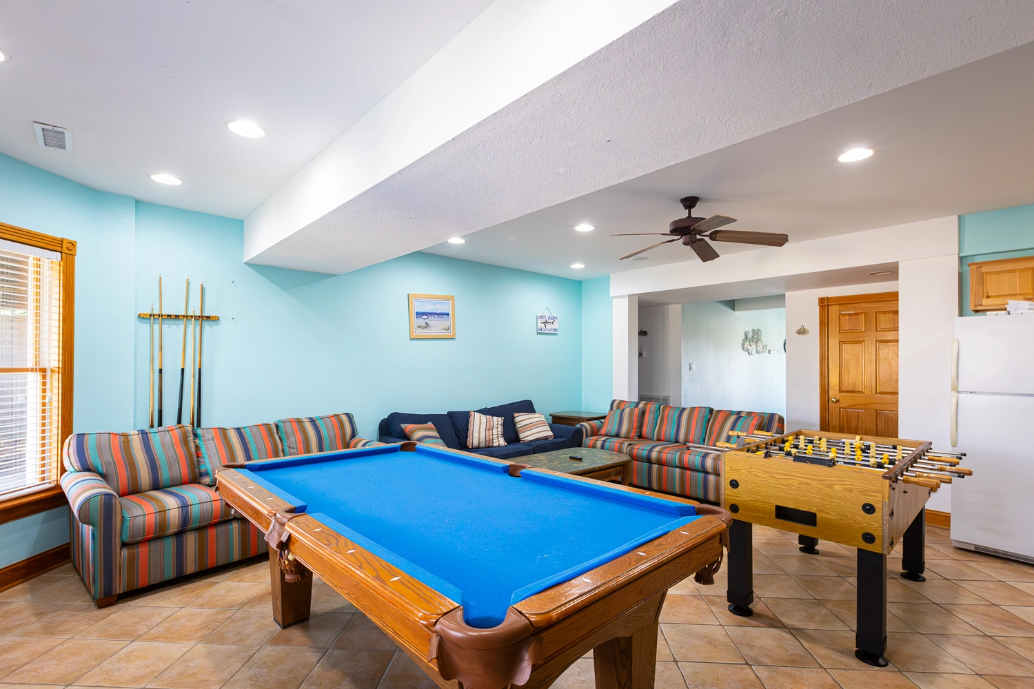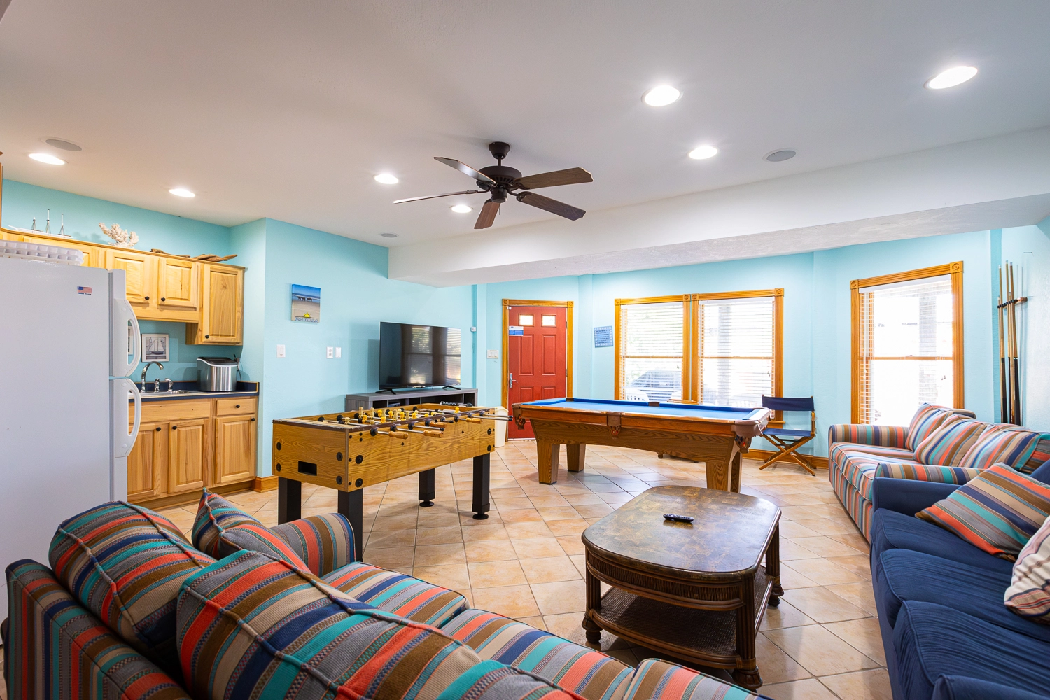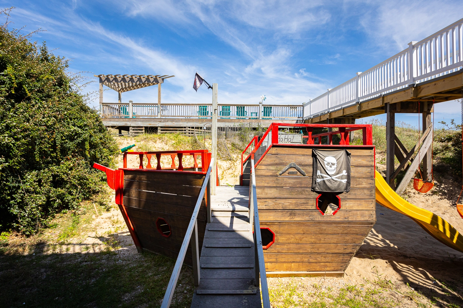 Rec room (DSS) with pool table, wet bar and refrigerator; laundry; pirate ship and play area; patio with gated private pool and hot tub; outdoor shower; fish-cleaning station; gas grill.