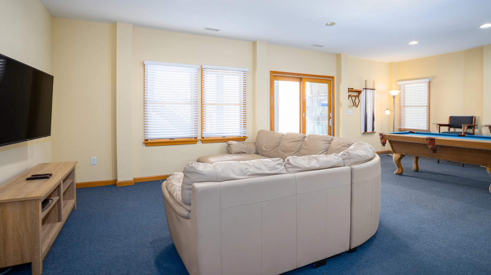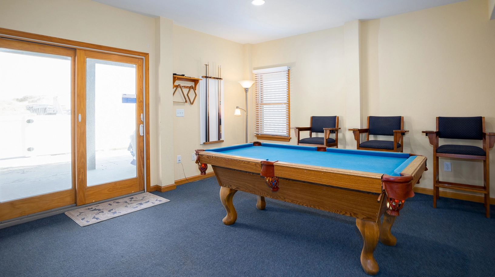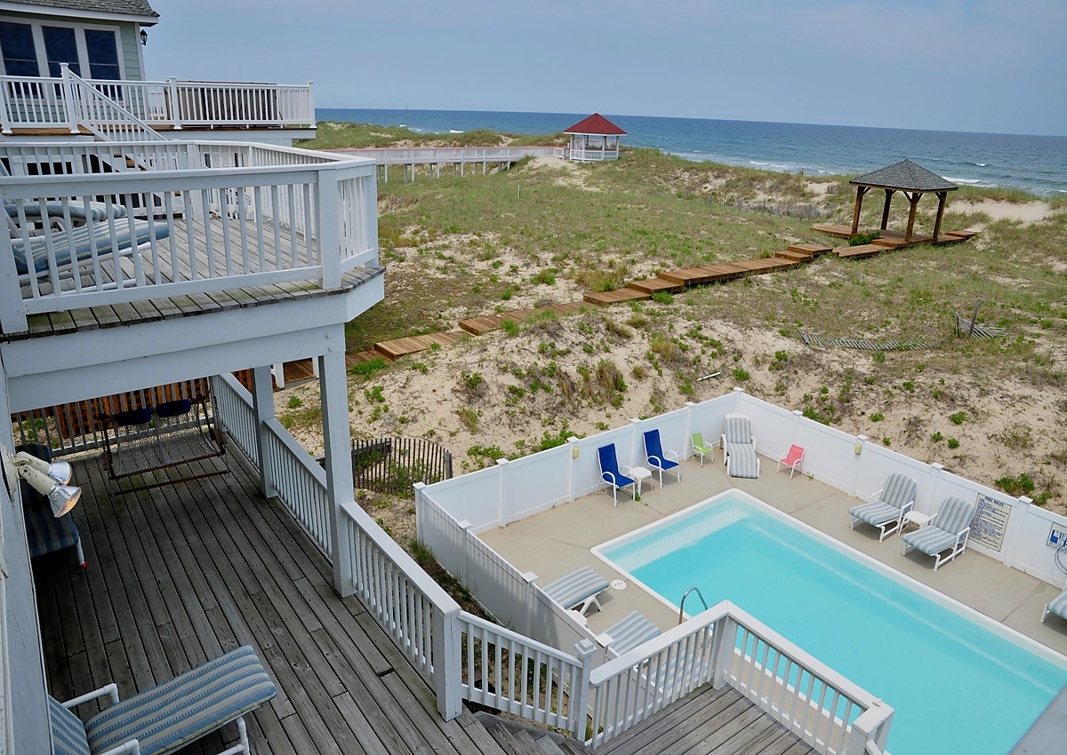 Game room with pool table, wet bar and refrigerator; laundry; private pool and kiddie pool; six-person hot tub; outdoor half bath and shower; walkway to dune.