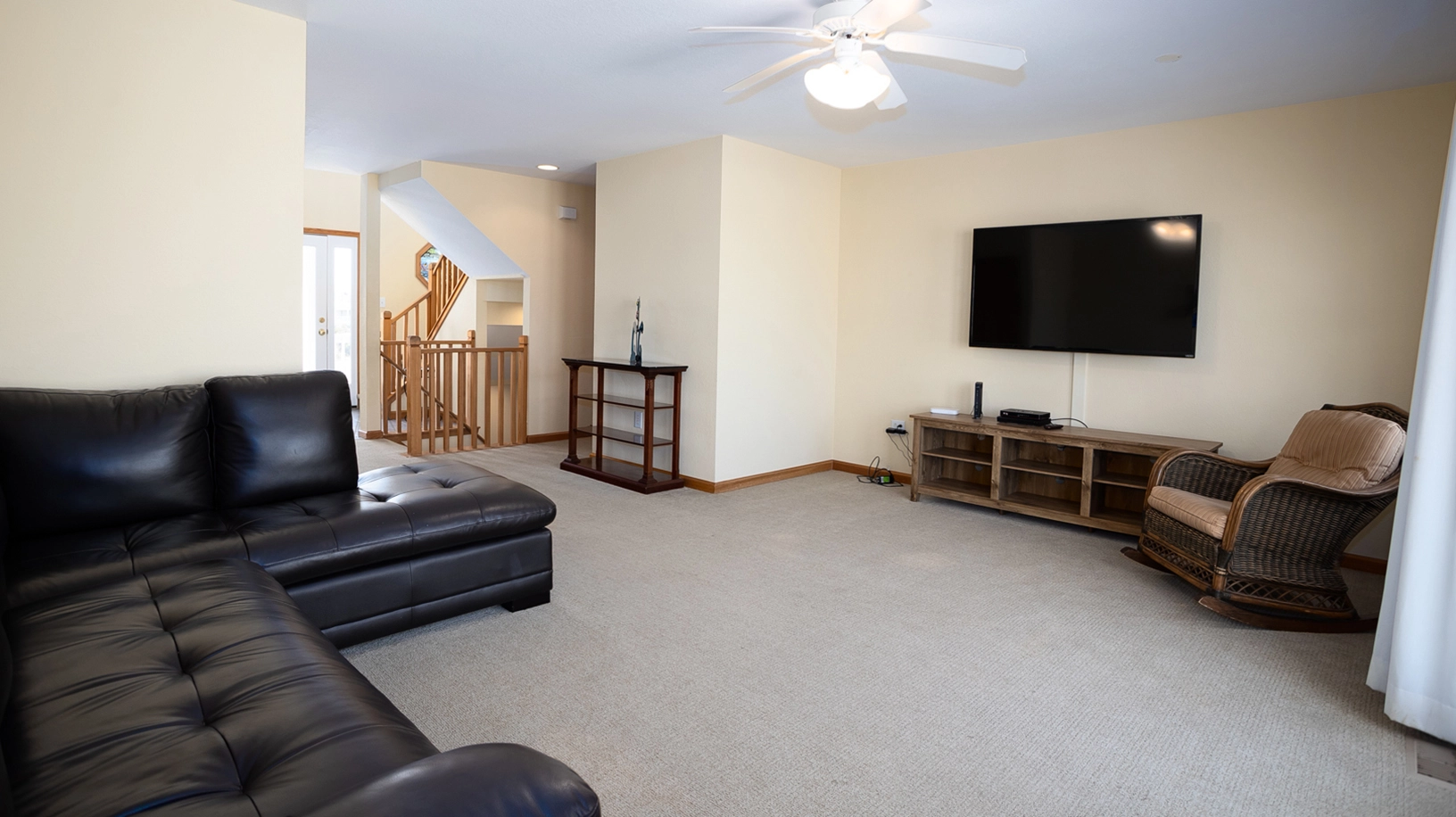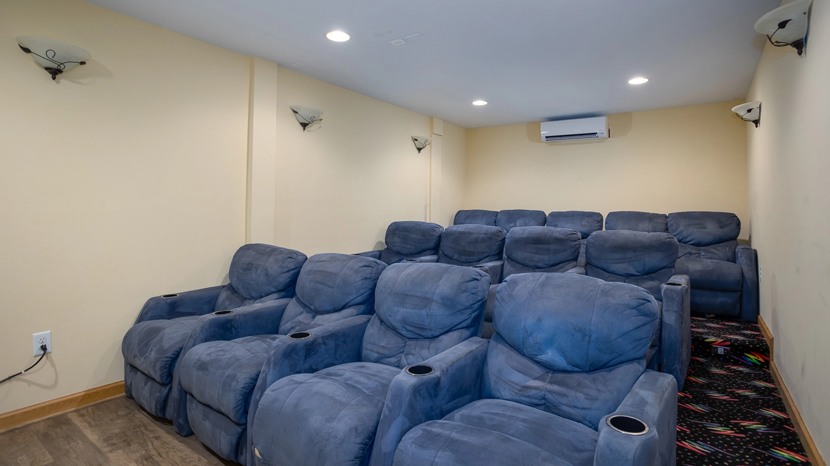 Den with large screen TV; twelve-person theater room accessible from deck only; wrap-around deck; covered entry porch.