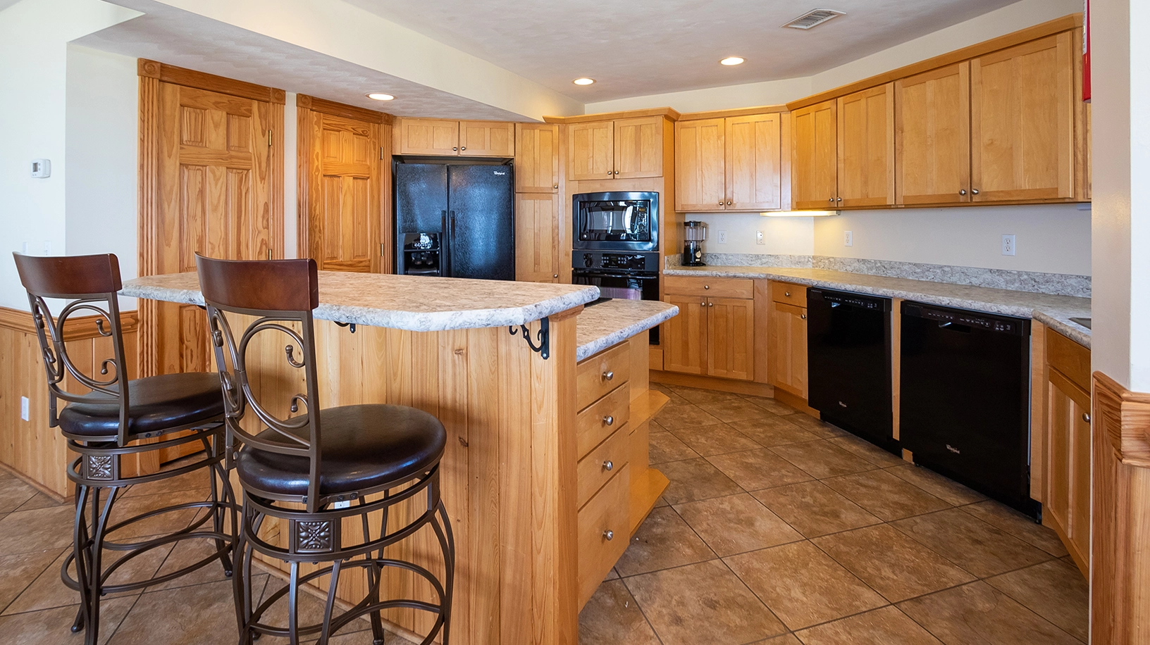 Great room (DSS); kitchen with two dishwashers; dining area.