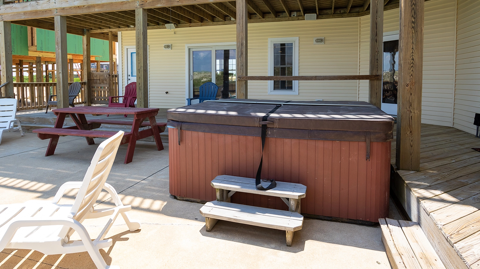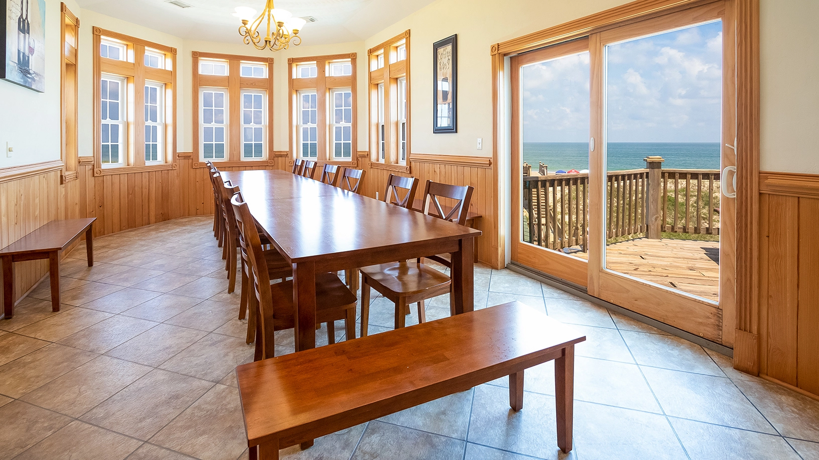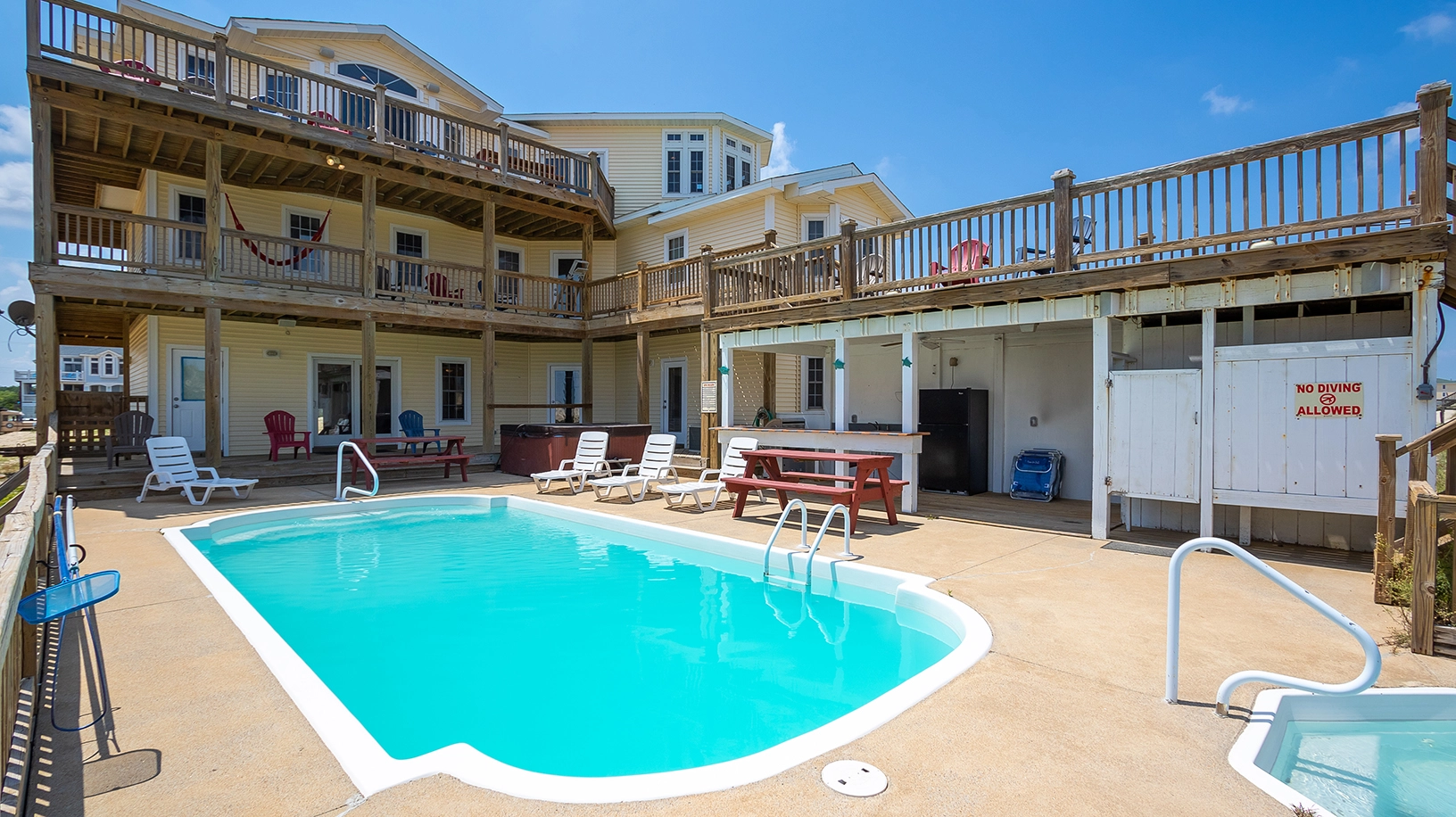 "This house has the layout we were looking for and so many nice amenities. We wanted a house on the 4X4 beaches with a nice pool/outdoor hangout area, open concept hangout area for the group, at least 3 fridges, a decent sized kitchen, is pet friendly, and has a hangout/bar area for the nighttime. This place met and exceeded our expectations! We used the 3rd floor area as our main hangout area which surprised me (thought we'd be on the 1st floor level more). The open layout had a nice flow so we could have some people playing games or doing puzzles at the large dining table, pulling up a chair to the center island to talk and enjoy beverages and have people sitting on the couches and chairs and watching the tv or playing a game at the coffee table. The 1st floor level had a great game and bar area and we all enjoyed the outside area with the covered deck and picnic tables to sit at, the covered wet bar/grill area, and, of course, the hot tub and pool. We could even enjoy the outside area at night - last place we were at was 3 houses back from the ocean so there was a lot more bugs. I wish the kitchen had one more oven, but we made do. The double dishwashers came in clutch for large group dinners and keeping the kitchen clean. The stovetop is electric and works very well and the kitchen was mostly well stocked. We loved the large, long dining table. We could get almost the whole group there plus have a few people at the kitchen island areas for group dinners. The house has a full house sound system, but we could only figure out how to work the first floor and outdoor pool deck area. Would love to figure out the 2nd and 3rd floors for full sound! The walkway to the beach was so nice and made it to easy for the group to pivot back and forth from the beach to the house/pool."