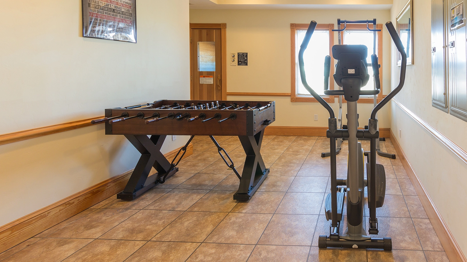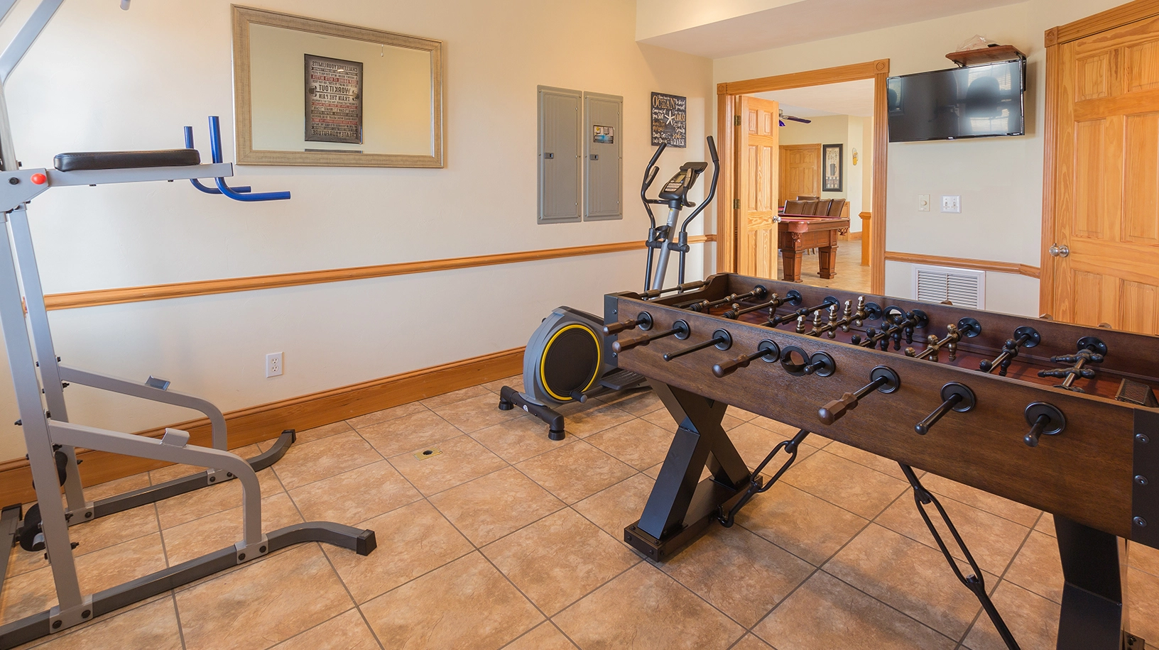 Fitness room with foosball; sauna; media room; rec room with pool table and sports bar; poolside cabana wet bar.