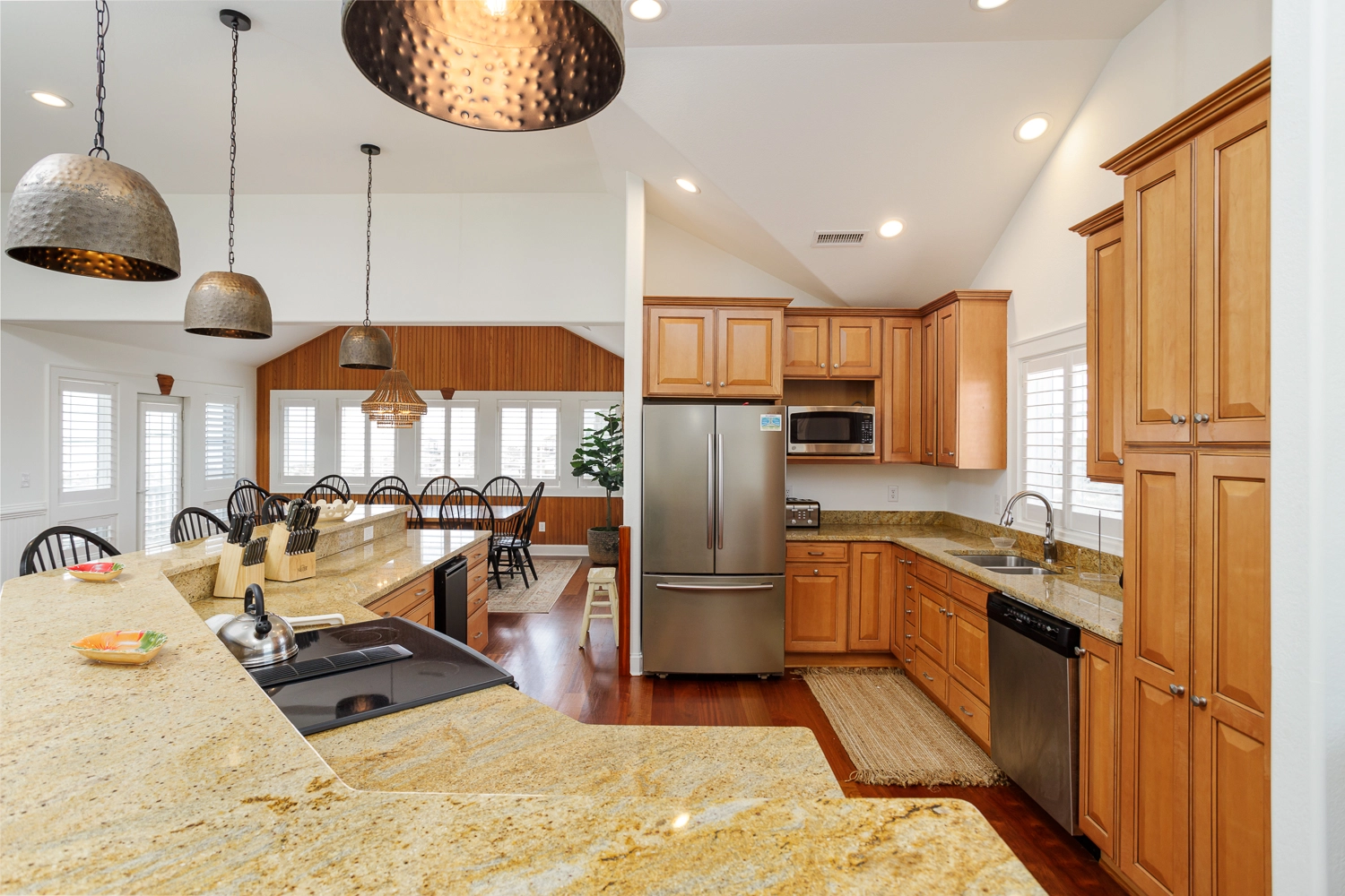 Great room with gas fireplace; kitchen with ice machine; dining area.