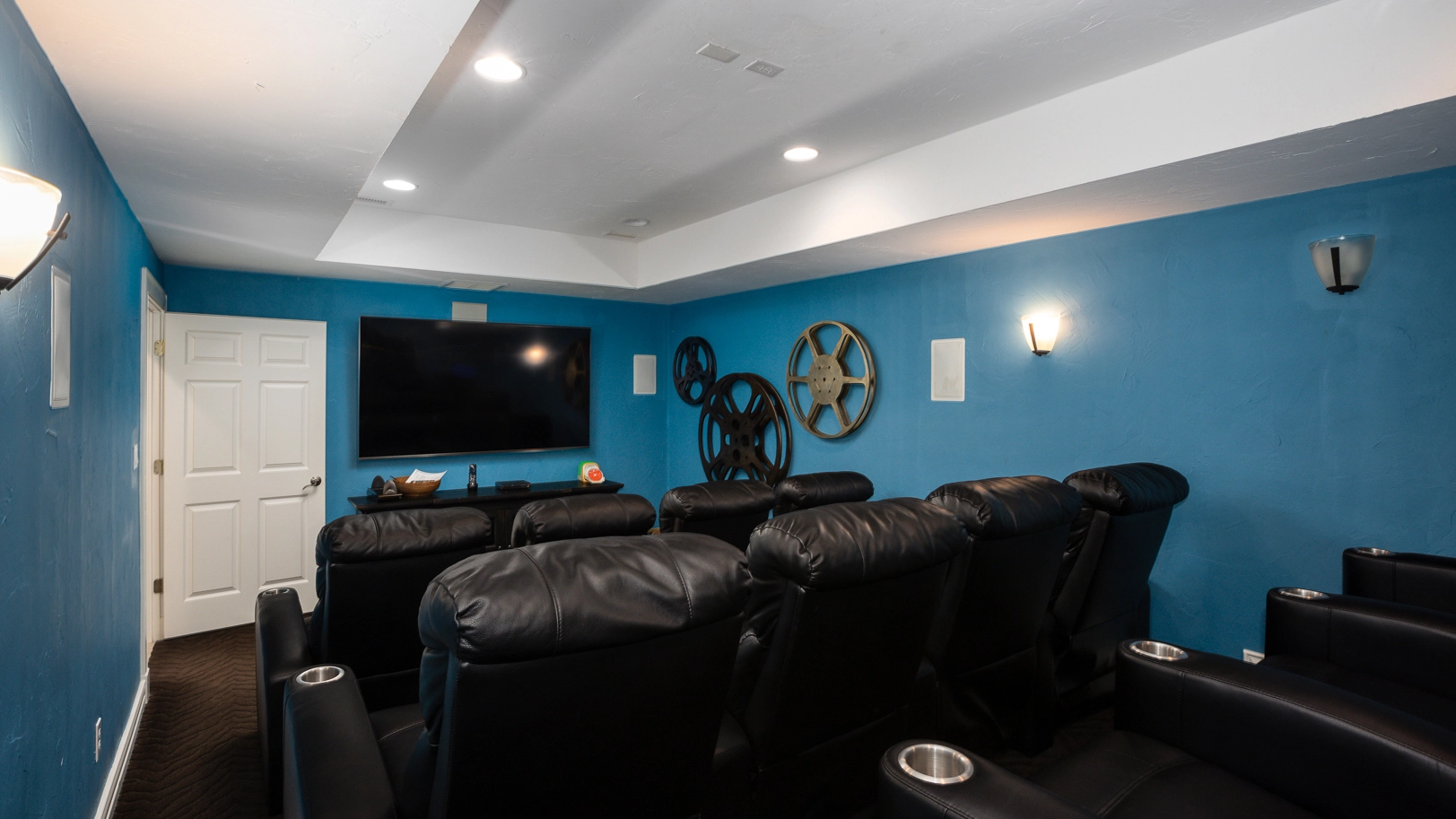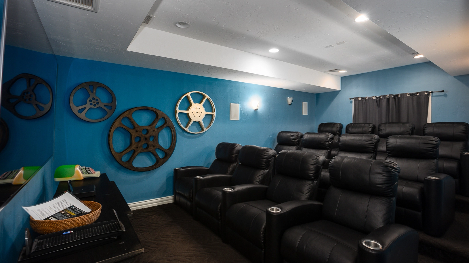 Rec room with a pool table, ping pong table, shuffleboard table, skee-ball and a kitchenette with a sink, dishwasher and refrigerator; theater room with tiered seating; double laundry.