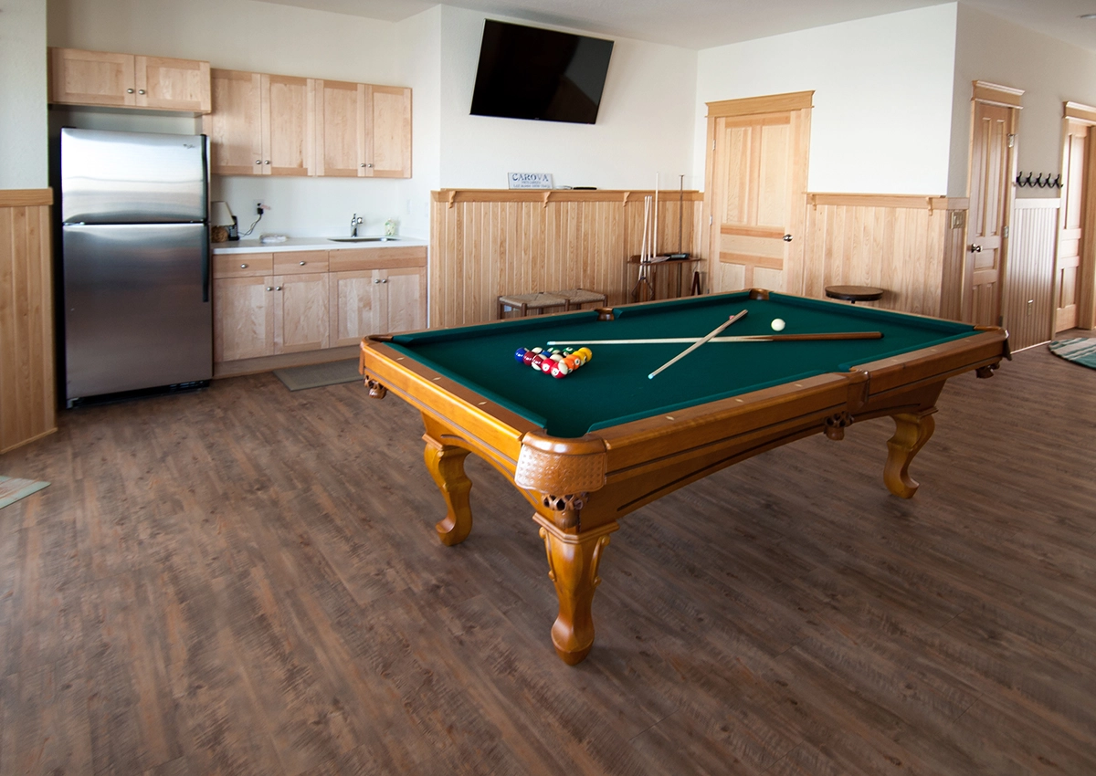 Rec room with pool table and kitchenette with full size refrigerator; laundry.
