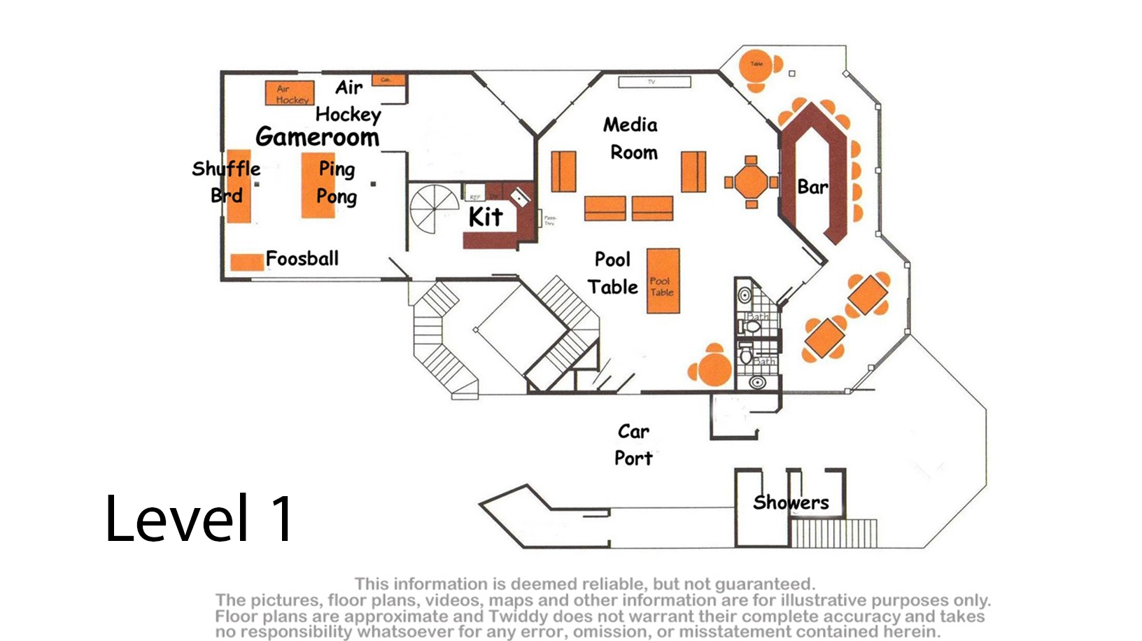 Recreation room with ping pong, foosball and shuffleboard; service kitchen; media room with pool table and poker table; patio with private pool, hot tub, poolside bar and half bath accessible from the outside only.