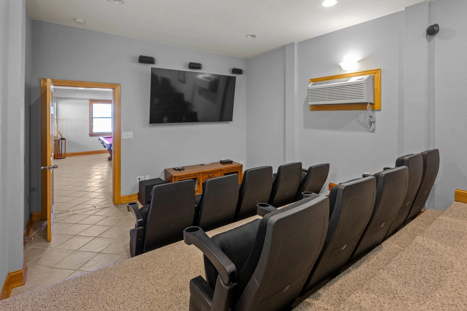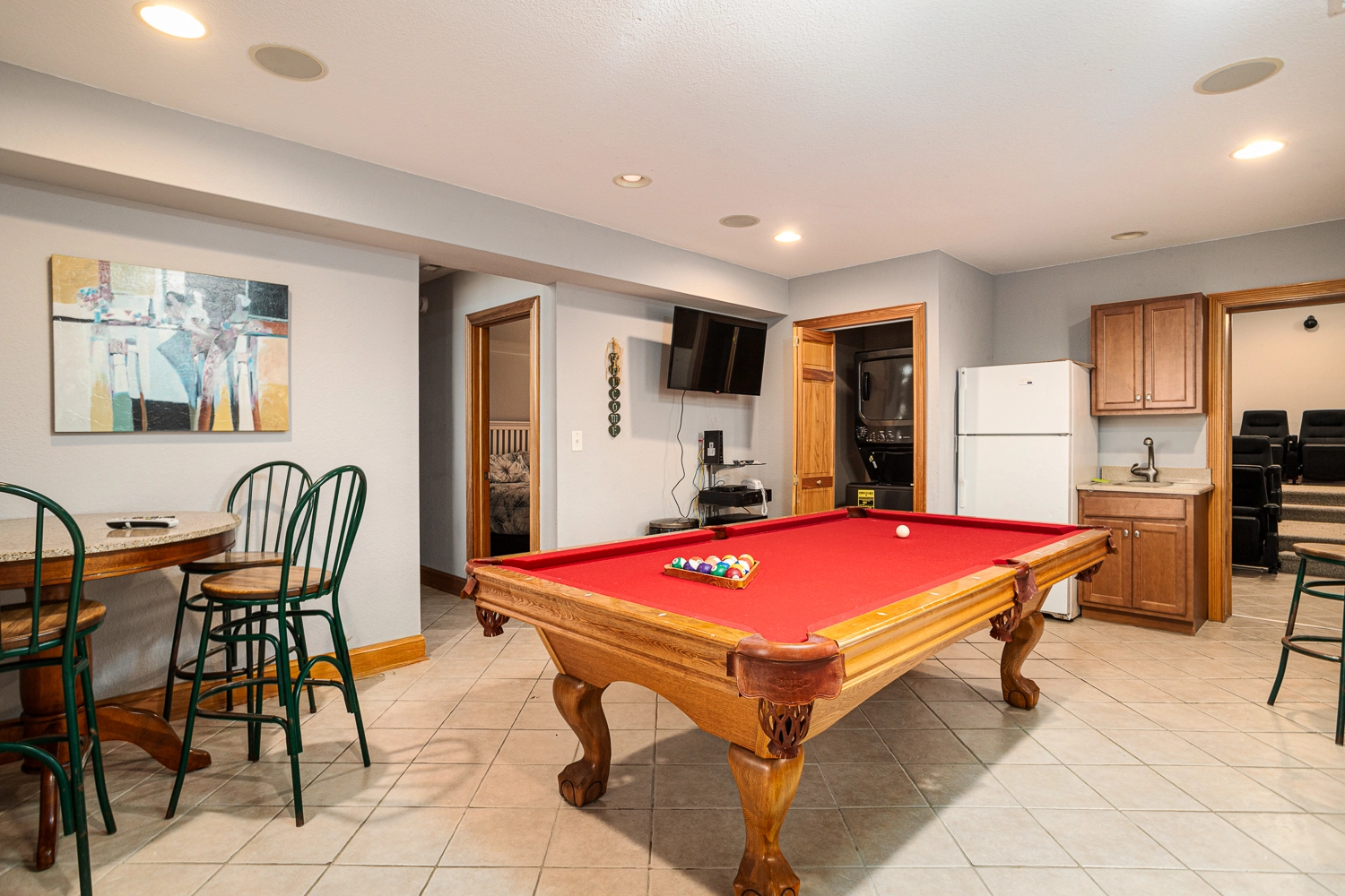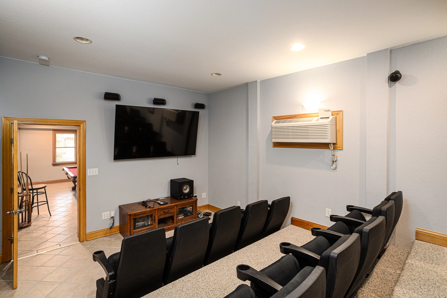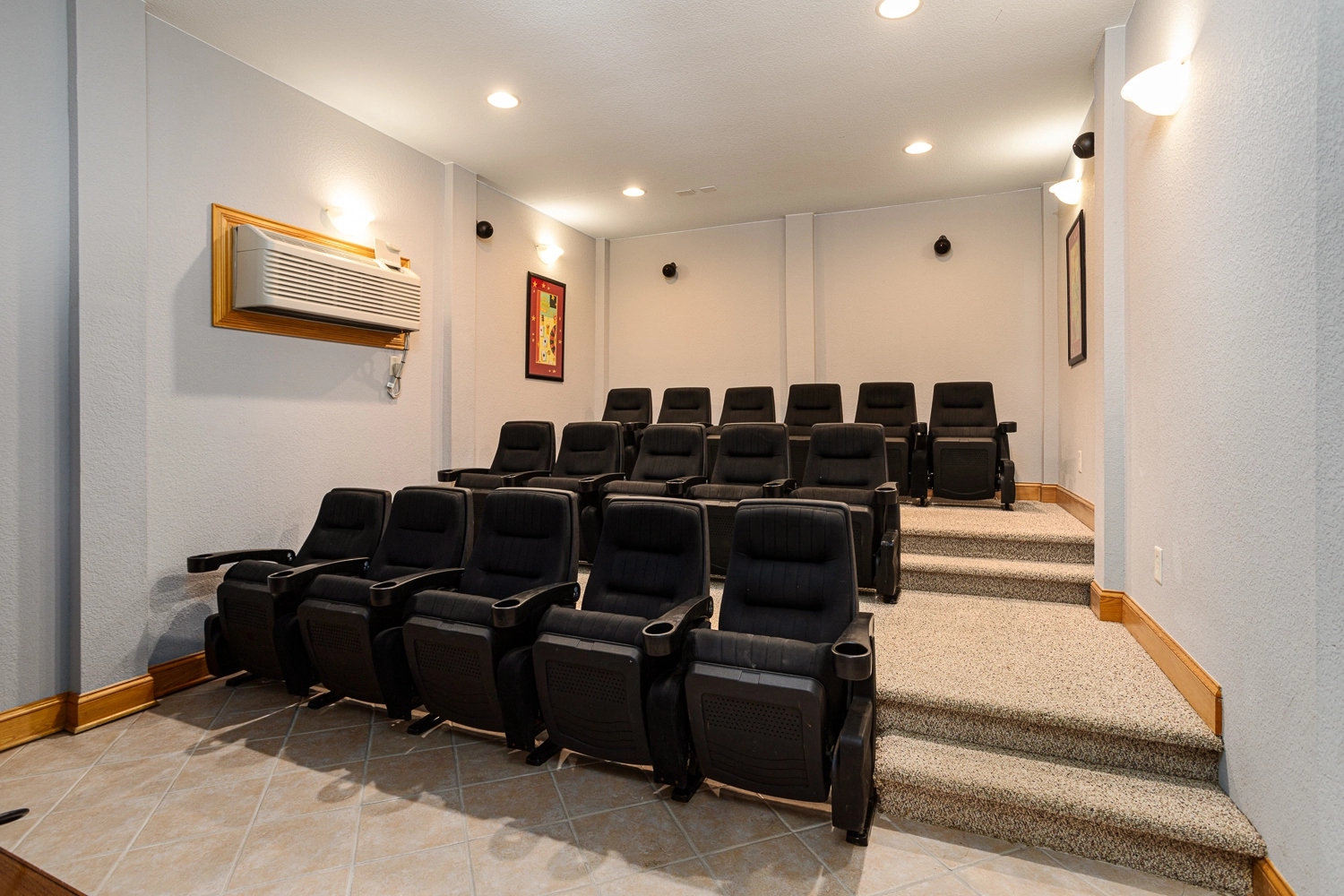 Rec room with pool table and full-size refrigerator; 16-seat tiered theatre room; laundry.