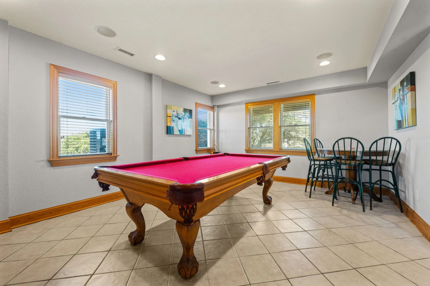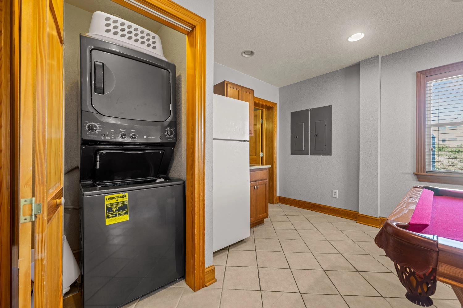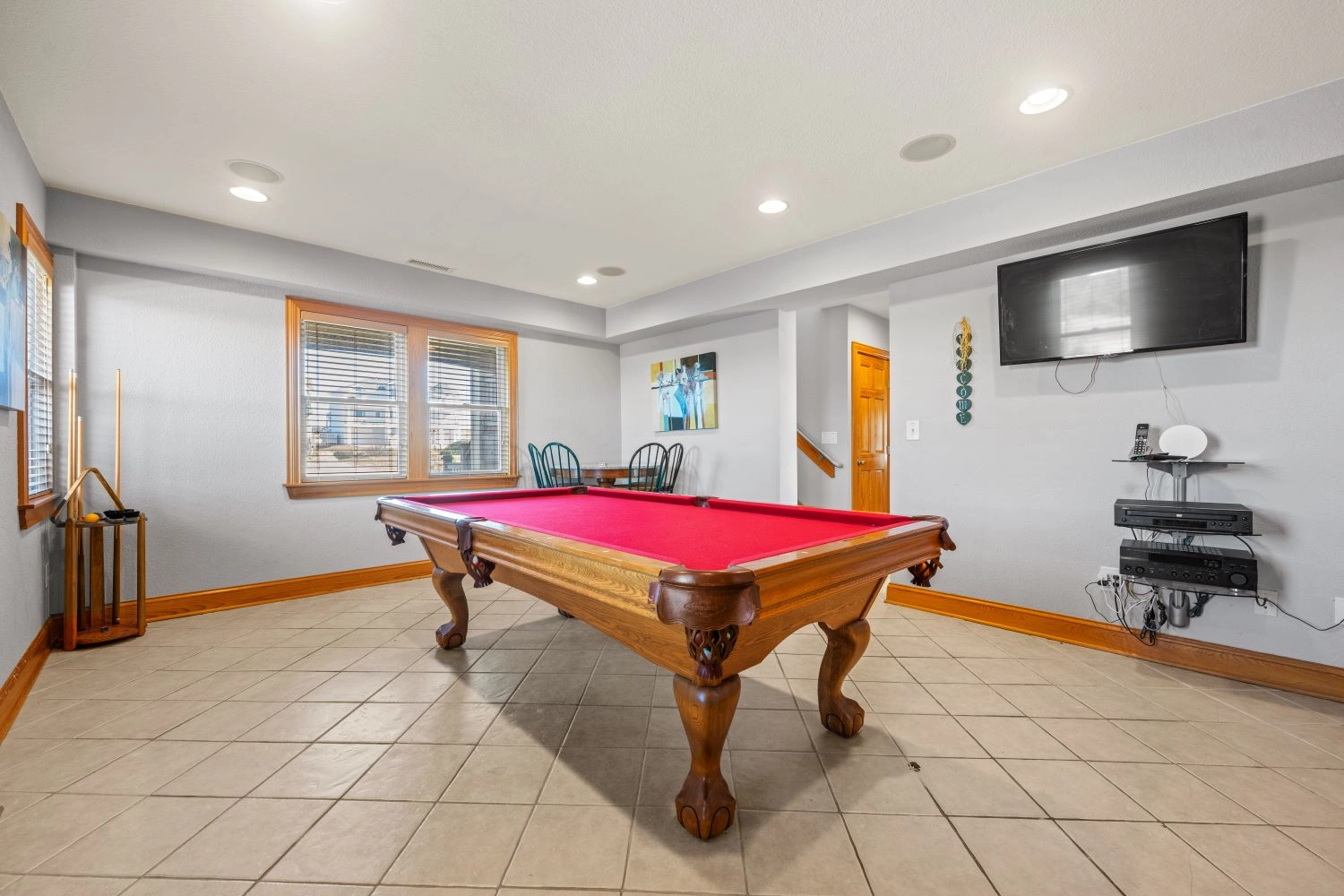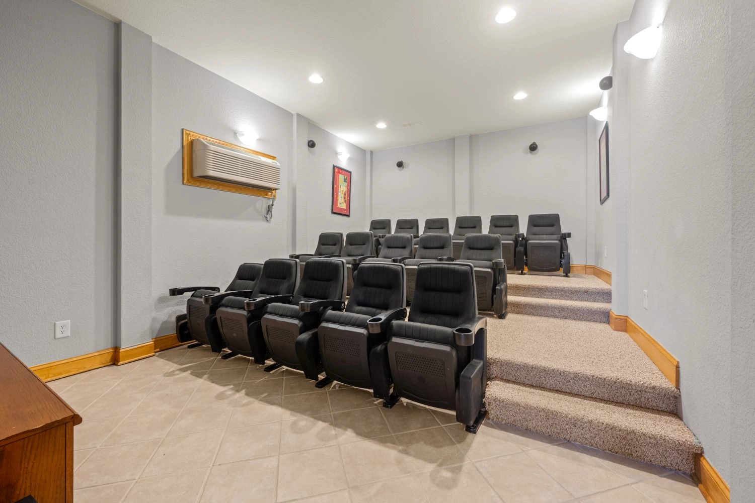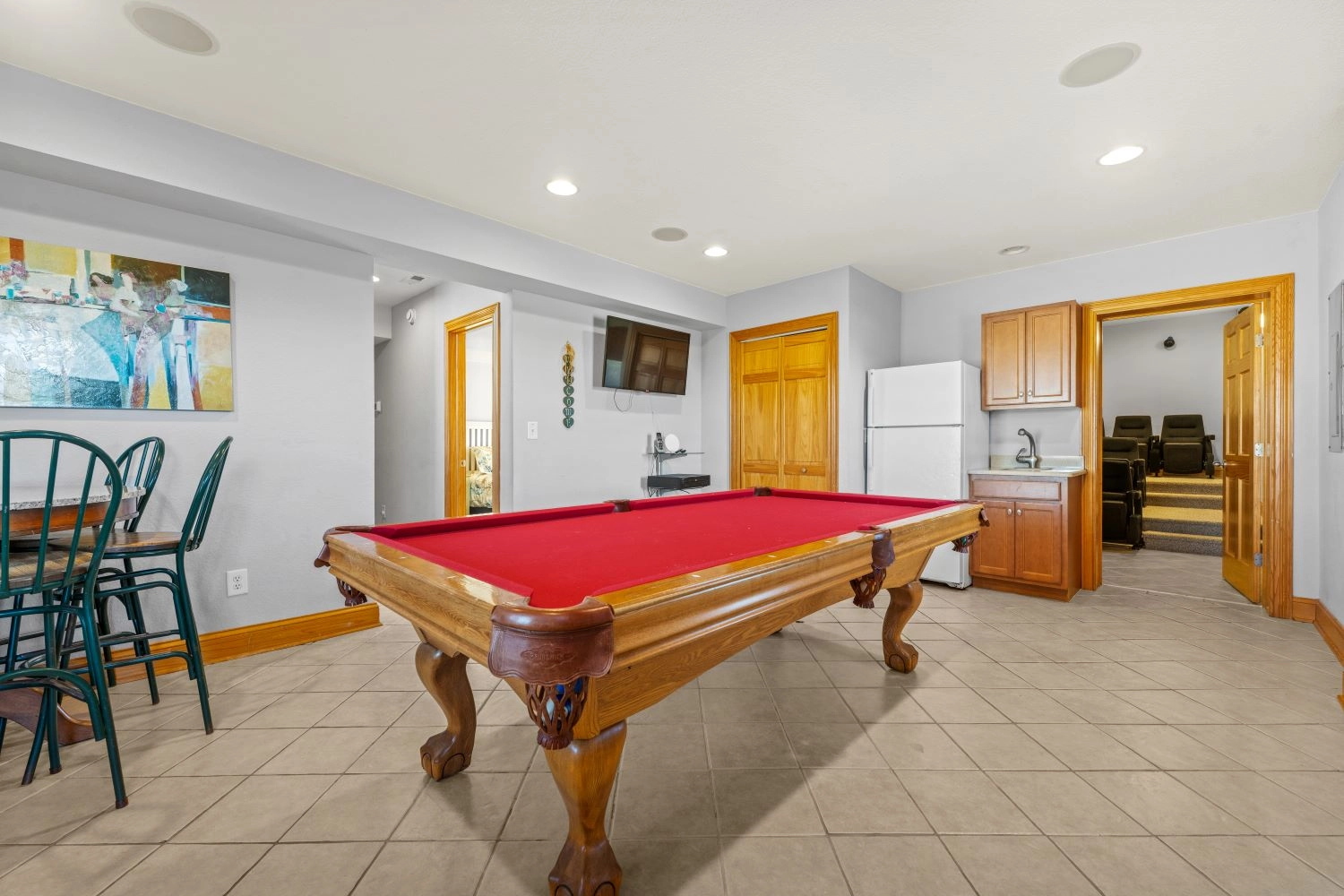 Rec room with pool table and full-size refrigerator; 16-seat tiered theatre room; laundry.
