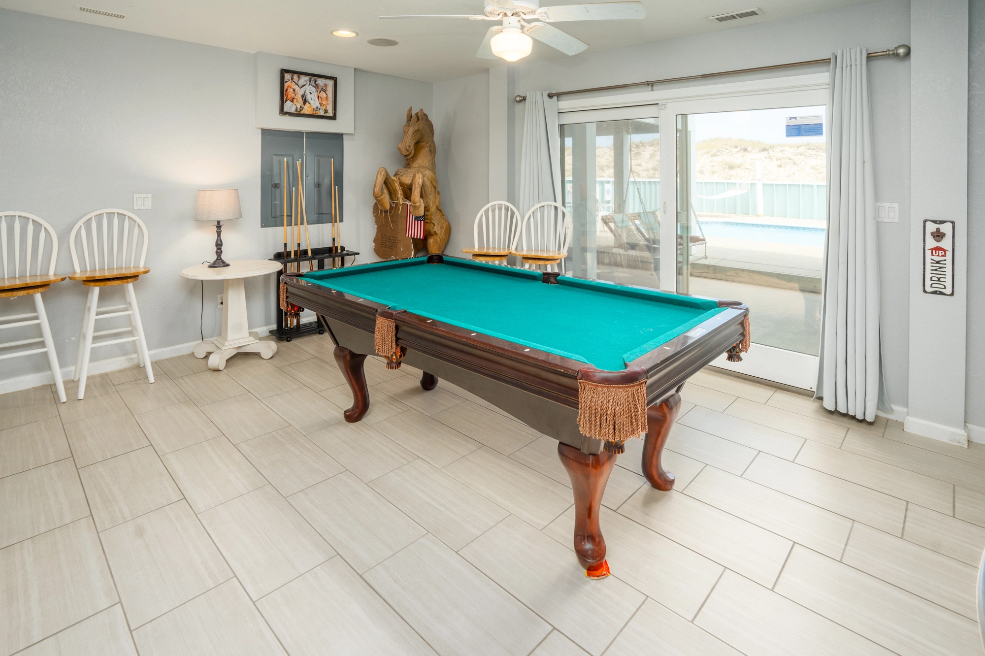 "This home has everything you could wish for : oceanfront, pool, large hot tub, game room, lots of space with smaller sitting areas and larger gathering spaces, all bedrooms have their own bathroom, a well stocked kitchen, beautiful interiors, comfy beds, gorgeous tile work and lighting, horses and sand roads. We also loved being close to False Cape State Park trails. The beach is really nice in this area - great for running, walking, biking. Definitely recommend this house!"
