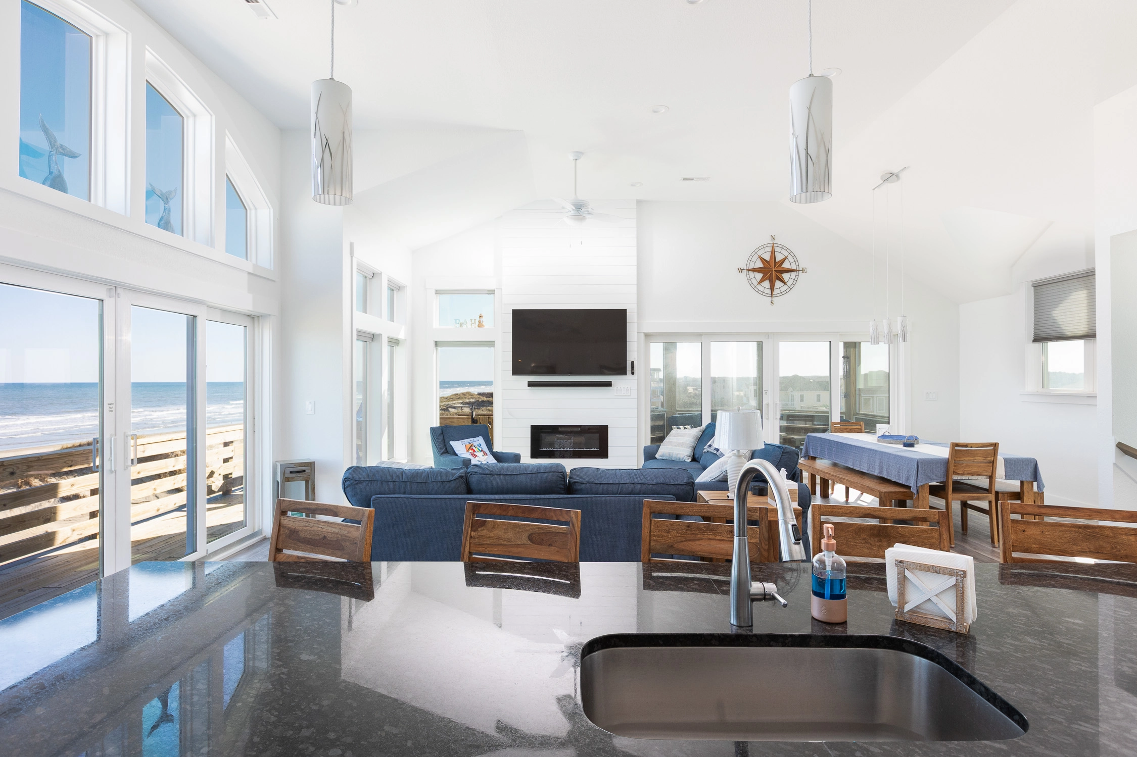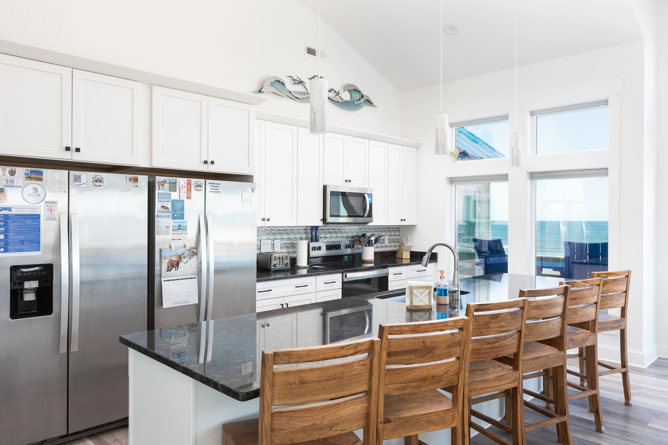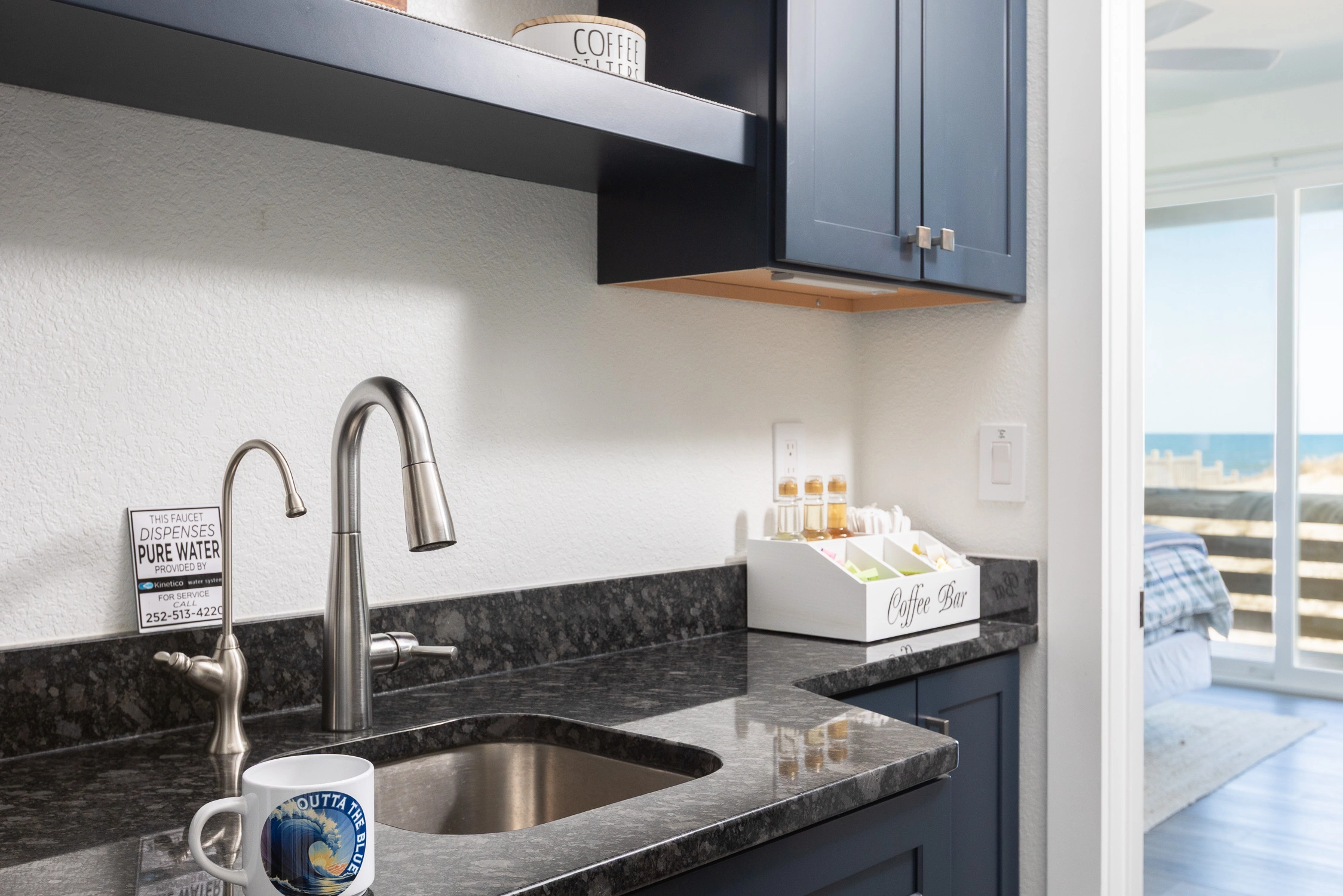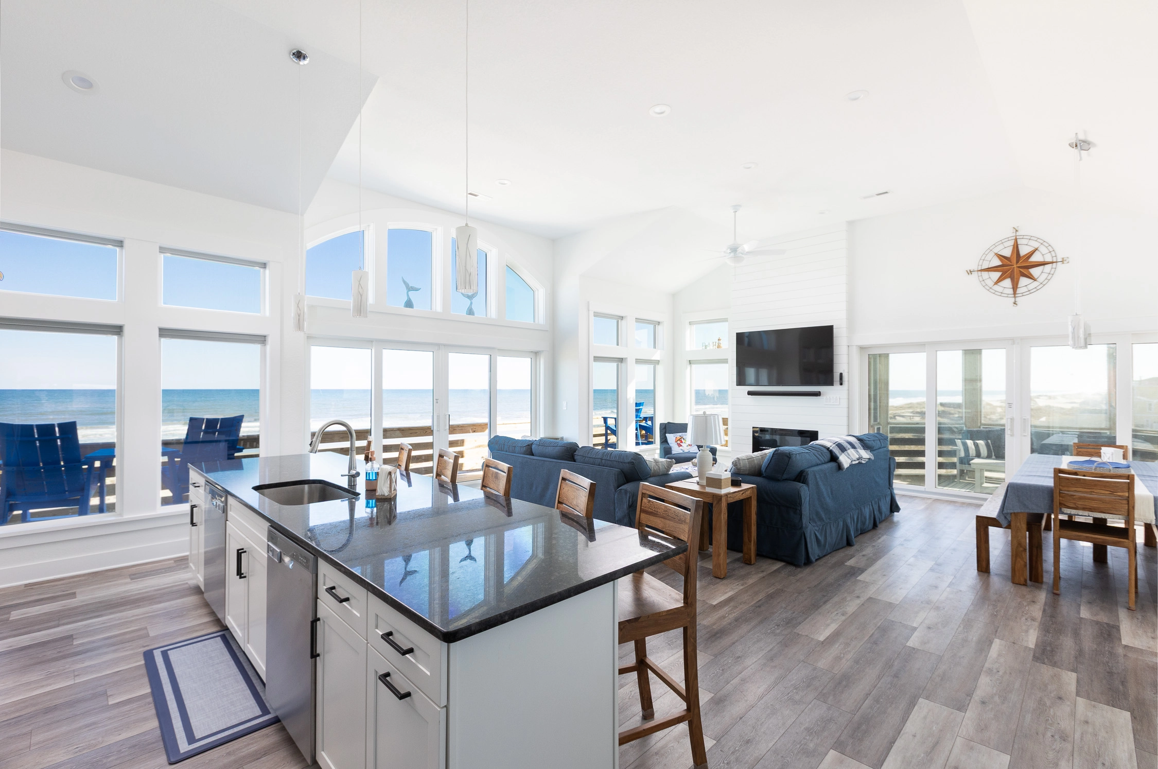 "Outta the Blue excels in “the little things.” My family and I have been coming to OBX for YEARS, and this is the most well-stocked kitchen in any house we’ve stayed at. From the NutriBullet down to the custom coffee mugs and tumblers, trust you’ll have everything you need. Every light switch was labeled, too! You can tell the owners really care about their guests’ experience and it definitely makes a difference! Above all, despite our rainy and windy week at the beach, the view was sublime. Highly recommend to anyone thinking about booking!"