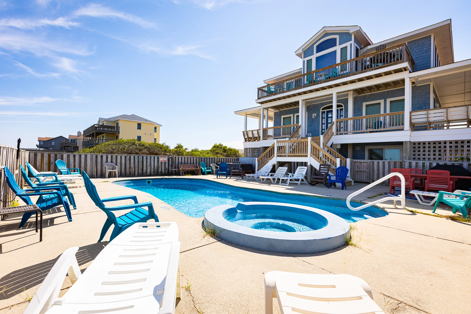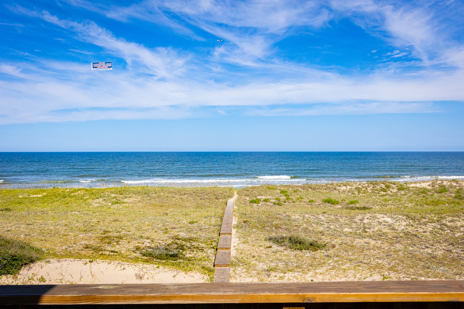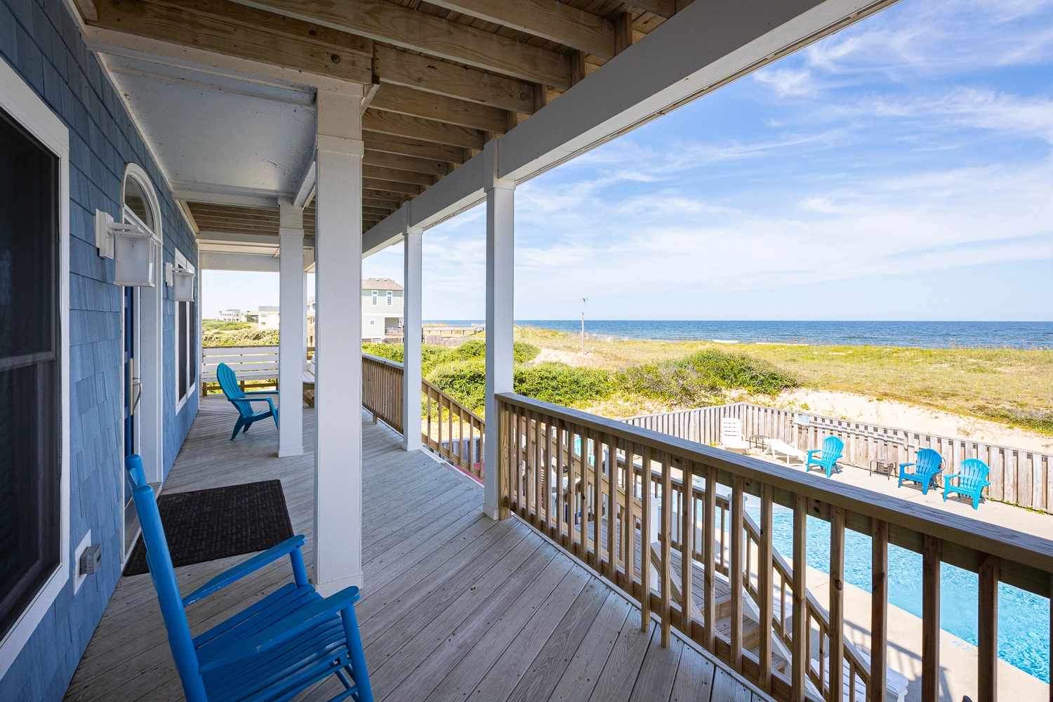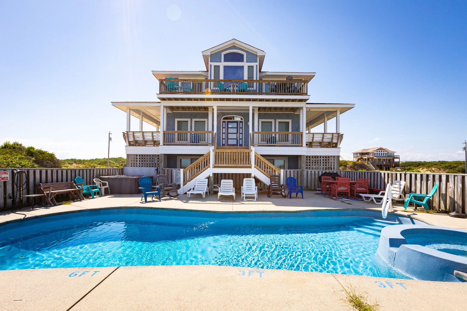 "Spectacular oceanfront views from the unique “ship watch” area of the upper floor. Nicely equipped, new refrigerator. Spacious bedrooms and second kitchenette on first level that provides additional cooler capacity. Wild horses are a daily visitor. Location near NC/VA border means sparsely occupied beach great for setting up your “ beach camp” to enjoy before..or after..your dip in the private pool. Definitely requires 4x4 vehicle."