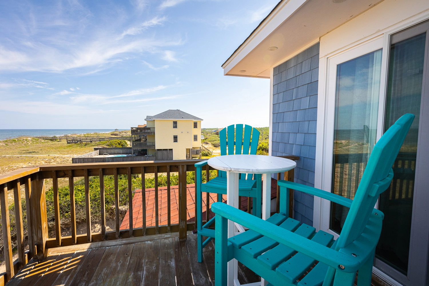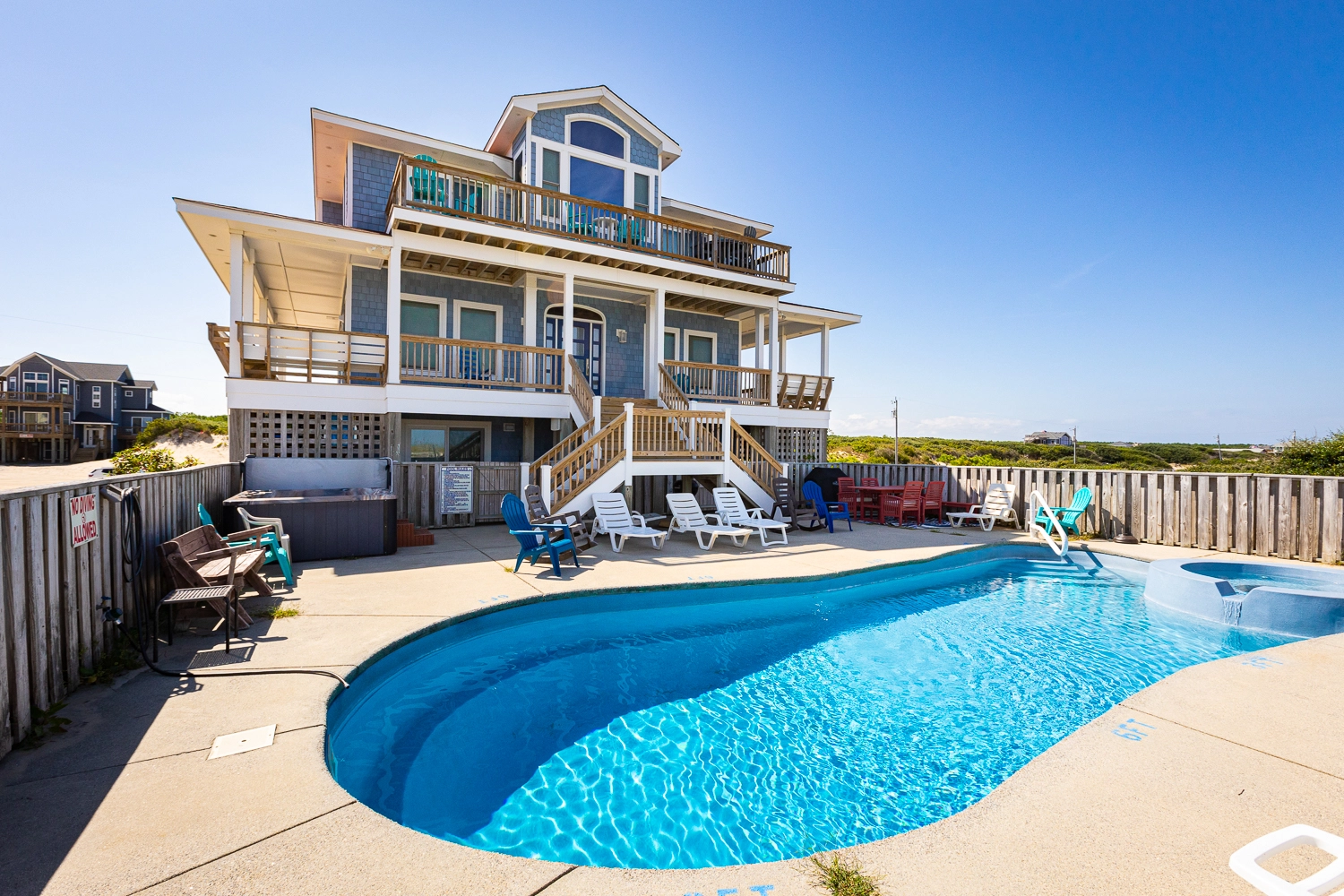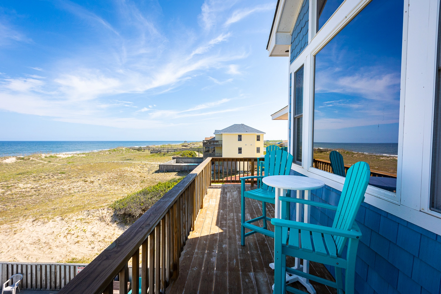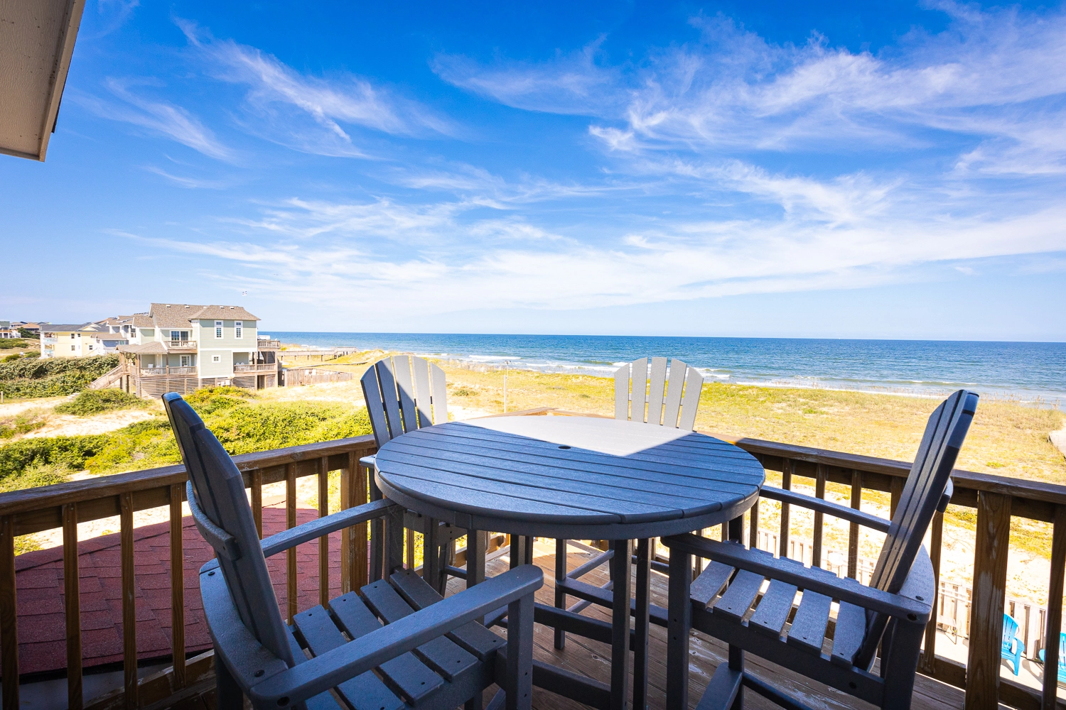 "Spectacular oceanfront views from the unique “ship watch” area of the upper floor. Nicely equipped, new refrigerator. Spacious bedrooms and second kitchenette on first level that provides additional cooler capacity. Wild horses are a daily visitor. Location near NC/VA border means sparsely occupied beach great for setting up your “ beach camp” to enjoy before..or after..your dip in the private pool. Definitely requires 4x4 vehicle."