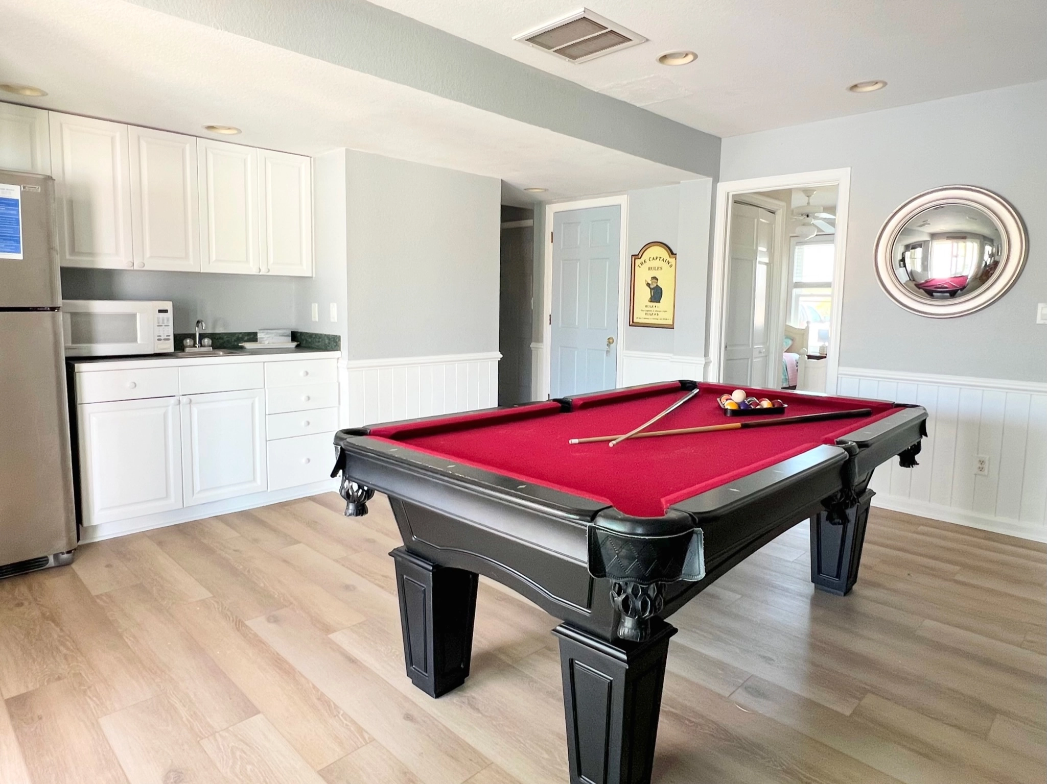 Game room with pool table and kitchenette with wet bar, microwave, refrigerator and sink; patio with private pool.