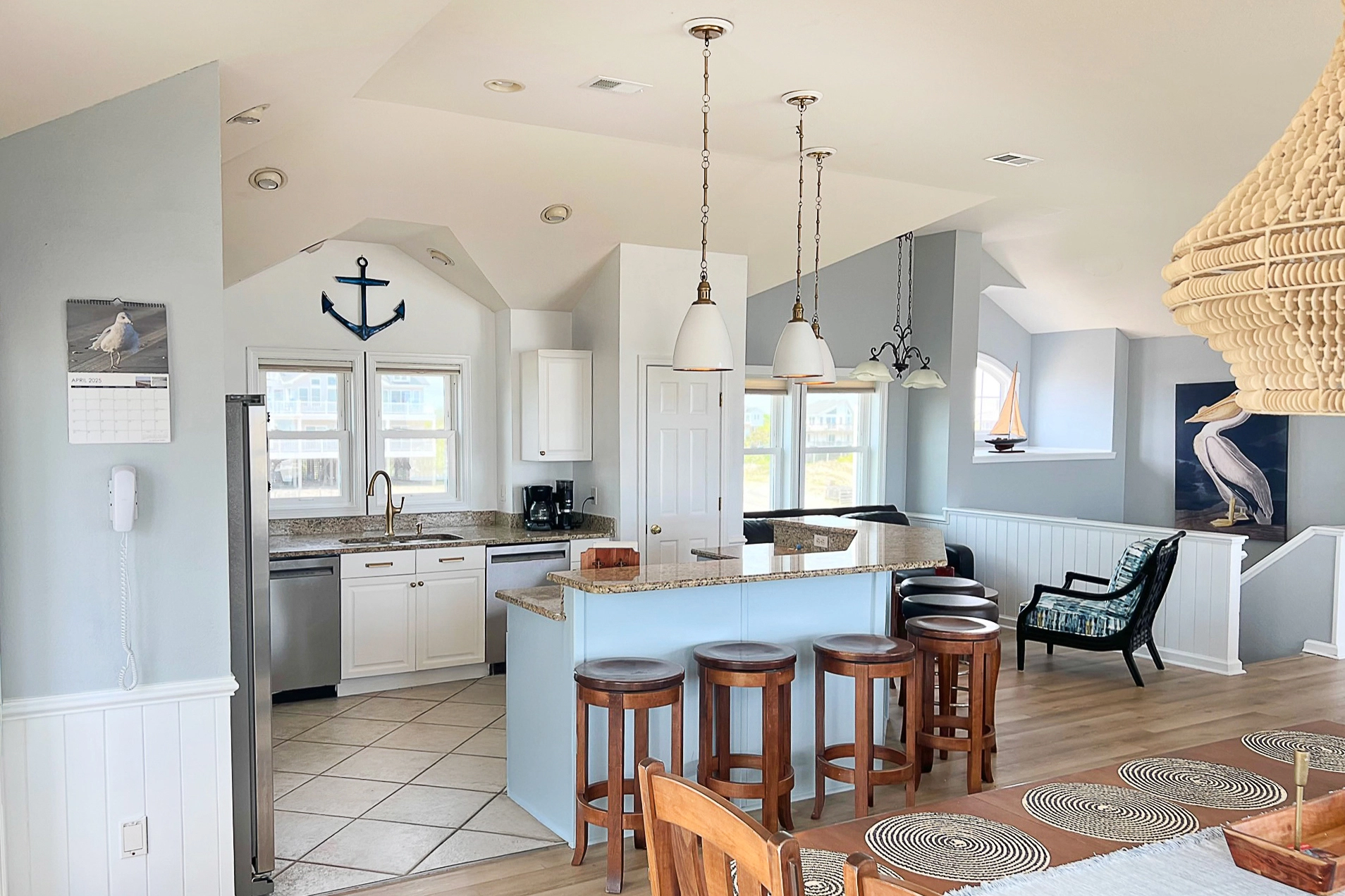 Great room with surround sound; kitchen with two dishwashers; dining area; ship's watch; screened porch with picnic table.