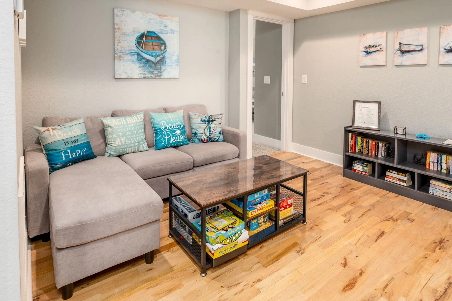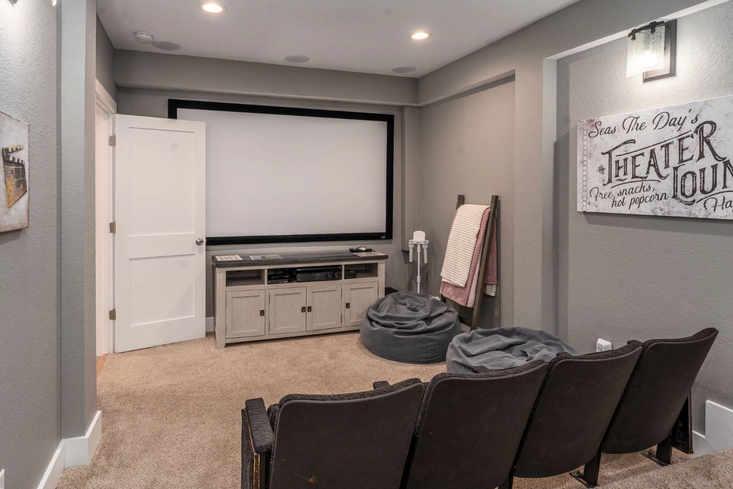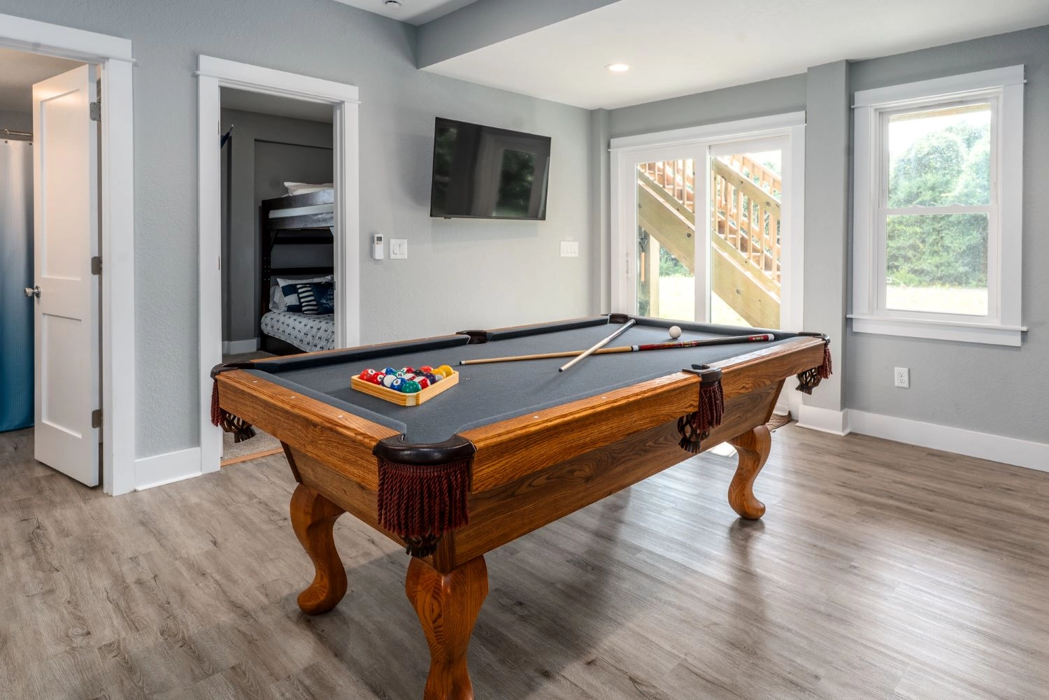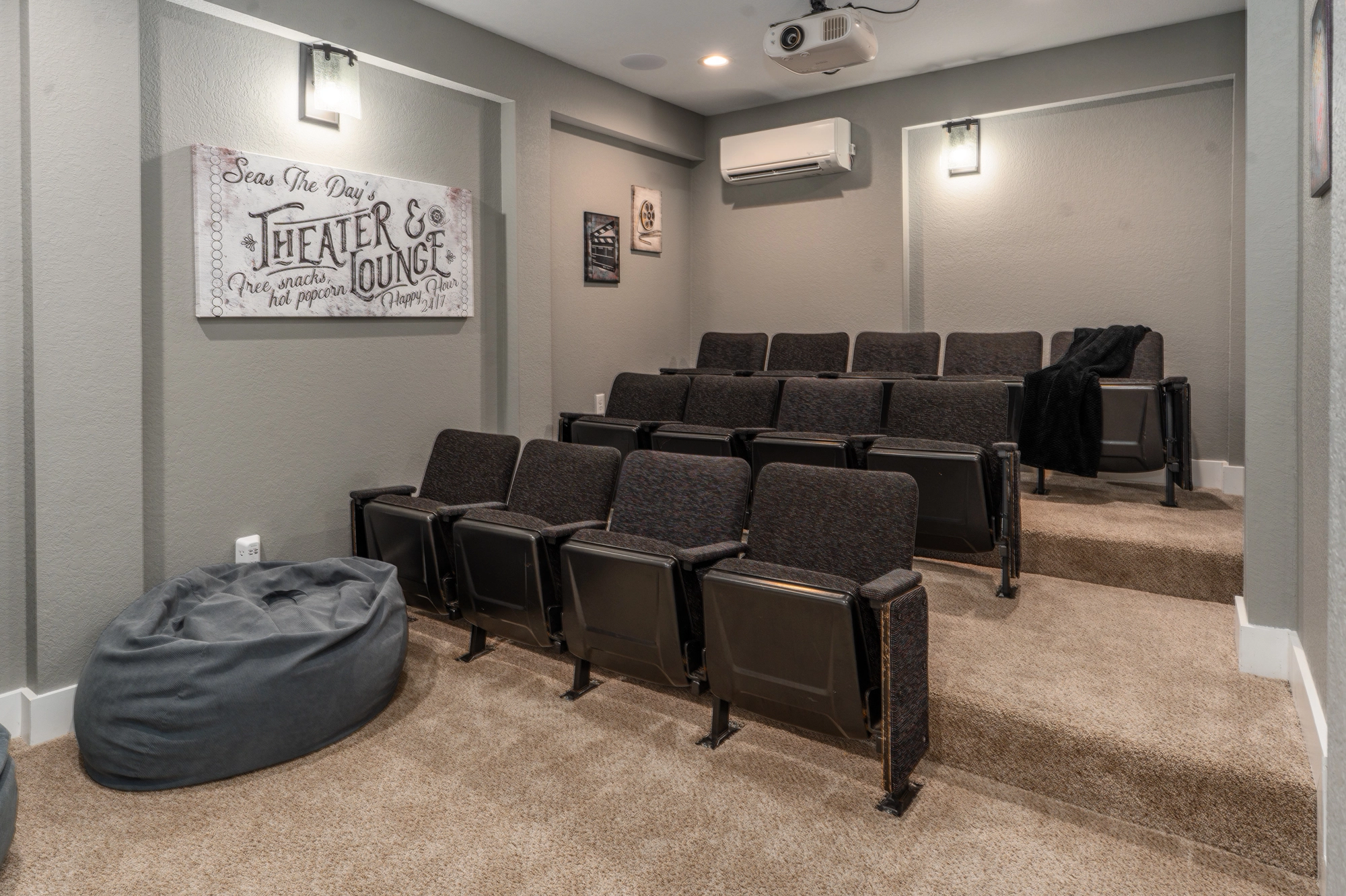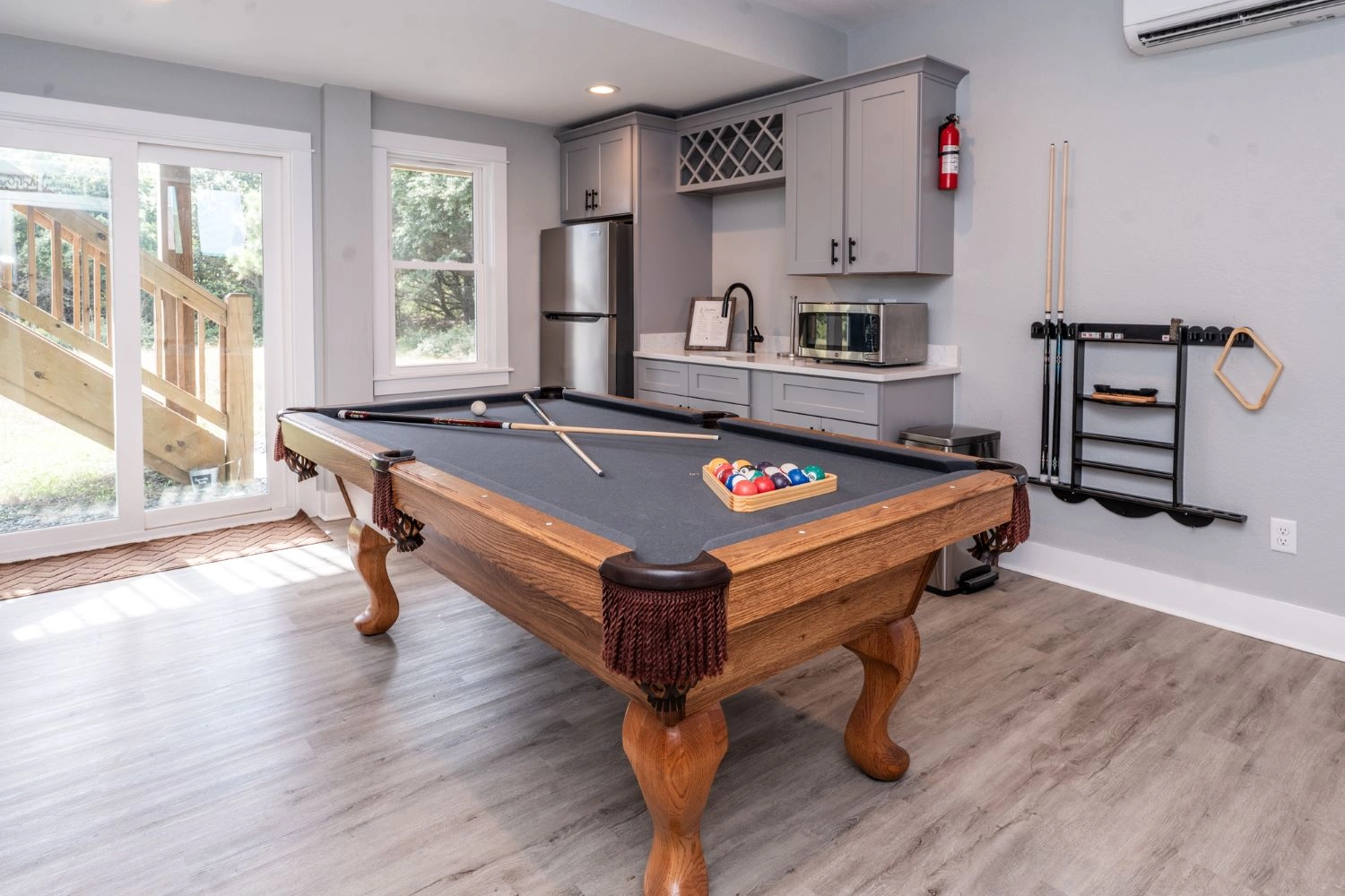 Theater room with surround sound; rec room with pool table and wet bar with refrigerator.