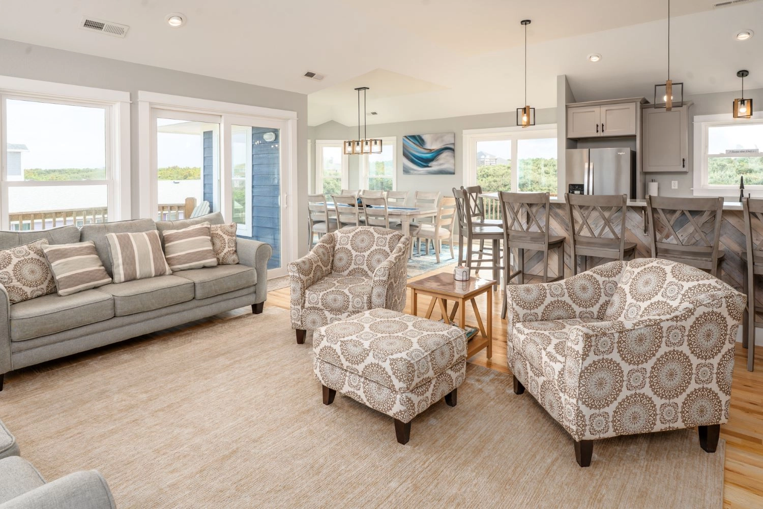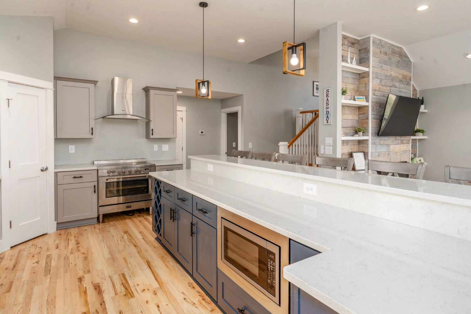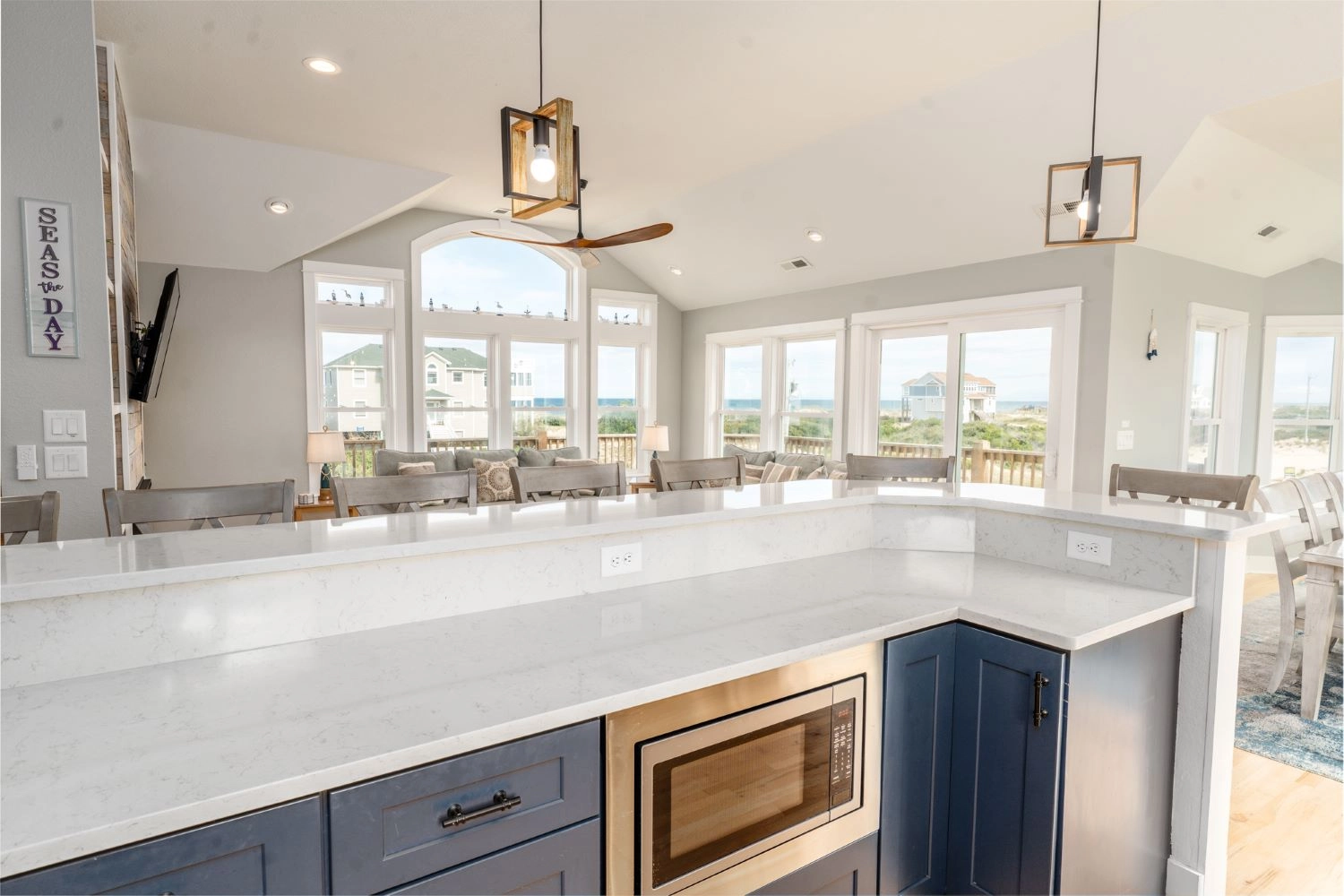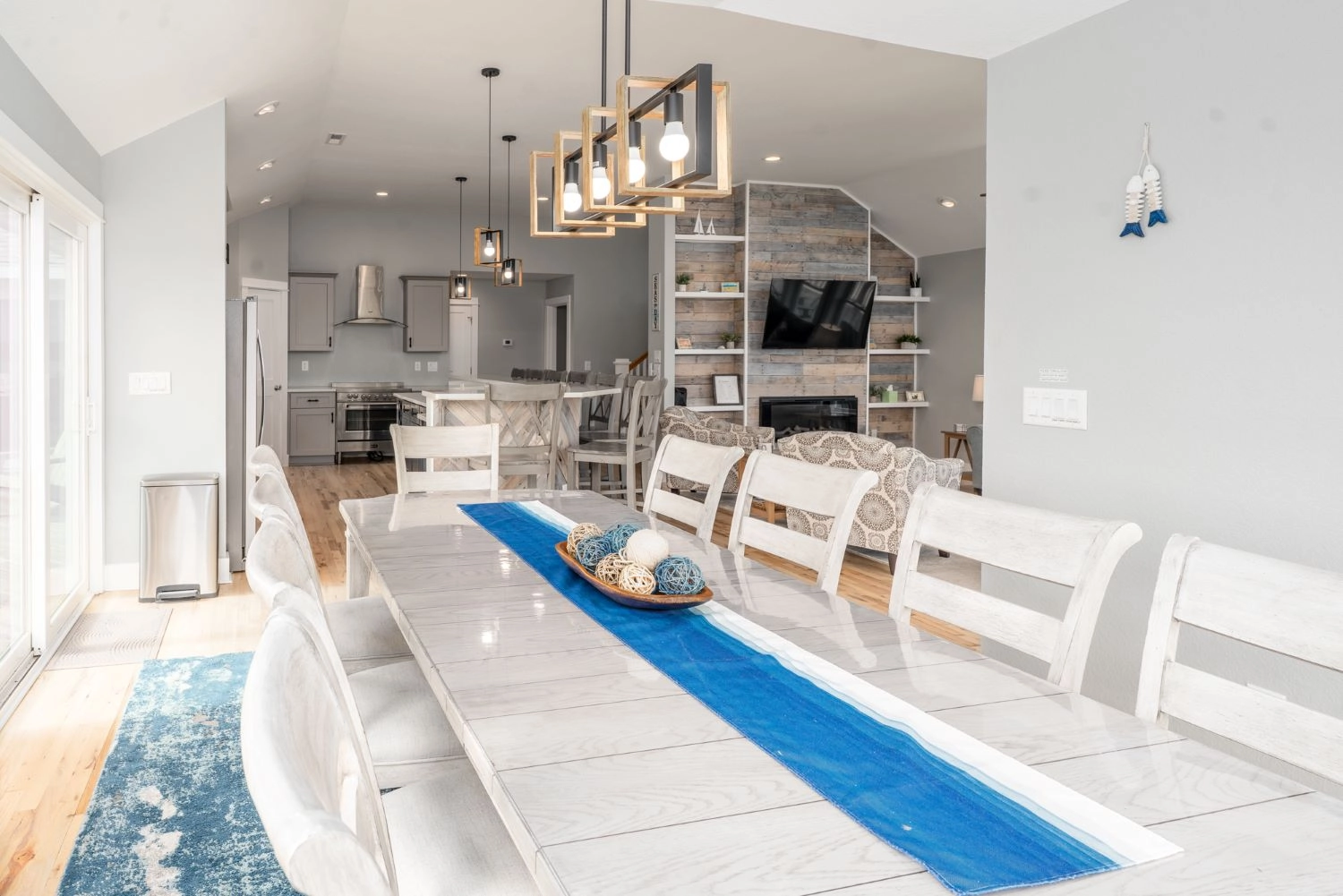Great room with electric fireplace; kitchen with two dishwashers; dining area.