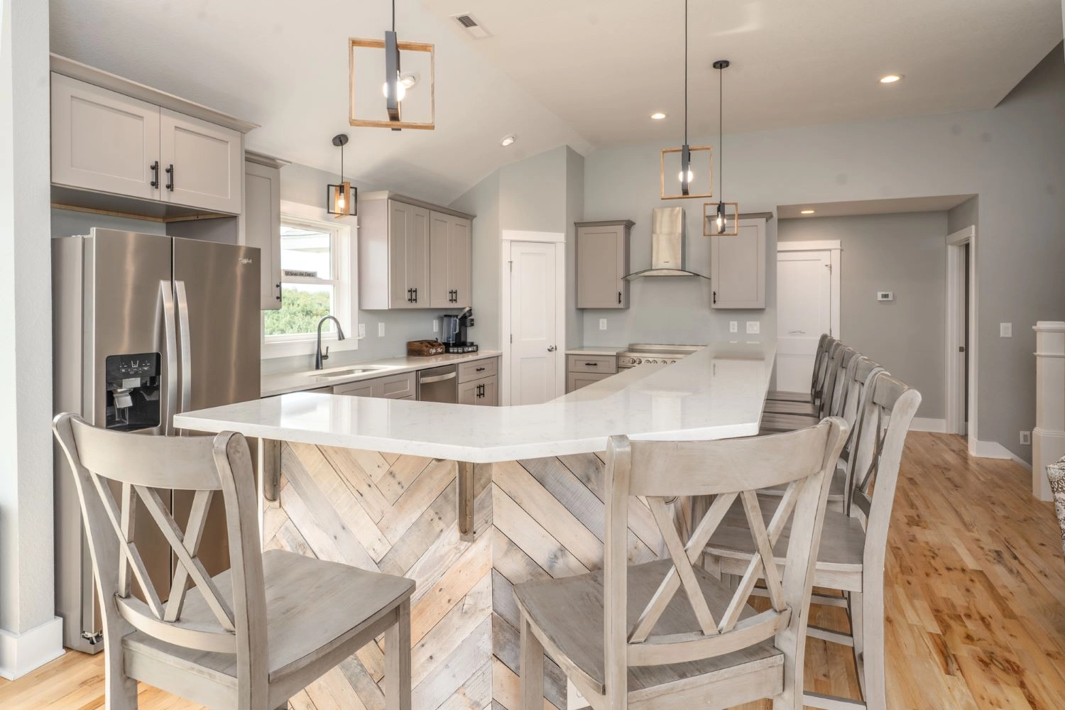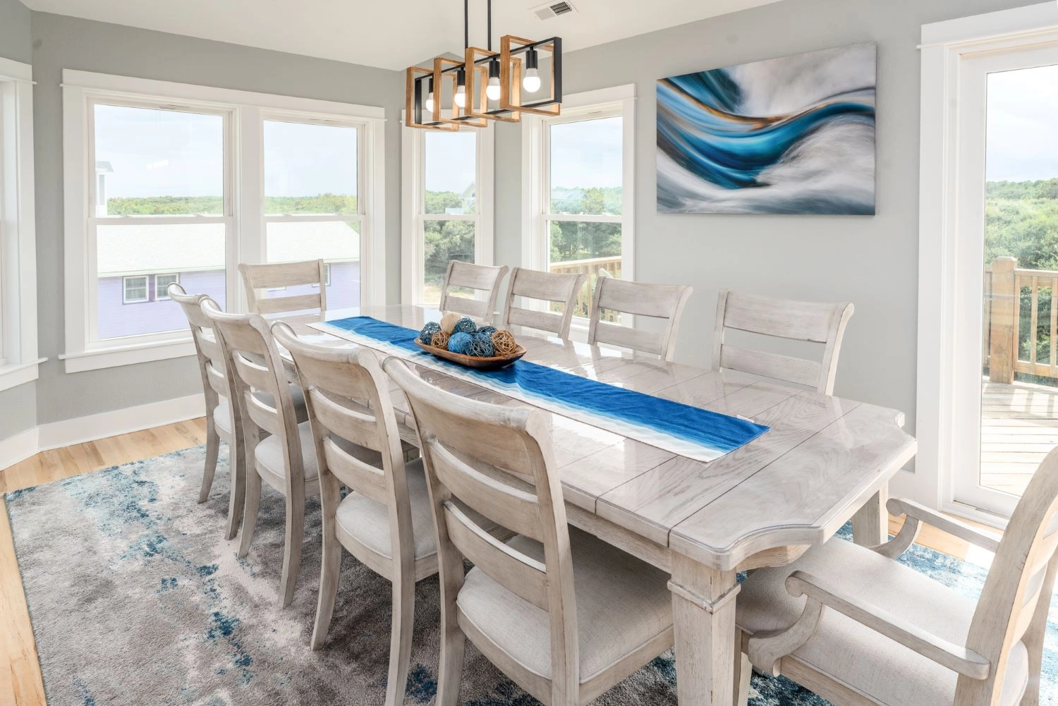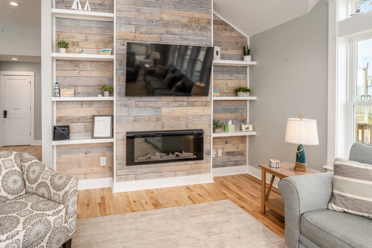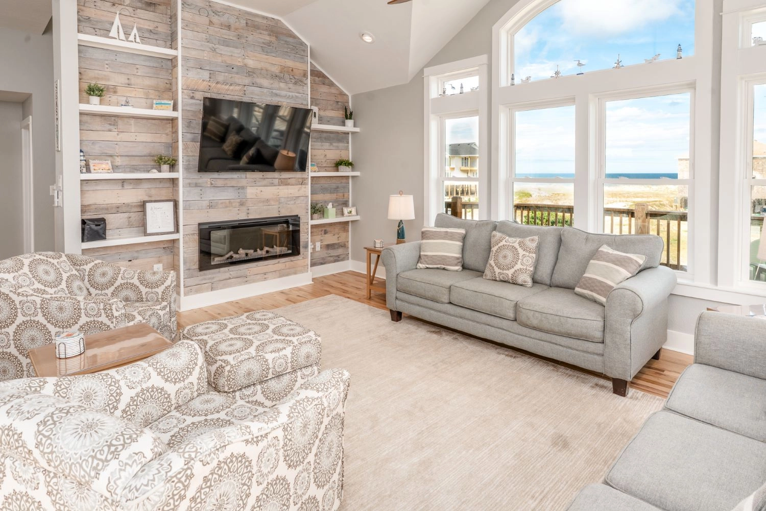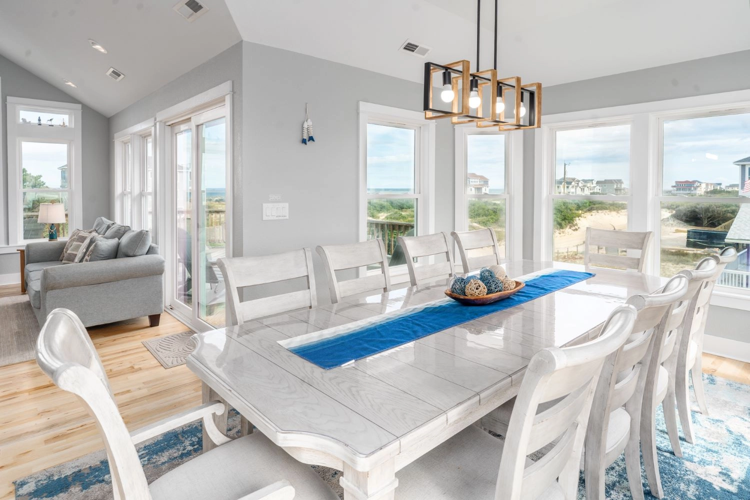 Great room with electric fireplace; kitchen with two dishwashers; dining area.